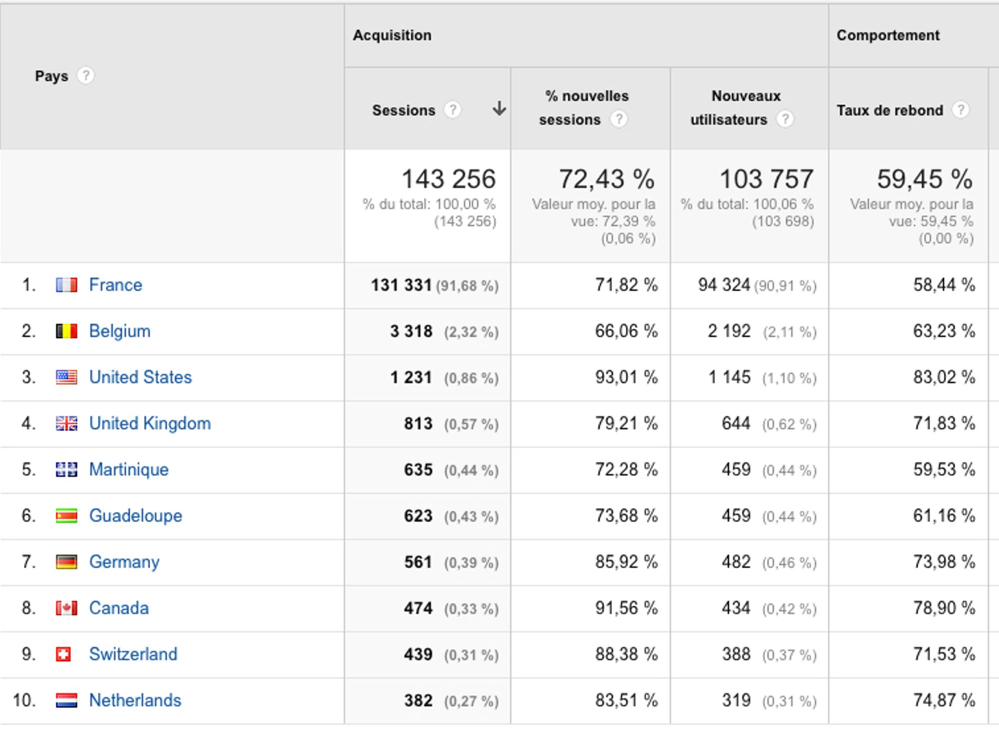 Un tableau donne une idée de la fréquentation par pays, entre le 1er janvier et le 19 décembre 2014. Bien sûr la France et la Belgique sont aux deux premiers rangs, mais d'autres pays consultent la base.