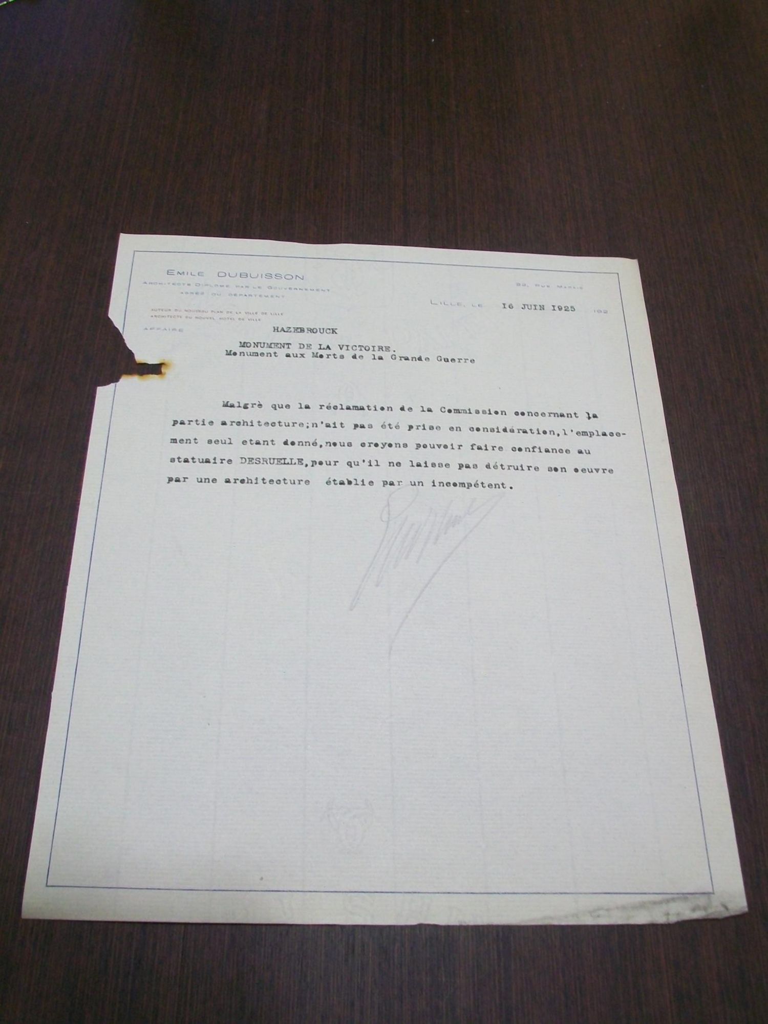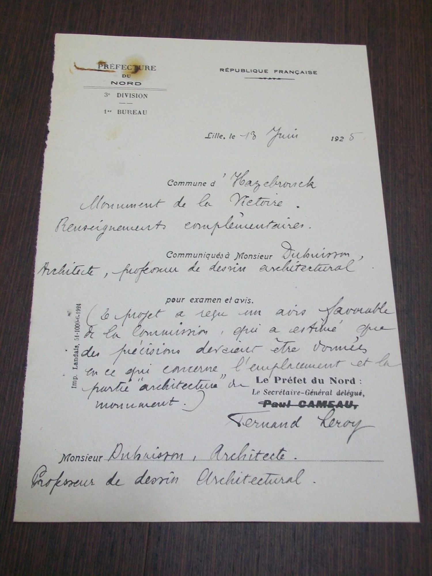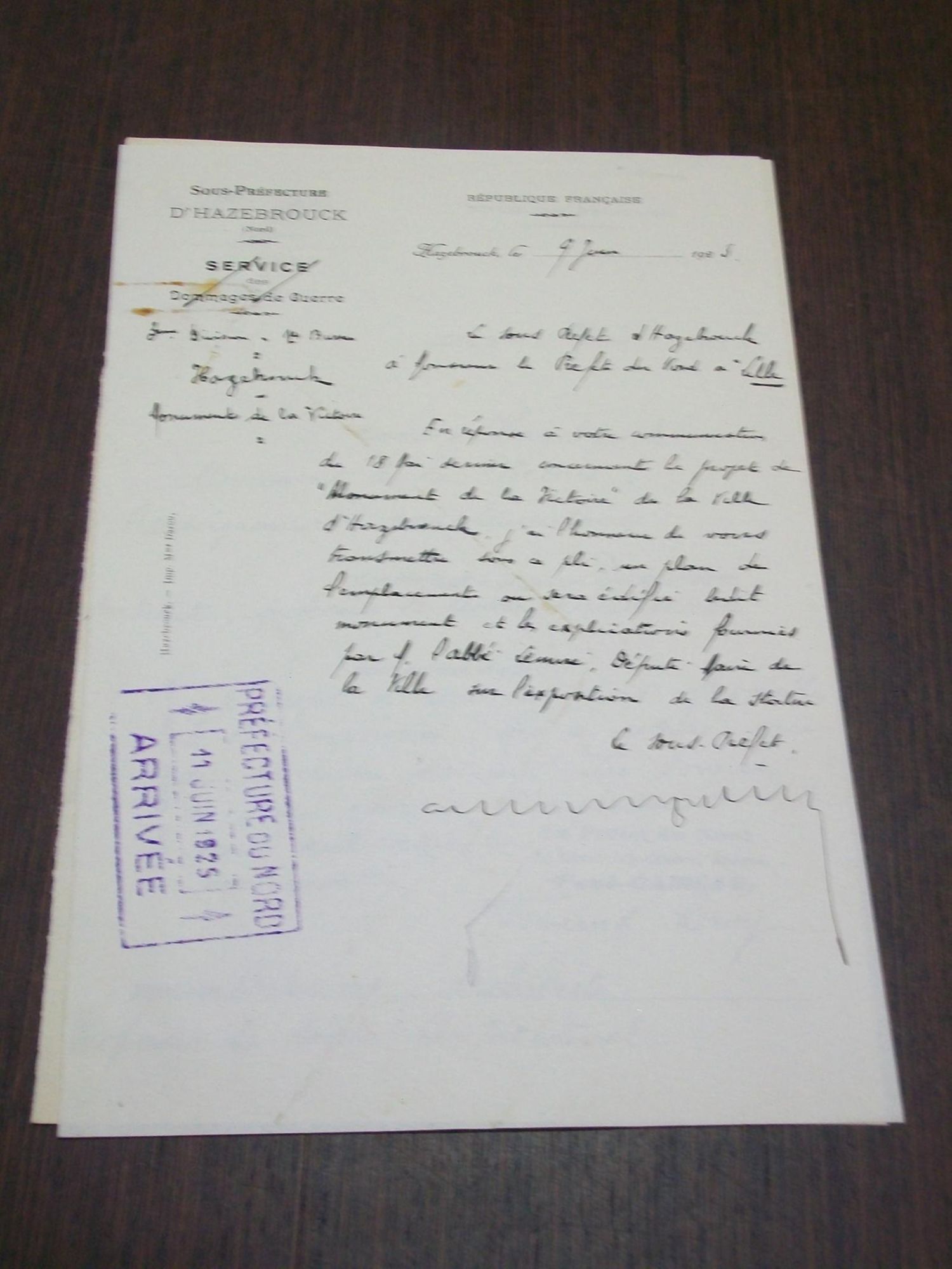 "Je serai obligé à Monsieur le Sous-Préfet d'Hazebrouck de vouloir bien inviter M. le Maire d'Hazebrouck à produire les dessins ou photographies de la maquette du monument dont il s'agit."