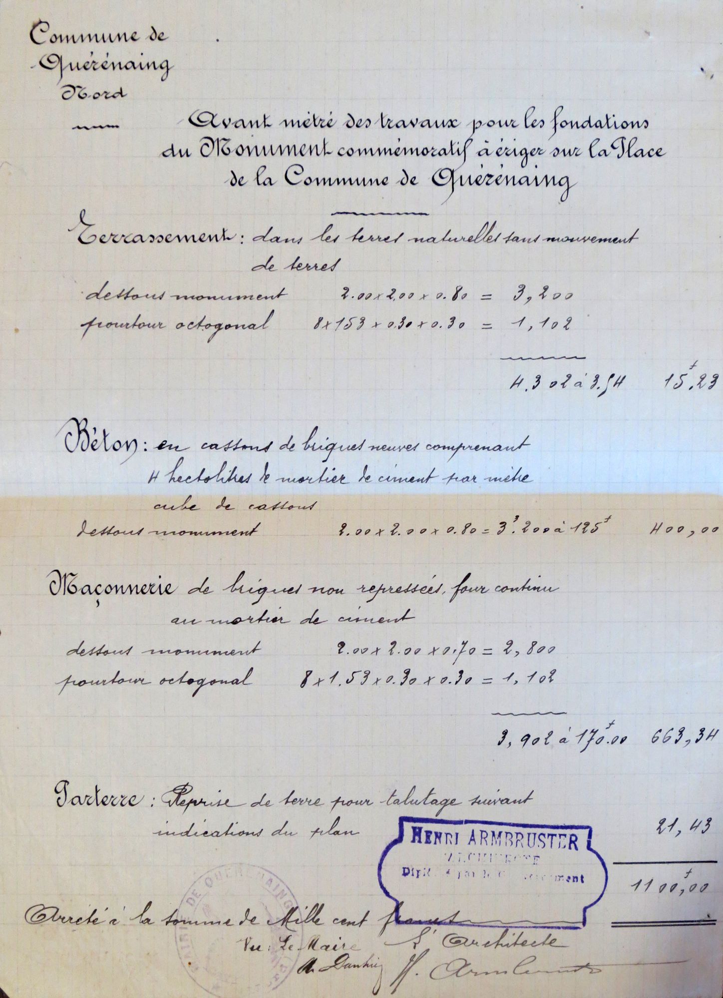 Il s'engage à faire exécuter les fondations du monument commémoratif suivant les indications du plan, ci joint, dressé par Monsieur Henri ARMBRUSTER architecte à Valenciennes