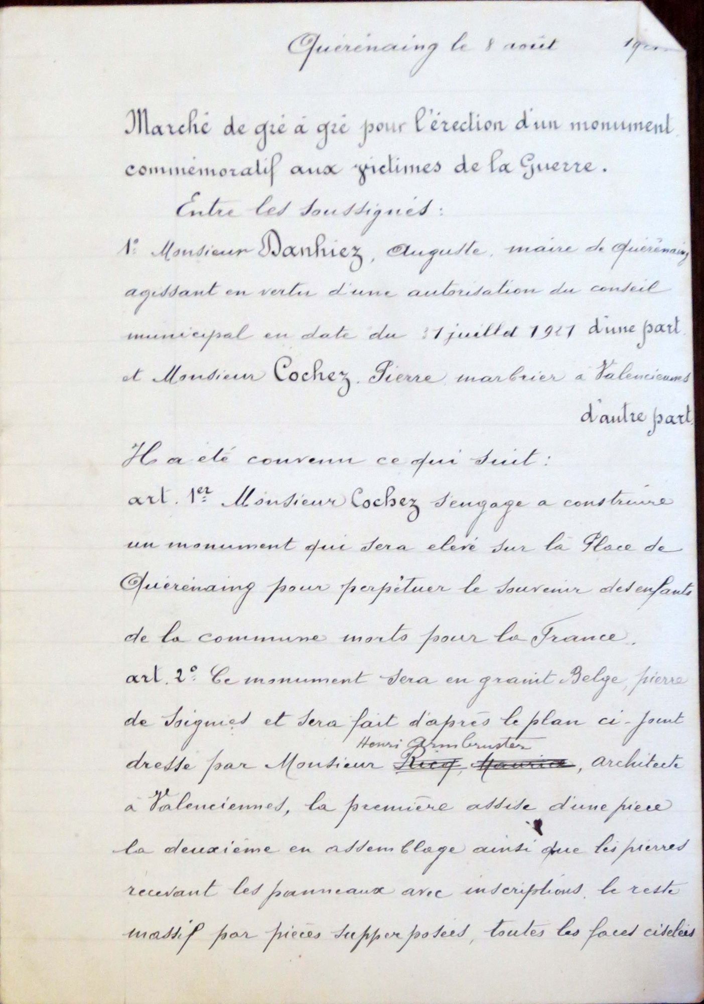Entre Monsieur Danhiez Auguste Maire et Monsieur COCHEZ Pierre marbrier à Valenciennes