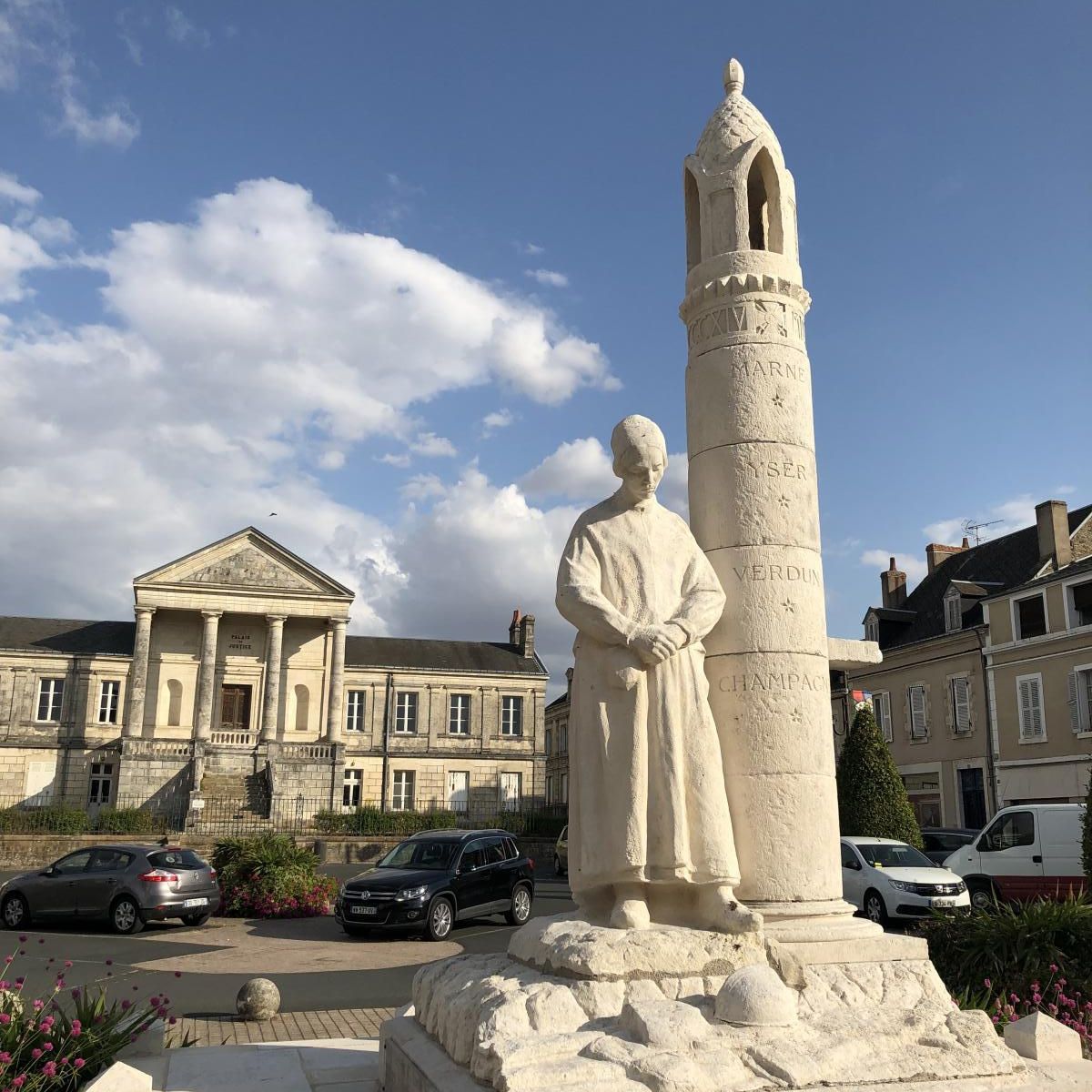 « Le monument aux morts de la guerre - Le comité chargé de préparer l’érection de ce monument, s’est réuni à la mairie de la Châtre le 28 avril et a adopté définitivement la maquette de notre célèbre compatriote  le sculpteur Nivet. Une Berrichonne, en costume du pays, debout devant les dépouilles du soldat héroïquement tombé, portant, sur son visage admirablement expressif, la douleur causé par les ruines de la plus terrible guerre en même temps que la fierté et l’espérance que donne la Victoire ; telle est la conception de l’artiste.