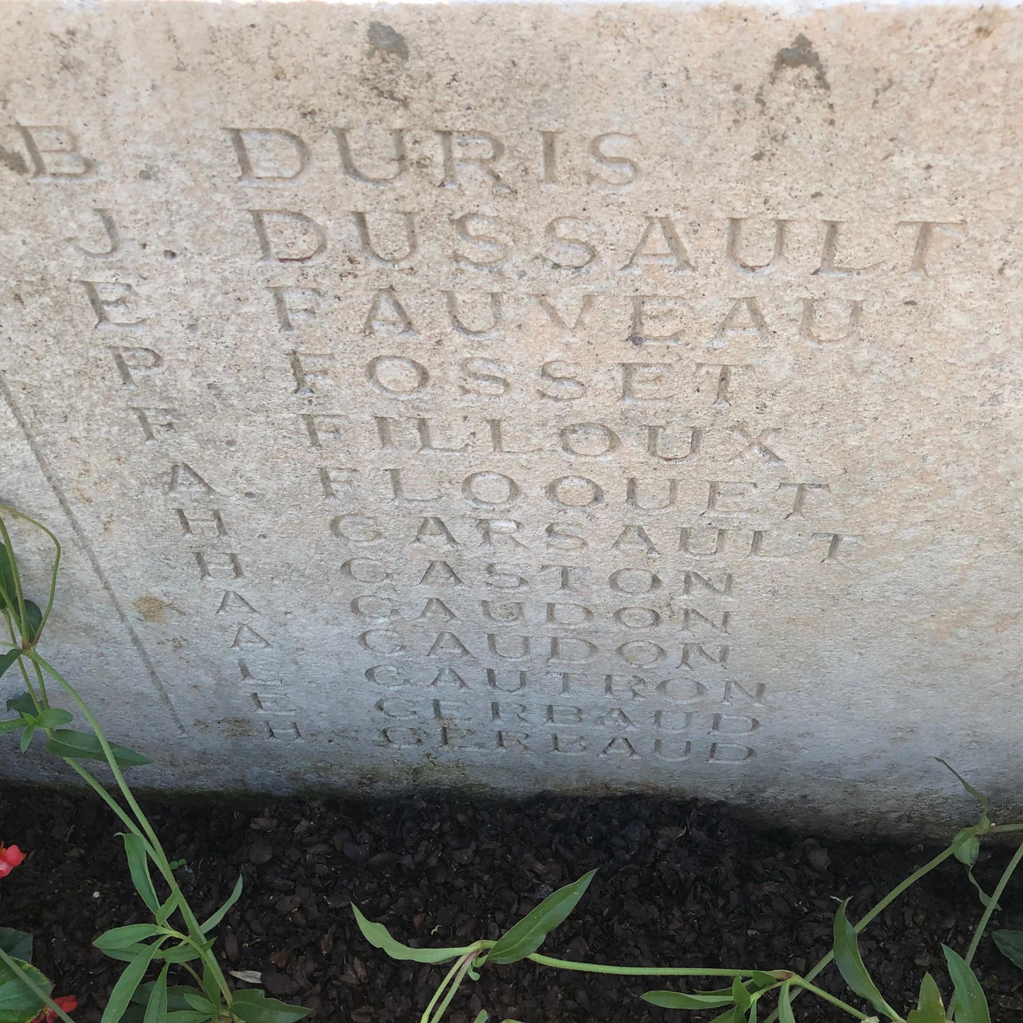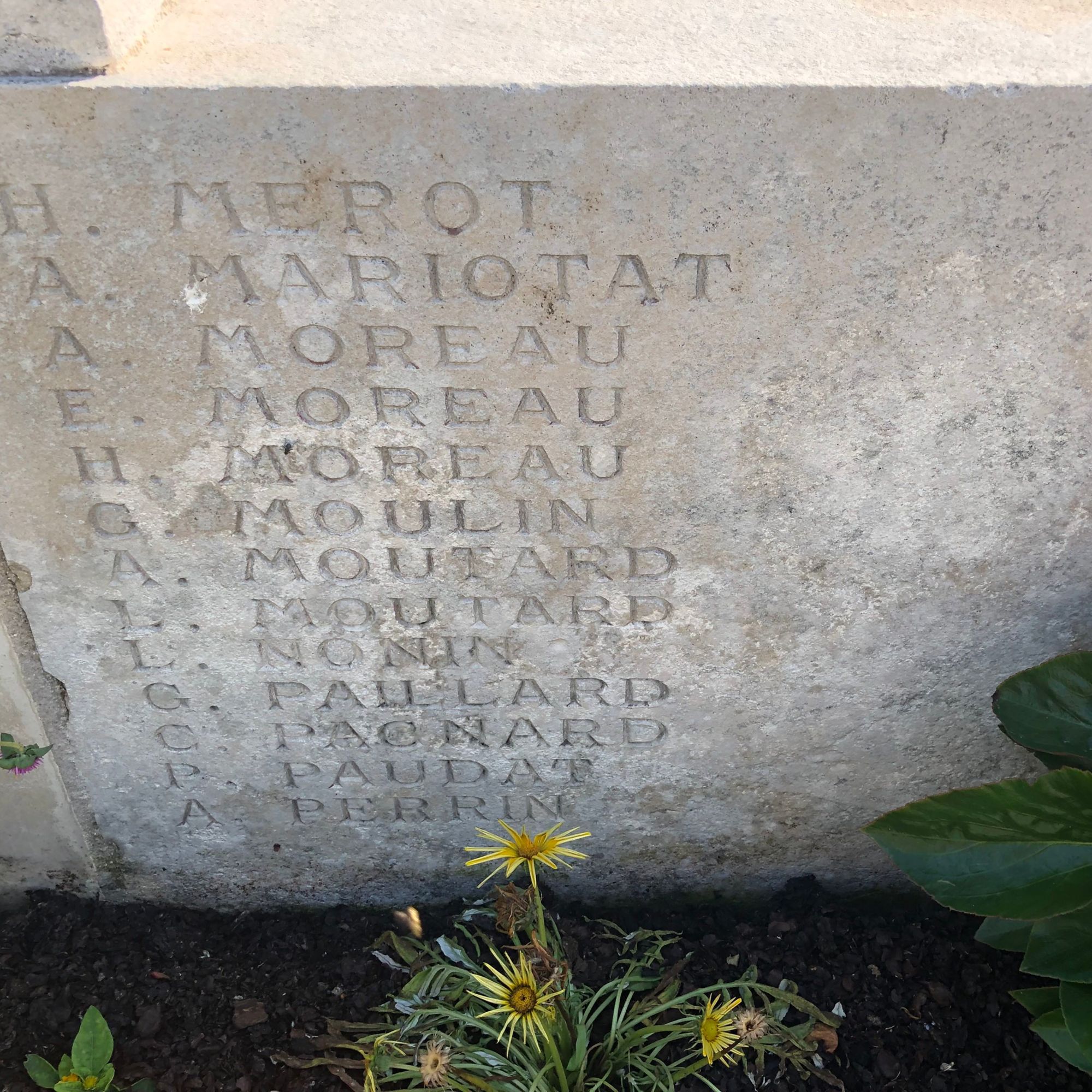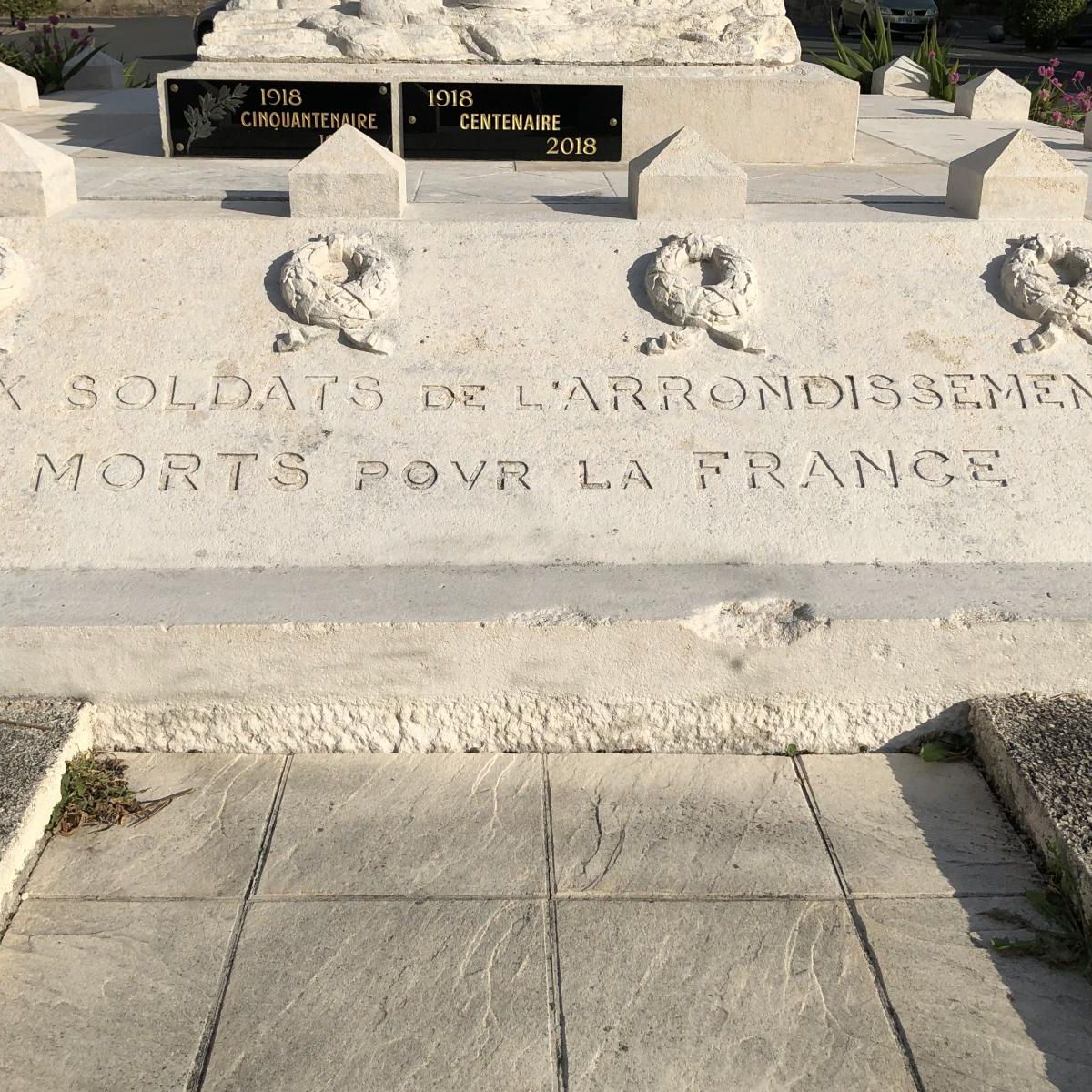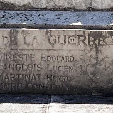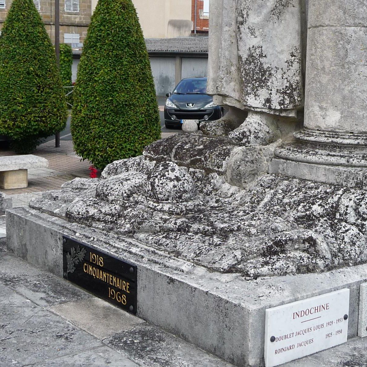 Sur le pourtour du socle du Monument se trouvent inscrits les noms des Morts pour la France de la commune, et, gravures peu rencontrées, les noms des communes de l'arrondissement avec, pour chacune, le nombre de Morts