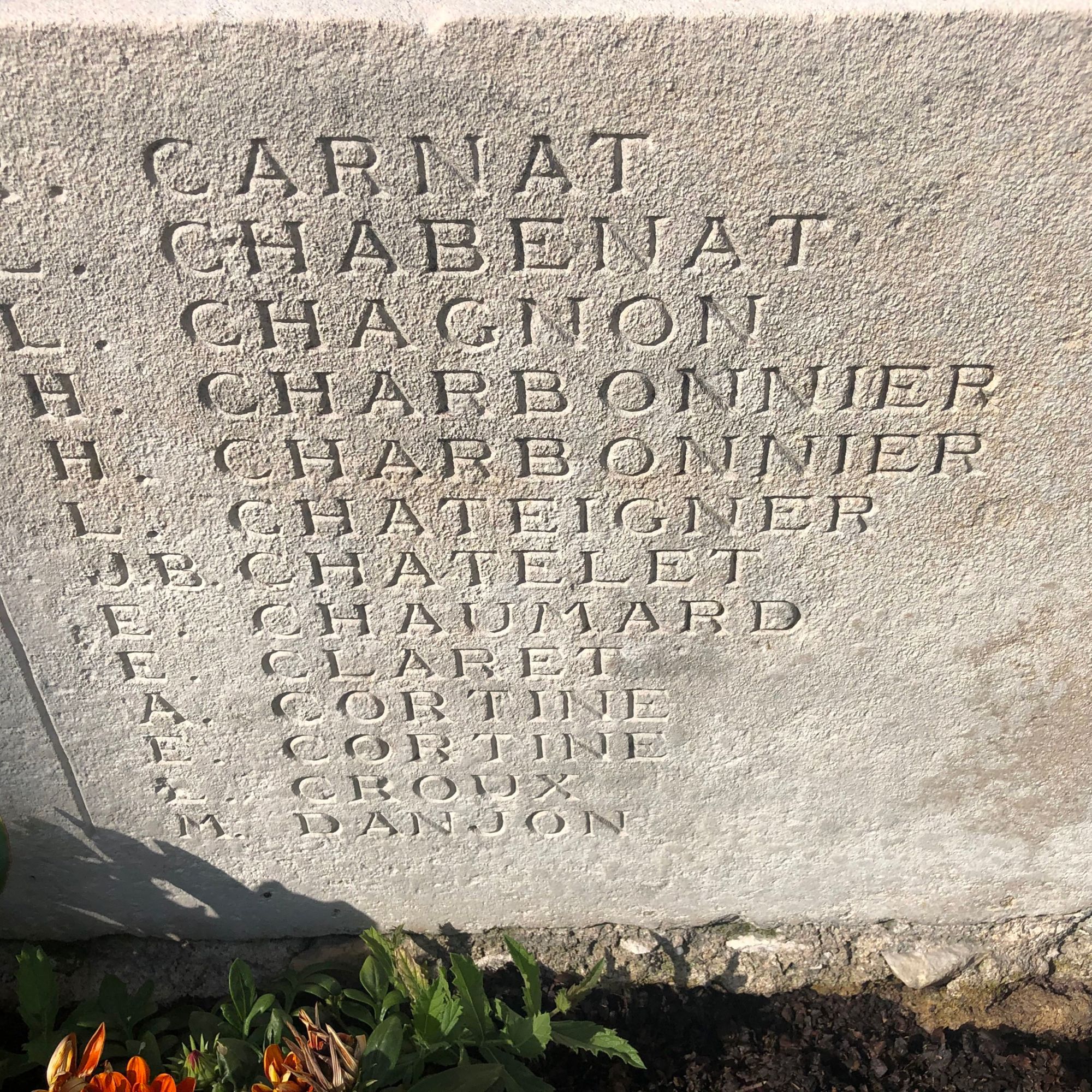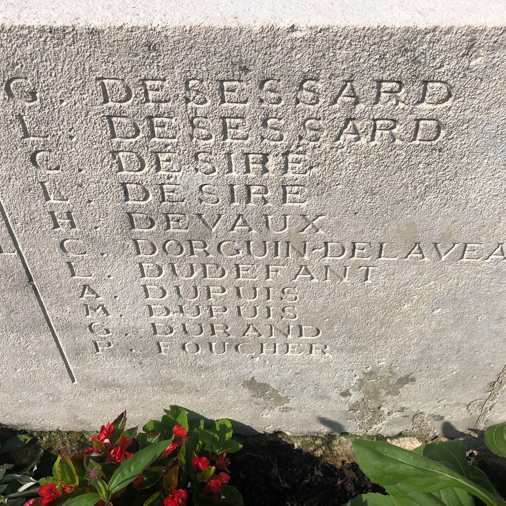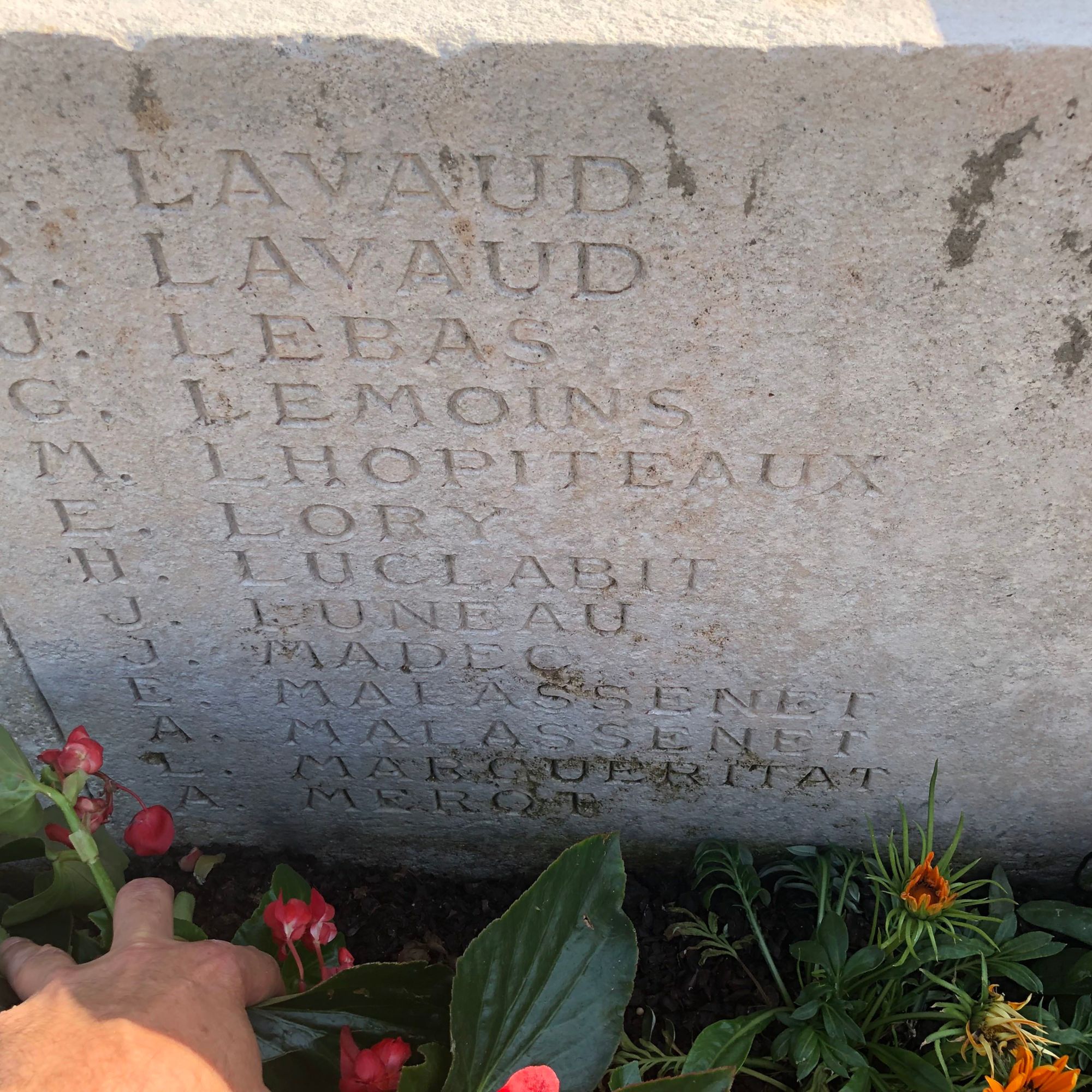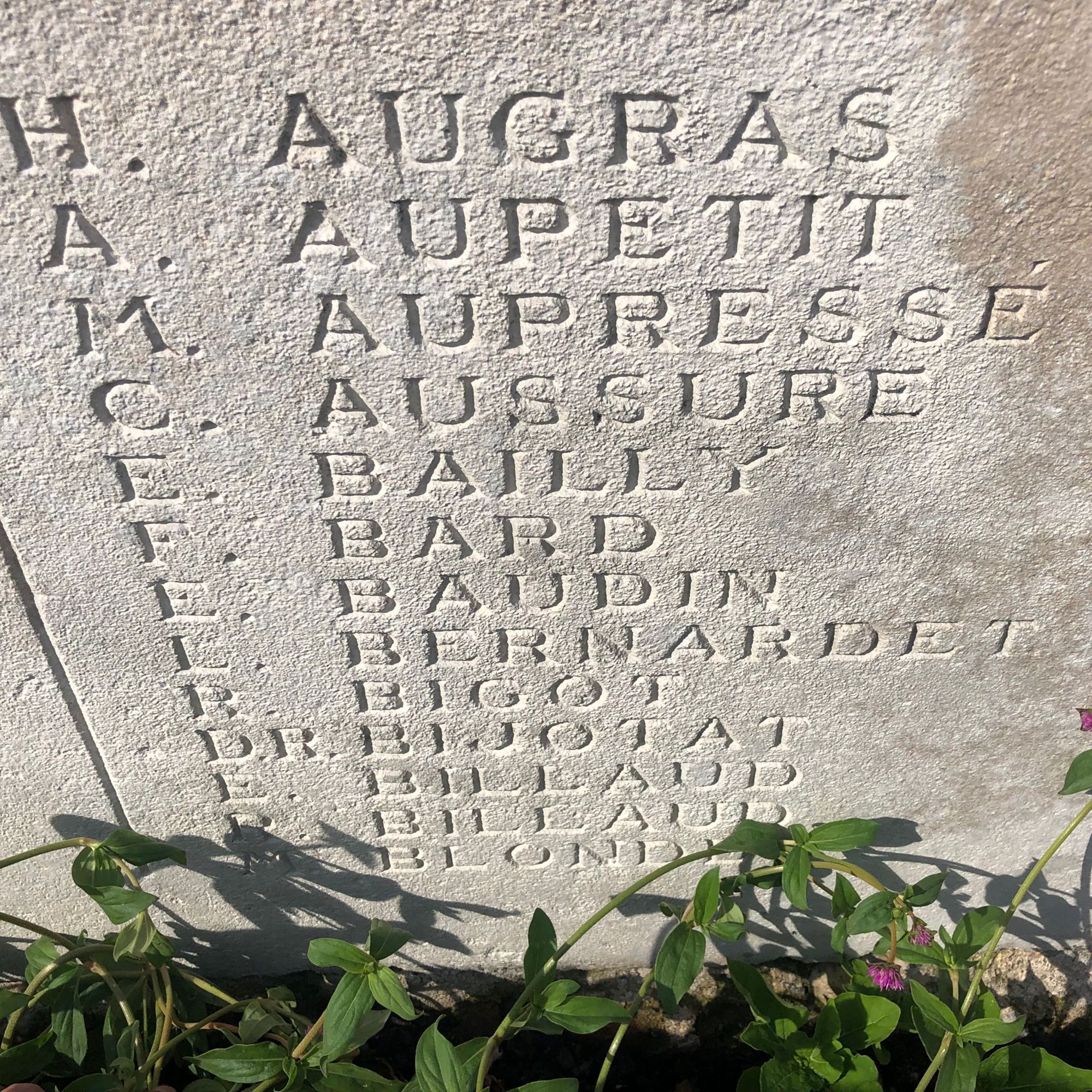 Sur le pourtour du socle du Monument se trouvent inscrits les noms des Morts pour la France de la commune, et, gravures peu rencontrées, les noms des communes de l'arrondissement avec, pour chacune, le nombre de Morts