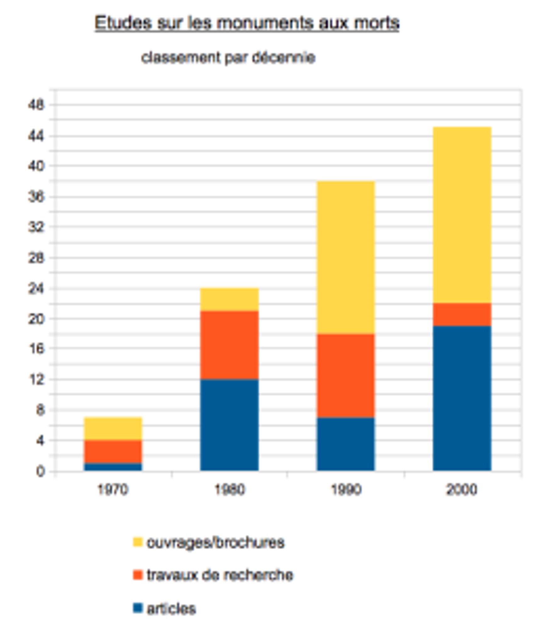 Les monuments aux morts sont entrés dans le champ des historiens à la veille du soixantième anniversaire de l'armistice. En 1977 Antoine Prost publie sa thèse sur Les Anciens Combattants et la société française (1914-1939) aux Presses de la FNSP ; simultanément il en décline une version grand public dans la collection « Archives » Gallimard-Julliard. Ainsi sont posés les jalons d'une une curiosité en même temps qu'une méthodologie sur le sujet qui trouve sa place dans Les lieux de mémoire de Pierre Nora en 1984. Les études se multiplient dans les années 1980 et 1990. De nombreux travaux universitaires – maîtrises ou thèse – se consacrent à des corpus départementaux. Ils contribuent à enrichir l'inventaire et la connaissance de ces vestiges d'un passé encore proche. Annette Becker en 1988 s'affranchit de cette lecture en s'intéressant dans un beau livre des éditions Errance à la statuaire. Ainsi s'affirme une dimension plus sensible, esthétisante et émotionnelle de ces édifices. La même année, dans un article de la revue RAMAGE, l'archéologue Pierre-Yves Balut tente d'apporter sa contribution à une méthodologie scientifique de l'étude des monuments aux morts, sans grand succès auprès des historiens du contemporain. Toujours est-il que le quatre-vingtième anniversaire de l'armistice suscite une profusion de publications avec désormais quelques travaux monographiques sur le monument d'une commune.