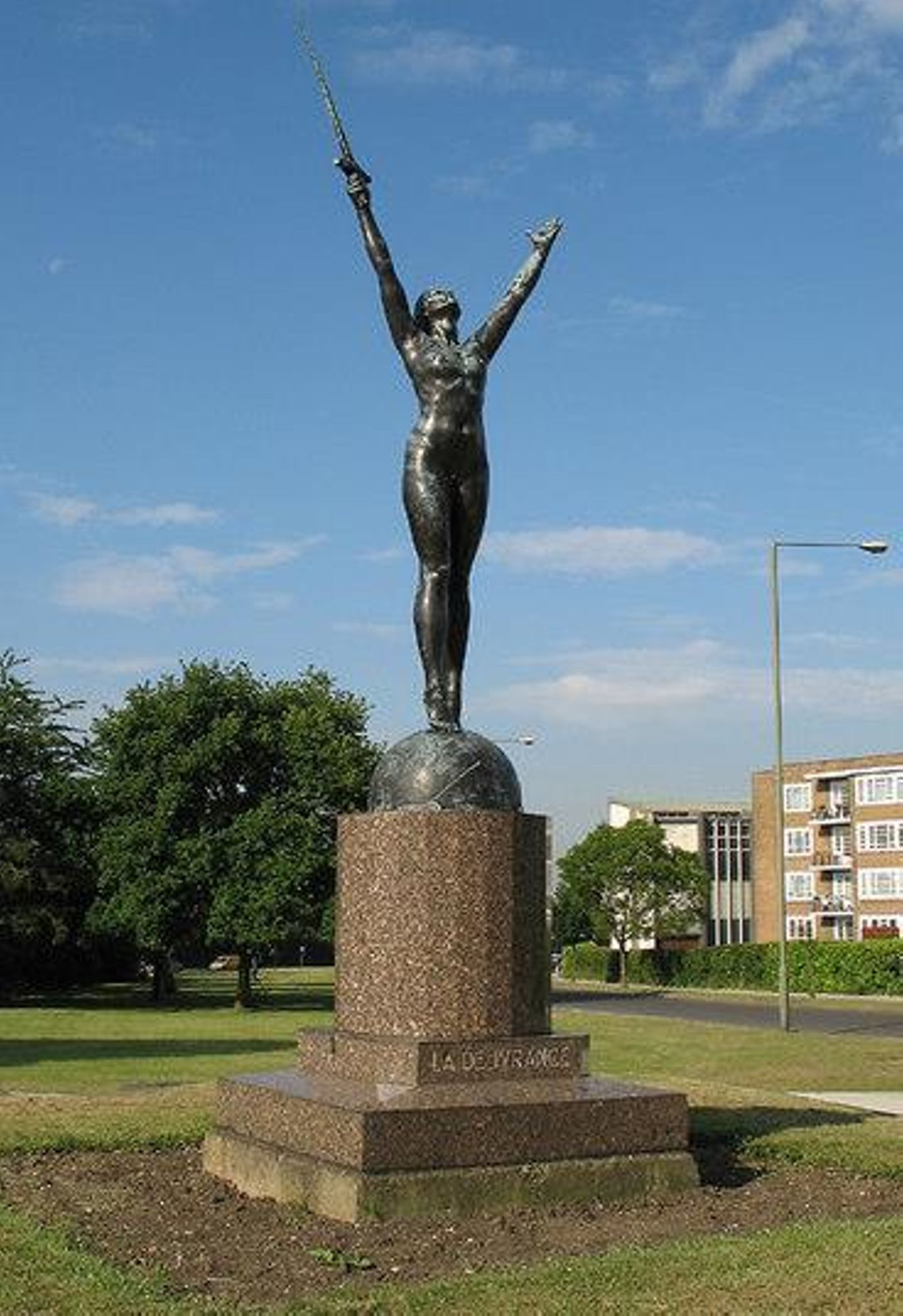L’oeuvre représente une belle jeune femme, entièrement nue, se tenant sur la pointe des pieds, tête et bras levés vers le ciel. Ses bras forment une sorte de V de la victoire et sa main droite tient une épée. La jeune femme semble remercier le Ciel et l’épée rappelle qu’il a fallu se battre pour obtenir la Victoire et la Délivrance.