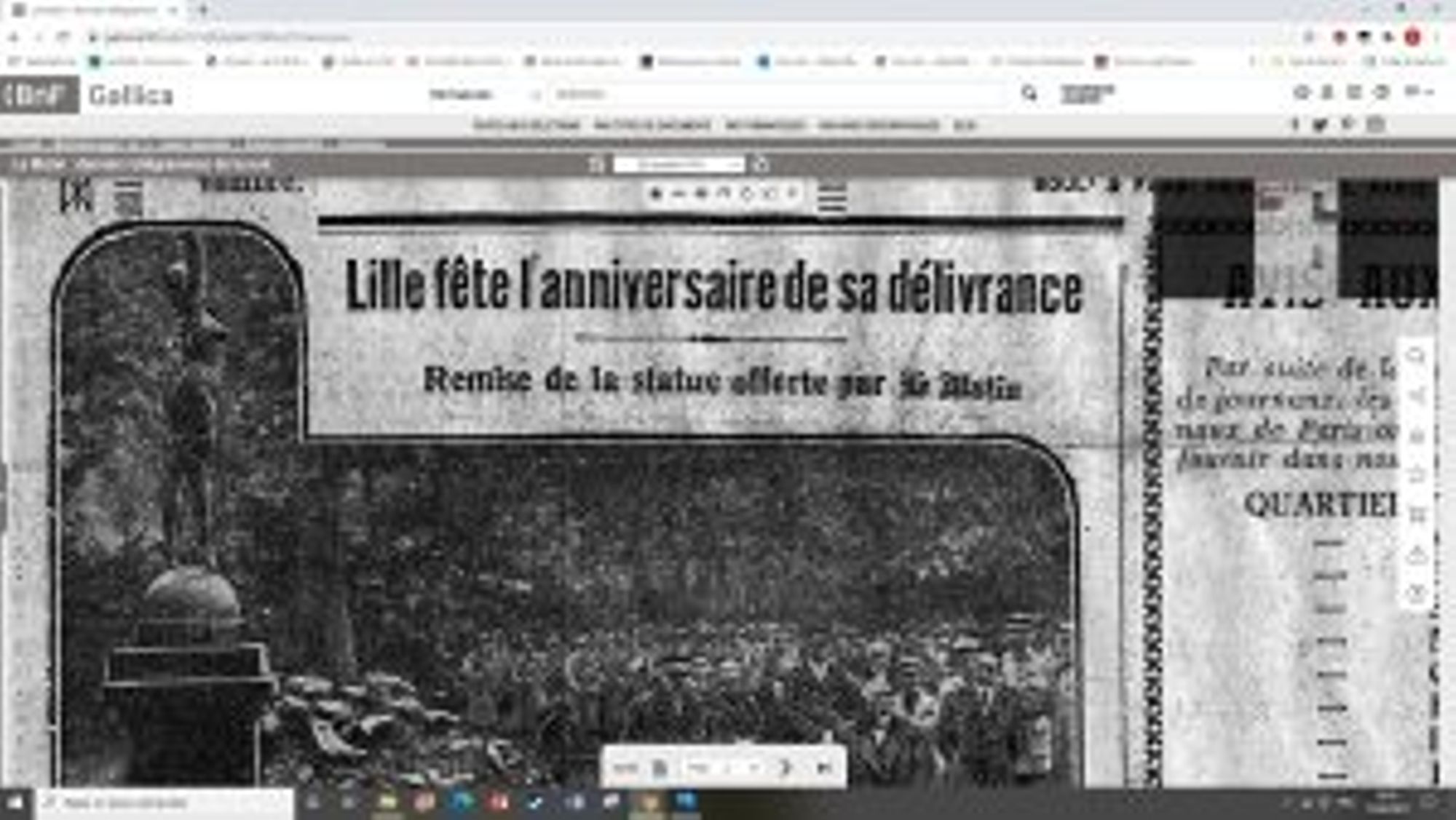 «Lille a fêté, aujourd’hui, dignement mais joyeusement le 1er anniversaire de sa délivrance. (Commencée la veille), la célébration a continué ce matin, sous les rayons d’un doux soleil d’automne, par une cérémonie émouvante dans sa simplicité qui s’est déroulée dans les jardins de Vauban, à l’occasion de l’inauguration de la statue de la Délivrance offerte par le Matin.