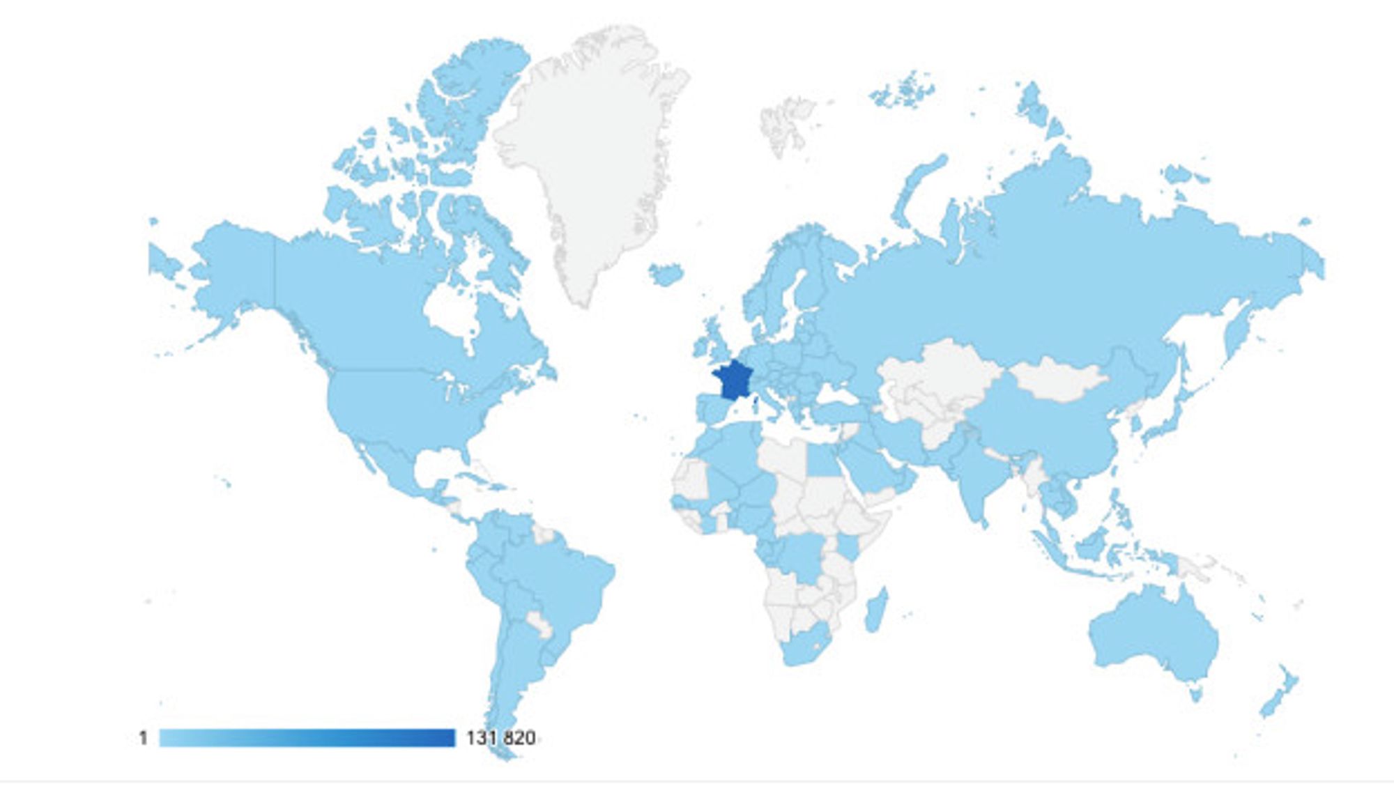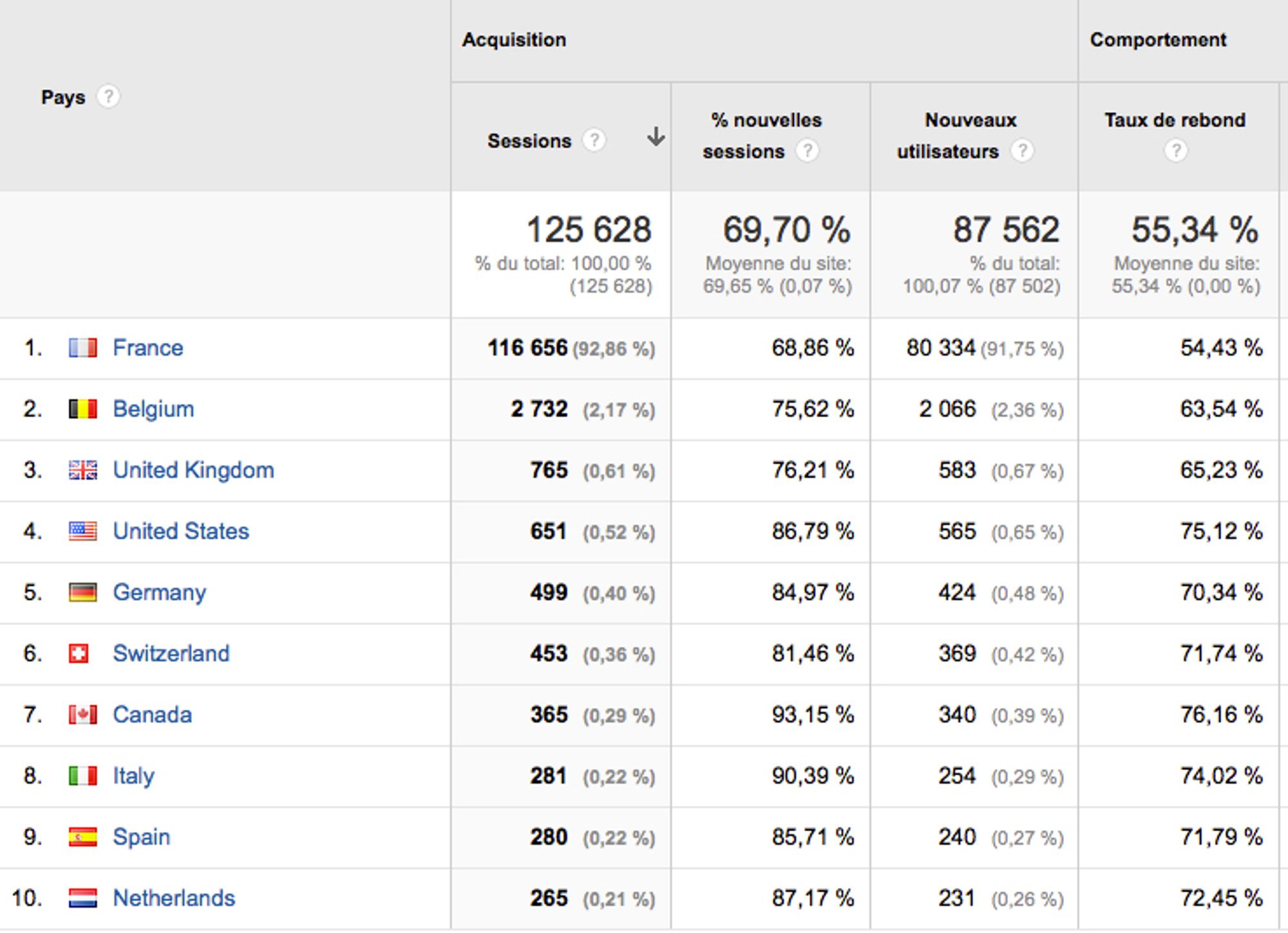Un tableau donne une idée de la fréquentation par pays, entre le 1er janvier et le 19 décembre 2014. Bien sûr la France et la Belgique sont aux deux premiers rangs, mais d'autres pays consultent la base.