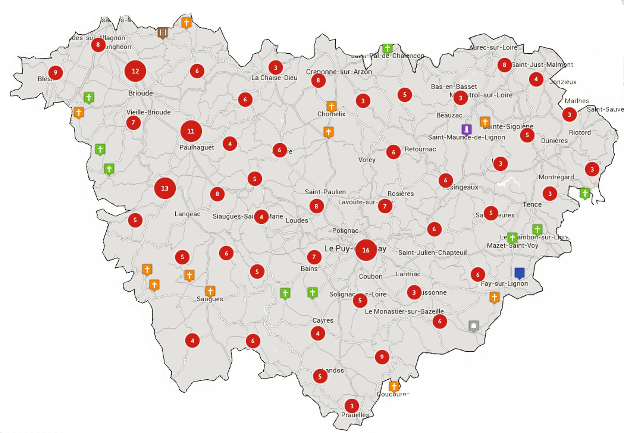 - la Haute-Loire où le travail d'Henri Chanal a permis de couvrir pratiquement tous les monuments des communes actuelles, et des communes anciennes rattachées aujourd'hui à une commune (260 communes enregistrées à l'INSEE, 306 fiches de monuments)