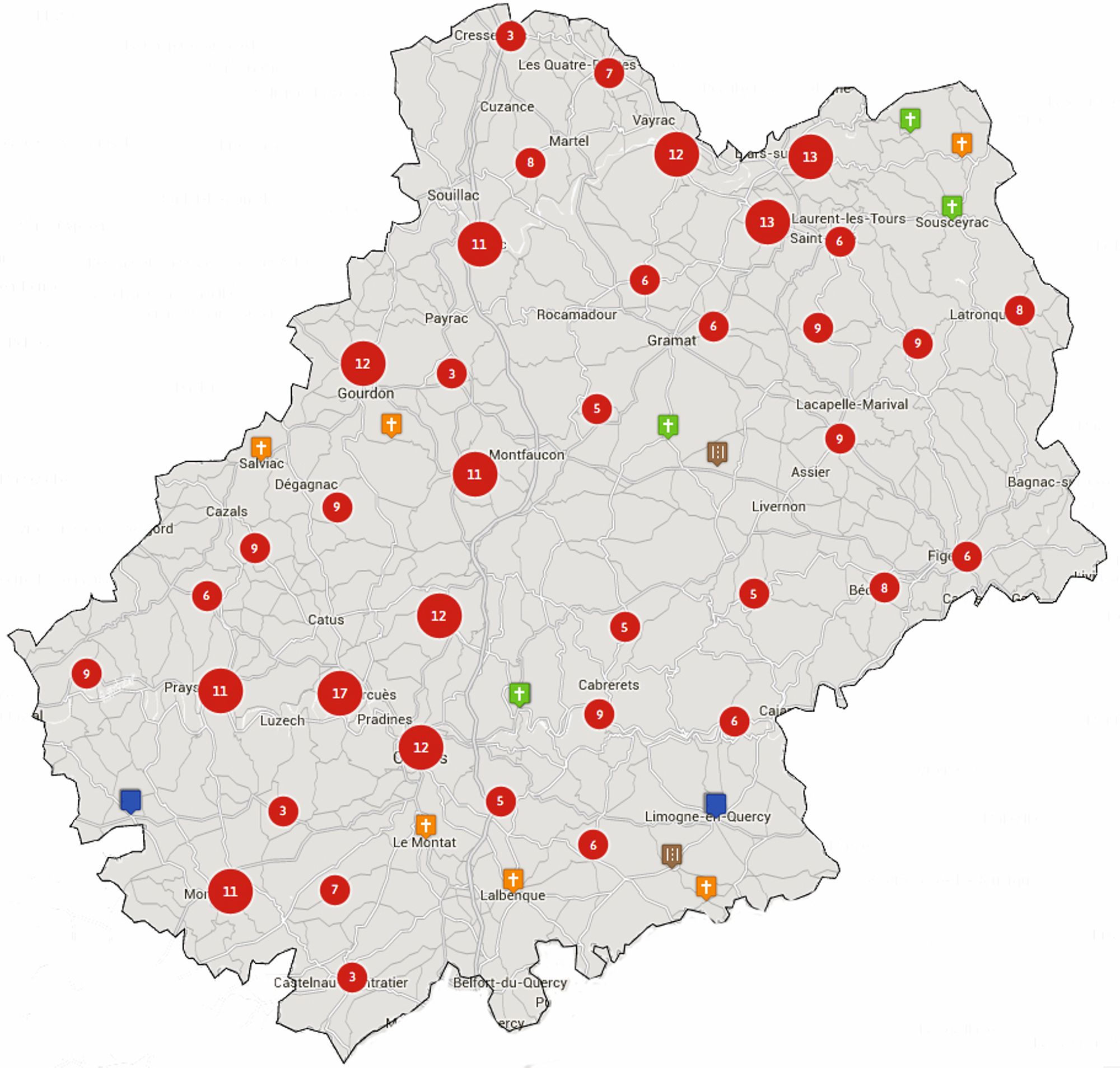 le Lot. Le travail de Nelly Blaya, photographe au Conseil général a contribué à une très bonne couverture du département. Le lancement du site 14-18 Le Lot permettra certainement d'enrichir et de compléter les lacunes (340 communes enregistrées à l'INSEE, 328 fiches de monuments).