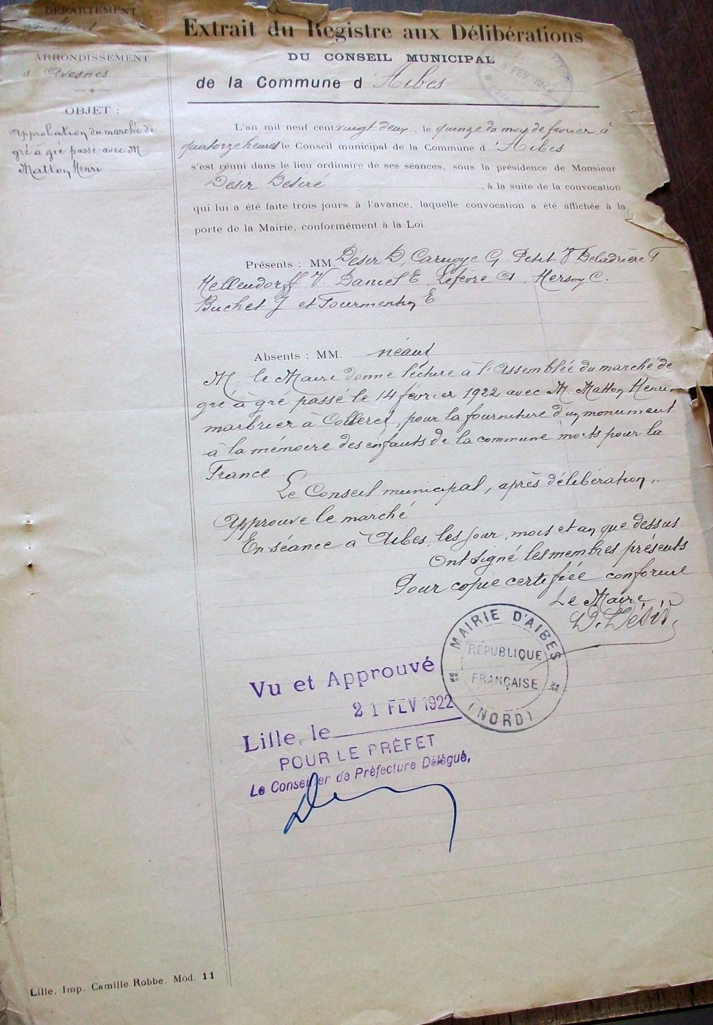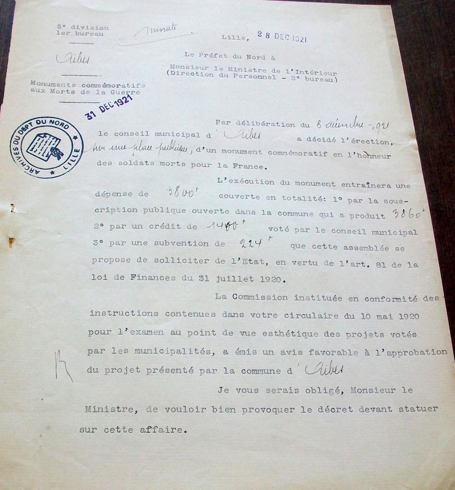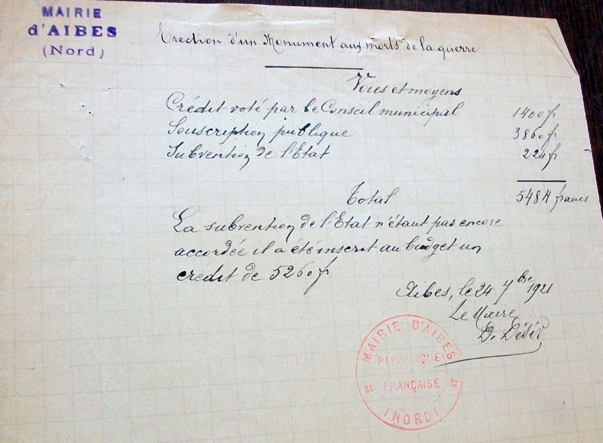 Le Préfet du Nord au Ministre de l'Intérieur Par délibération du 8 décembre 1921 le conseil municipal d'Aibes a décidé l'érection sur une place publique, d'un monument commémoratif en l'honneur des soldats morts pour la France L'exécution du monument entraînera une dépense de 3800 F couverte en totalité : 1. par la souscription publique ouverte dans la commune et qui a produit 3860 F 2. par un crédit de 1400 F voté par le conseil municipal 3. par une subvention de 224 F que cette assemblée se propose de solliciter de l'État, en vertu... La Commission instituée en conformité des instructions... a émis un avis favorable à l'approbation du projet présenté par la commune d'Aibes. ...