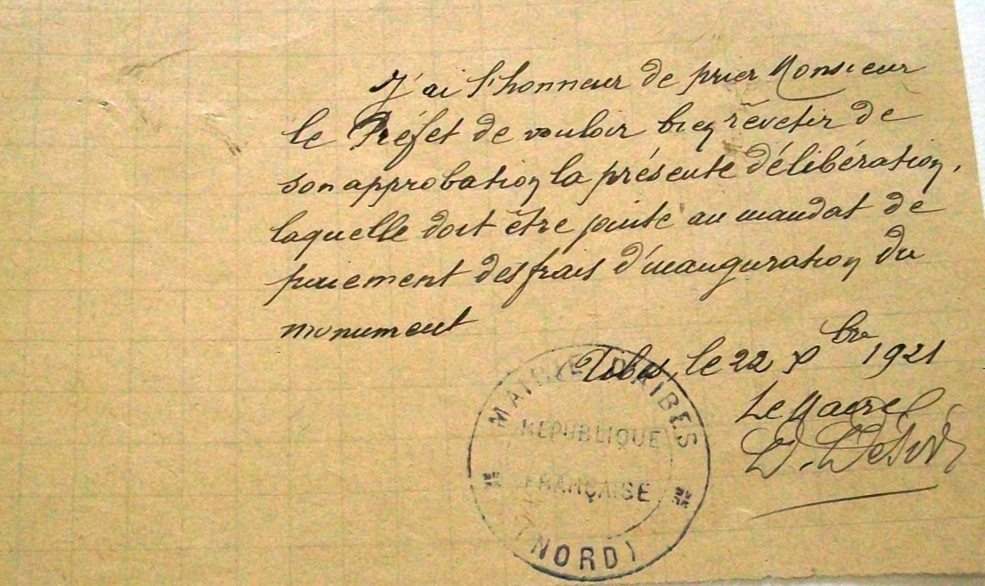 J'ai l'honneur de prier Monsieur le Préfet de vouloir bien revêtir de son approbation la présente délibération, laquelle doit être jointe au mandat de paiement des frais d'inauguration du monument