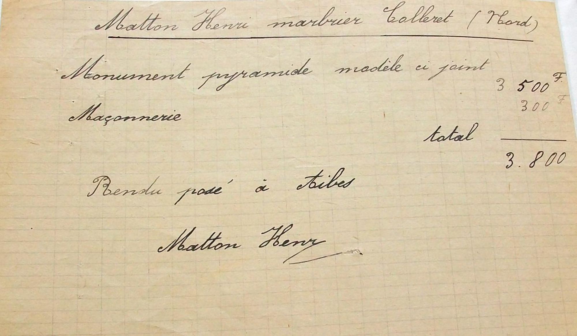 MATTON Henri marbrier à Colleret (Nord) Monument pyramide modèle ci-joint 3500 francs Maçonnerie 300 francs = 3800 francs Rendu posé à AIbes