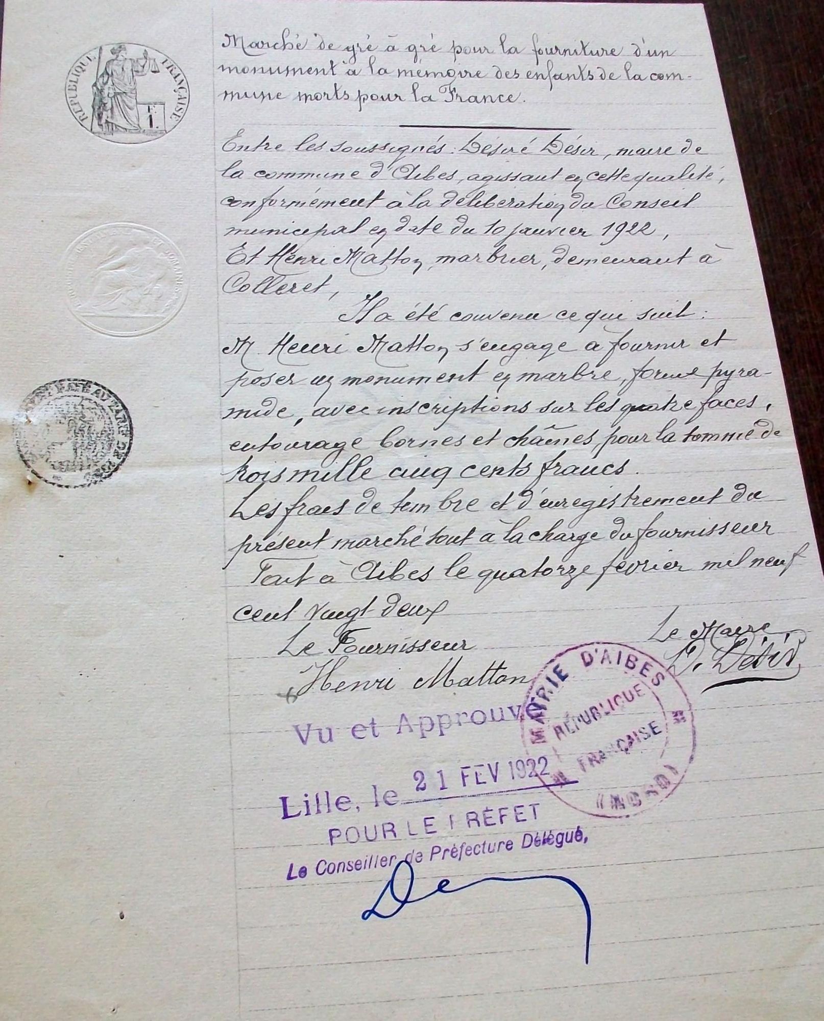 Entre les soussignés Désiré Désir, maire de la commune d'Aibes, et Henri Matton marbrier, demeurant à Colleret Il a été convenu ce qui suit : M. Henri Matton s'engage à fournir et poser un monument en marbre, forme pyramide, avec inscriptions sur les quatre faces, entourage, bornes et chaînes pour la somme de 3500 francs Les frais de timbre et d'enregistrement du présent marché tout à la charge du fournisseur
