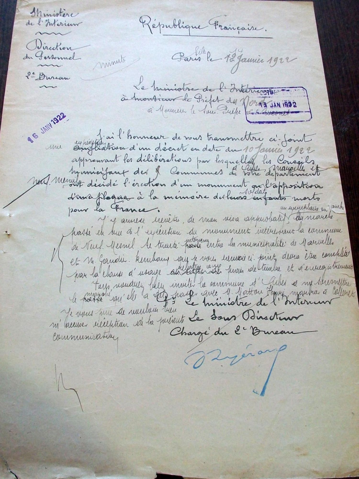 Le Préfet du Nord au sous-préfet d'Avesnes J'ai l'honneur de vous transmettre ci-joint une expédition d'un décret en date du 10 janvier 1922 approuvant les délibérations par lesquelles les conseils municipaux des communes d'Aibes, Maroilles et Neuf-Mesnil ont décidé l'érection d'un monument à la mémoire des soldats morts pour la France J'y annexe revêtu de mon visa approbatif un exemplaire du marché passé en vue de l'eécution du monument intéressant la commune de Neuf-Mesnil, le traité intervenu entre la municipalité de Maroilles et M. Gaudier-Rembaux que je vous envoie ci-joint devra être complété par la clause relative aux frais de timbre et d'enregistrement ...