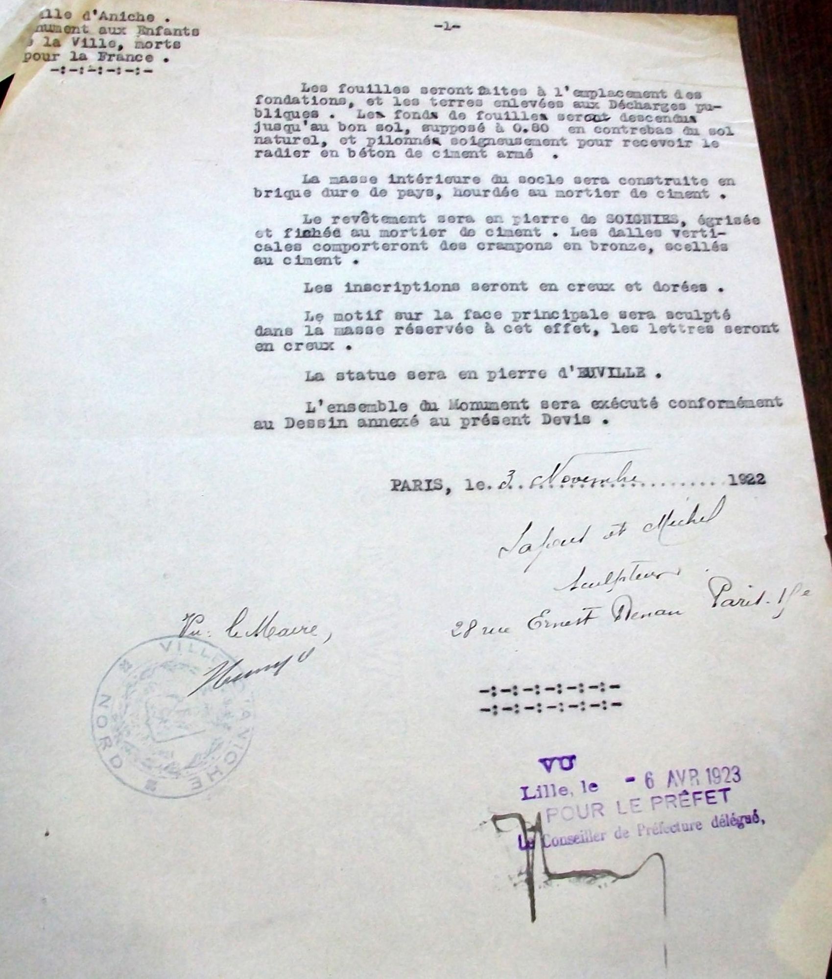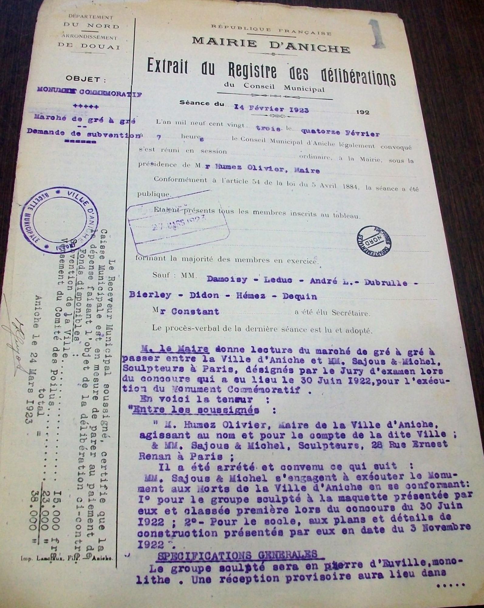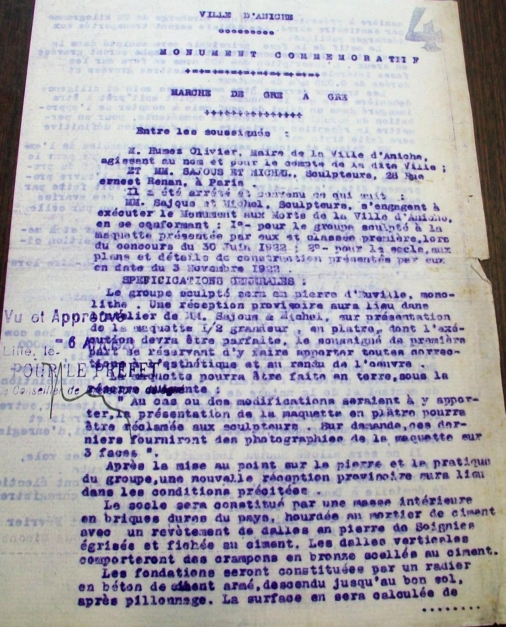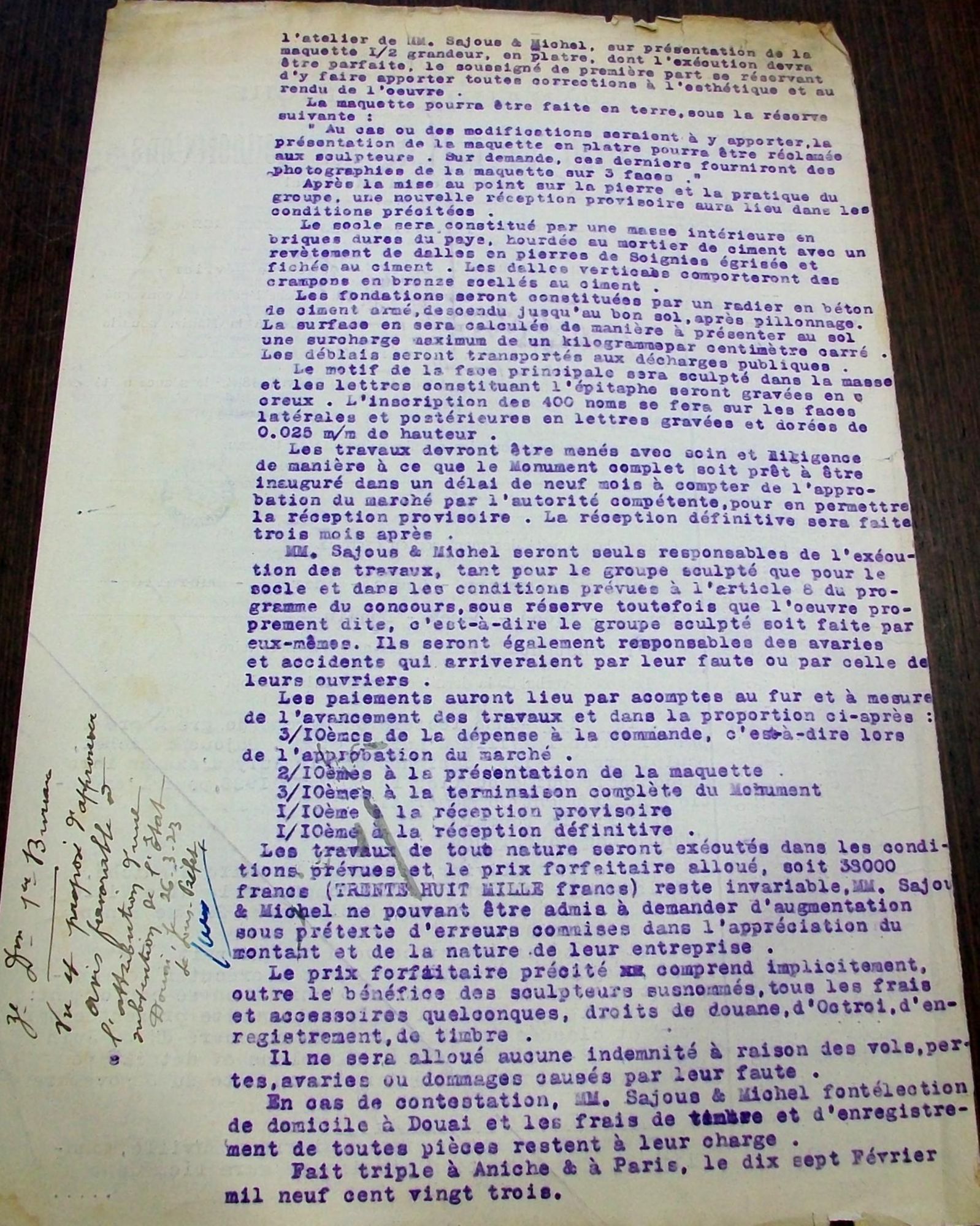 M.le Maire donne lecture du marché de gré à gré à passer entre la ville d'Aniche et MM. Sajous & Michel, sculpteurs à Paris, désignés par le Jury d'examen lors du concours qui a eu lieu le 30 juin 1922, pour l'exécution du Monument Commémoratif : En voici la teneur : Entre les Soussignés : M. Maire et MM. Sajous & Michel, sculpteurs, 28 , rue Ernest Renan à Paris : Il a été arrêté et convenu ce qui suit : - MM. Sajous & Michel s'engagent à exécuter le Monument aux Morts de la Ville d'Aniche en se conformant : 1. pour le groupe sculpté à la maquette présentée par eux et classée première lors du concours du 30 juin 1922 ; 2. Pour le socle, aux plans et détails de construction présentés par eux en date du 3 novembre 1922. Spécifications générales. Le groupe sculpté sera en pierre d'Euville, monolithe. Une réception provisoire aura lieu dans .../... l'atelier de MM. Sajous & Michel, sur présentation de la maquette 1/2 grandeur en plâtre, dont l'exécution devra être parfaite, le soussigné de première part se réservant d'y faire apporter toutes corrections à l'esthétique et au rendu de l'oeuvre. La maquette pourra être faite en terre, sous la réserve suivante : "Au cas où des modifications seraient à y apporter la présentation de la maquette en plâtre pourra être réclamée aux sculpteurs. Sur demande, ces derniers fourniront des photographies de la maquette sur 3 faces". Après la mise au point sur la pierre et la pratique du groupe, une nouvelle réception provisoire aura lieu dans les conditions précitées. Le socle sera constitué par une masse intérieure en briques dures du pays, hourdée au mortier de ciment avec un revêtement de dalles en pierres de Soignies égrisée et fichée au ciment. Les dalles verticales comporteront des crampons en bronze scellés au ciment. Les fondations seront constituées par un radier en béton de ciment armé, descendu jusqu'au bon sol, après pillonage. La surface en sera calculée de manière à présenter au sol une surcharge maximum de 1kg/cm2. Les déblais seront transportés aux décharges publiques. Le motif de la face principale sera sculptée dans la masse et les lettres constituant l'épitaphe seront gravées en creux. L'inscription des 400 noms se fera sur les faces latérales et postérieures en lettres gravées et dorées de 0.025m/m de hauteur. Les travaux devront être menés avec soin et diligence de manière à ce que le monument complet soit prêt à être inauguré dans un délai de 9 mois à compter de l'approbation du marché par l'autorité compétente, pour en permettre la réception provisoire. La réception définitive sera faite 3 mois après. MM. Sajous & Michel seront seuls responsables de l'exécution des travaux, tant pour le groupe sculpté que pour le socle et dans les conditions prévues à l'article 8 du programme du concours, sous réserve toutefois que l'oeuvre proprement dite, c'est-à-dire le groupe sculpté soit faite par eux-mêmes. Ils seront également responsables des avaries et accidents qui arriveraient par leur faute ou par celle de leurs ouvriers. Les paiements auront lieu par acomptes au fur et à mesure de l'avancement des travaux et dans la proportion ci-après : 3/10e de la dépense à la commande, c'est-à-dire lors de l'approbation du marché ; 2/10e à la présentation de la maquette : 2/10e à la terminaison complète du monument ; 1/10e à la réception provisoire ; 1/10e à la réception définitive. Les travaux de toute nature seront exécutés dans les conditions prévues et le prix forfaitaire alloué, soit 38000 francs reste invariable, MM. Sajous & Michel ne pouvant être admis à demander d'augmentation sous prétexte d'erreurs commises dans l'appréciation du montant et de la nature de leur entreprise. Le prix forfaitaire précité comprend implicitement, outre le bénéfice des sculpteurs susnommés, tous les frais et accessoires quelconques, droits de douane, d'octroi, d'enregistrement, de timbre. Il ne sera alloué aucune indemnité à raison des vols, pertes, avaries, ou dommages causés par leur faute. En cas de contestation, MM. Sajous & Michel font élection de domicile à Douai et les frais de timbre et d'enregistrement de toutes pièces restent à leur charge.
