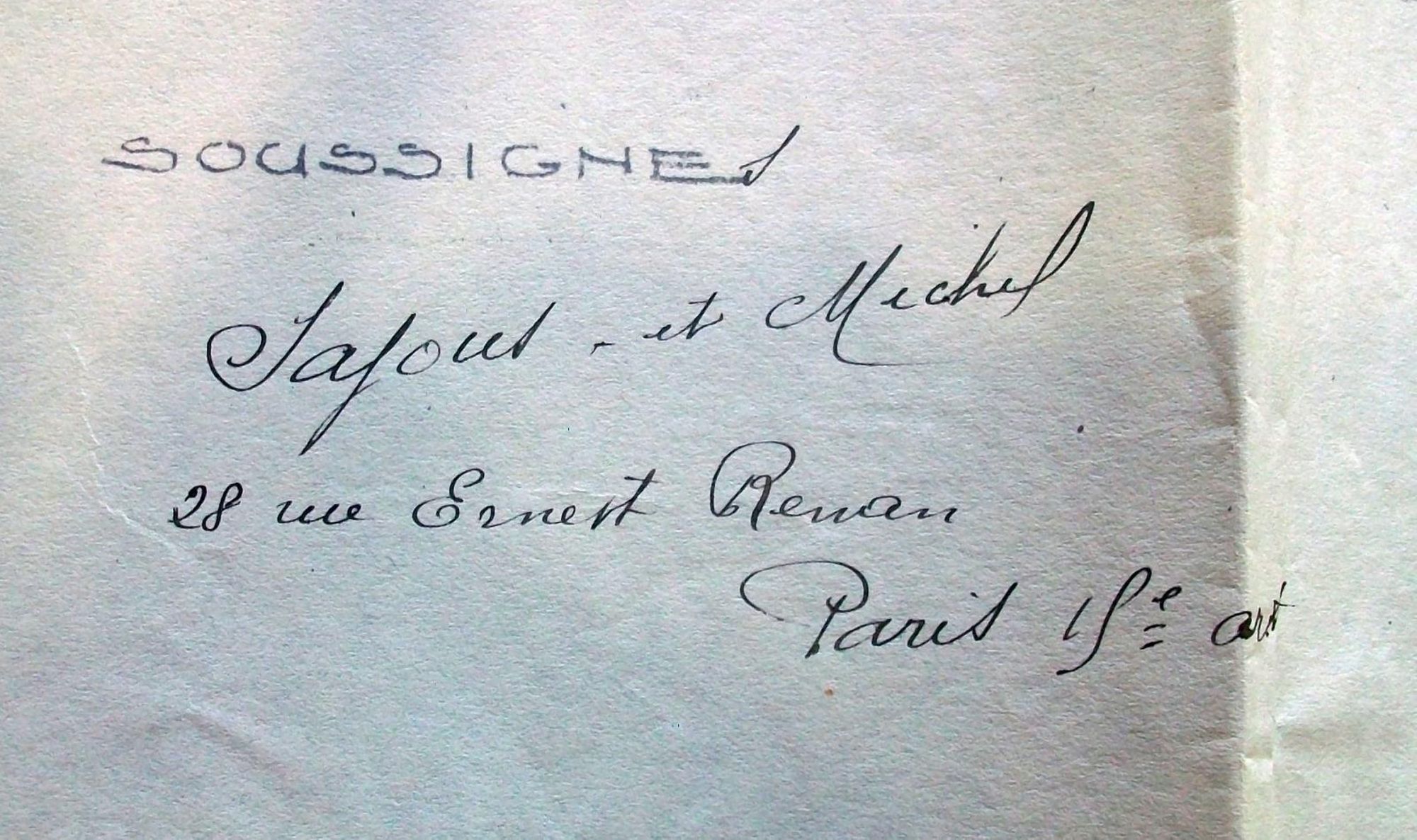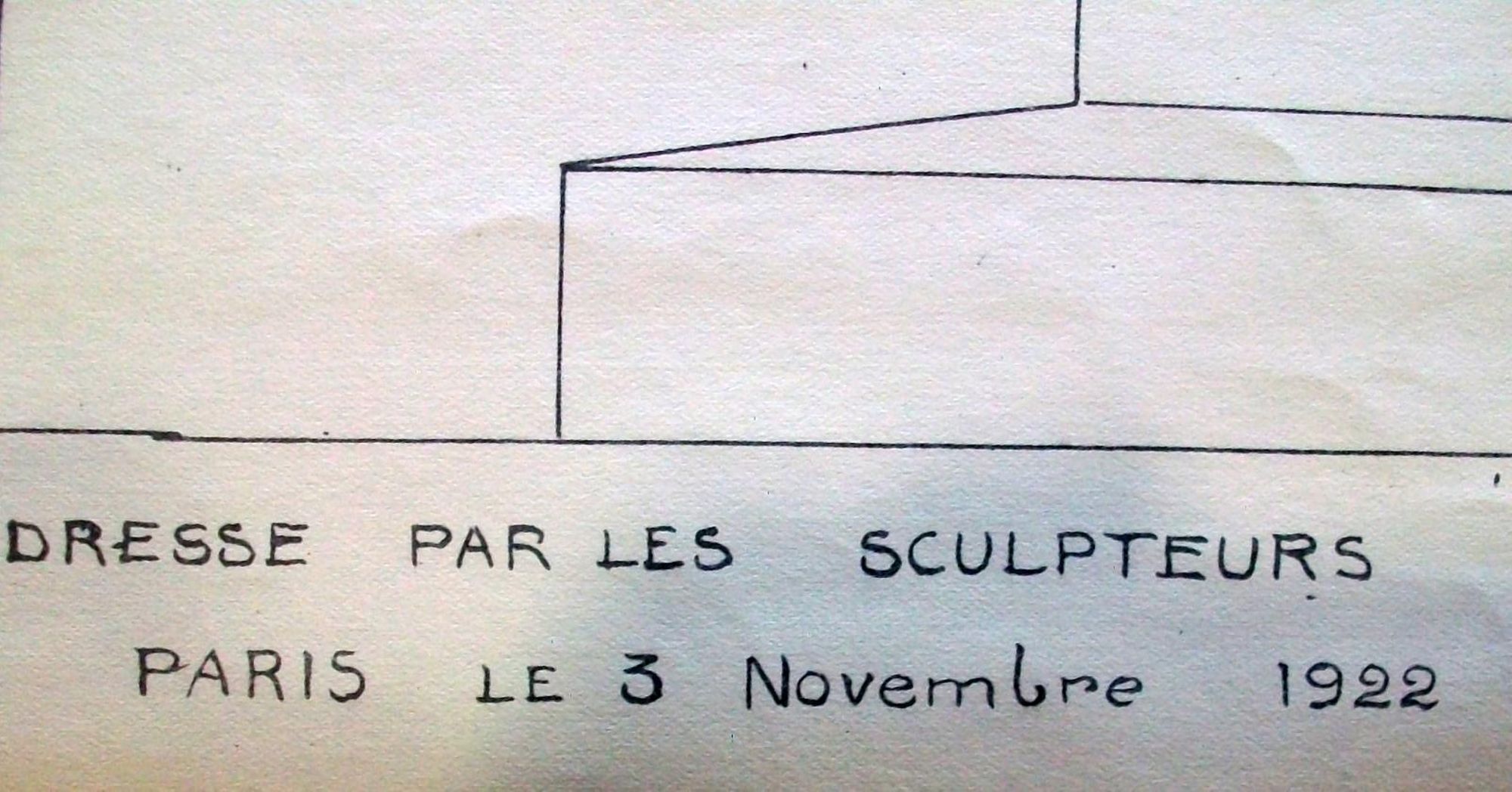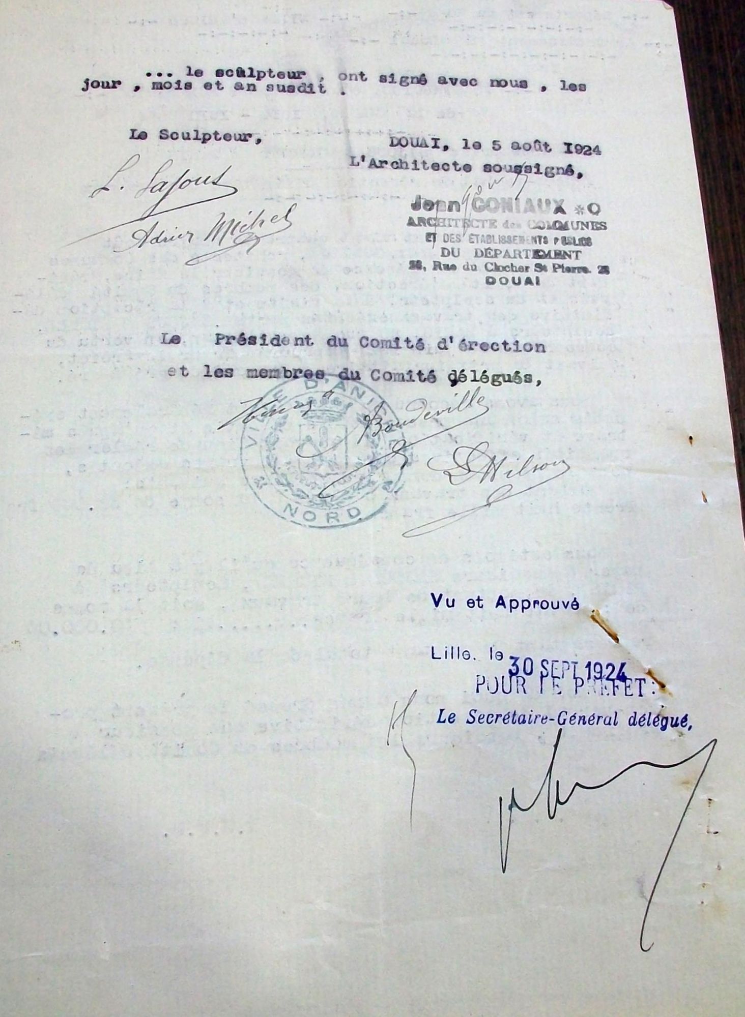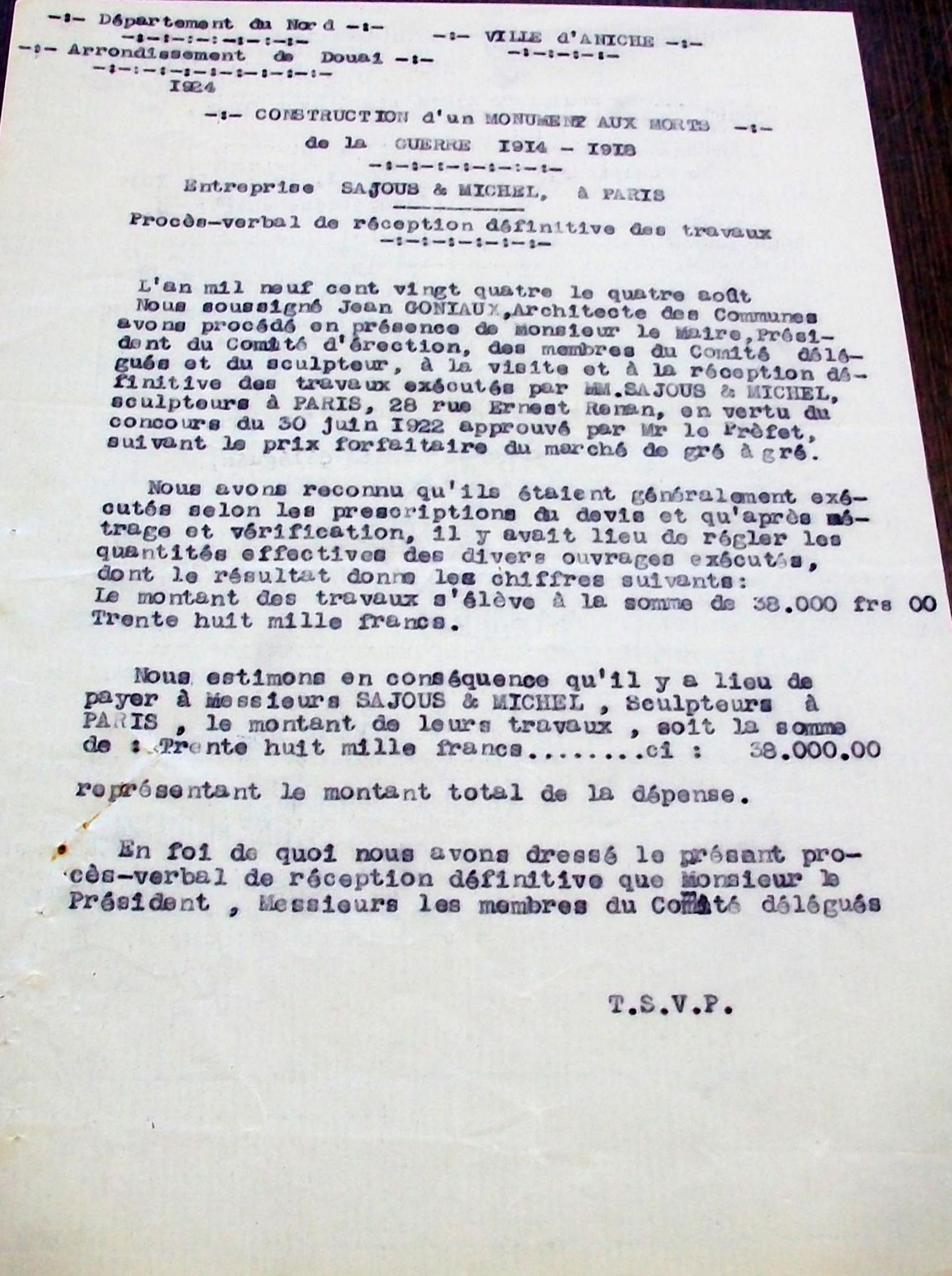 Entreprise Sajous & Michel, à Paris Procès-verbal de réception définitive des travaux Nous soussigné Jean Goniaux, architecte des Communes avons procédé, en présence de Monsieur le Maire, Président du Comité d'érection, des membres du Comité délégués et du sculpteur, à la visite et à la réception définitive des travaux exécutés par MM. Sajous & Michel, sculpteurs à Paris, 28, rue Ernest Renan, en vertu du concours du 30 juin 1922 approuvé par Mr . le Préfet, suivant le prix forfaitaire du marché de gré à gré. Nous avons reconnu qu'ils étaient généralement exécutés selon les prescriptions du devis et qu'après métrage et vérification, il y avait lieu de régler les quantités effectives des divers ouvrages exécutés, dont le résultat donne les chiffres suivants : Le montant des travaux s'élève à la somme de 38000 francs. Nous estimons en conséquence qu'il y a lieu de payer à Messieurs Sajous & Michel, sculpteurs à Paris, le montant de leurs travaux, soit la somme de 38000 francs représentant le montant total de la dépense. En foi de quoi nous avons dressé le présent procès-verbal de réception définitive que Monsieur le Président, Messieurs les membres du Comité délégués .../... le sculpteur, ont signé avec nous, les jours, mois et an susdit.