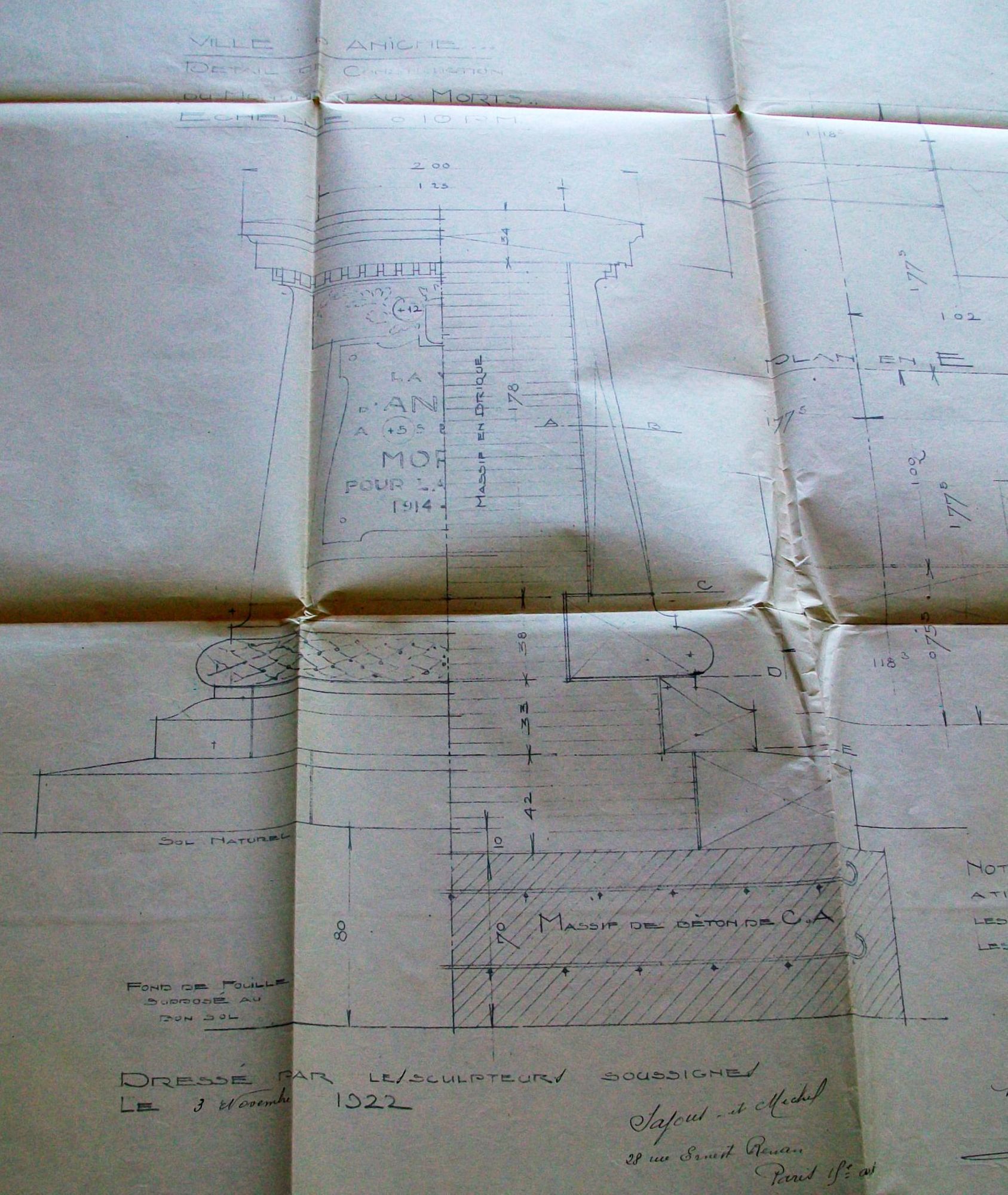 M. le Maire Les plans du monument 'élévation, profil, coupe et plan de construction) dressés par les sculpteurs ont été soumis à M. Goniaux, architecte. Celui-ci trouve que ces documents paraissent bien établis. L'administration municipale est appelée à donner son avis sur le projet de marché ci-dessus. Le Conseil municipal : - approuve tels établis le marché à intervenir pour l'érection du Monument commémoratif et les plans et devis. - dit que la dépense sera couverte : 1. au moyen de la subvention de la ville, 15000 frs inscrite au budget additionnel de 1922, article 10, sous la rubrique "Monuments aux soldats morts pour la France" 2. au moyen de la différence entre le prix forfaitaire et le montant de la subvention de la ville, soit 23 000 francs, somme provenant de souscriptions publiques, de fêtes, etc... déposée par le Comité d'érection dans la Caisse municipale. - Sollicite de l'État, conformément à la loi de finances du 31 juillet 1920, une subvention de 2700 francs, décida que cette somme sera employée à l'aménagement du pourtour du Monument et à la pose d'une clôture avec grille, travaux non compris dans le projet