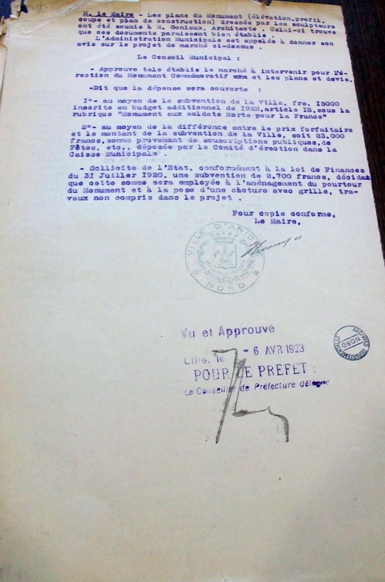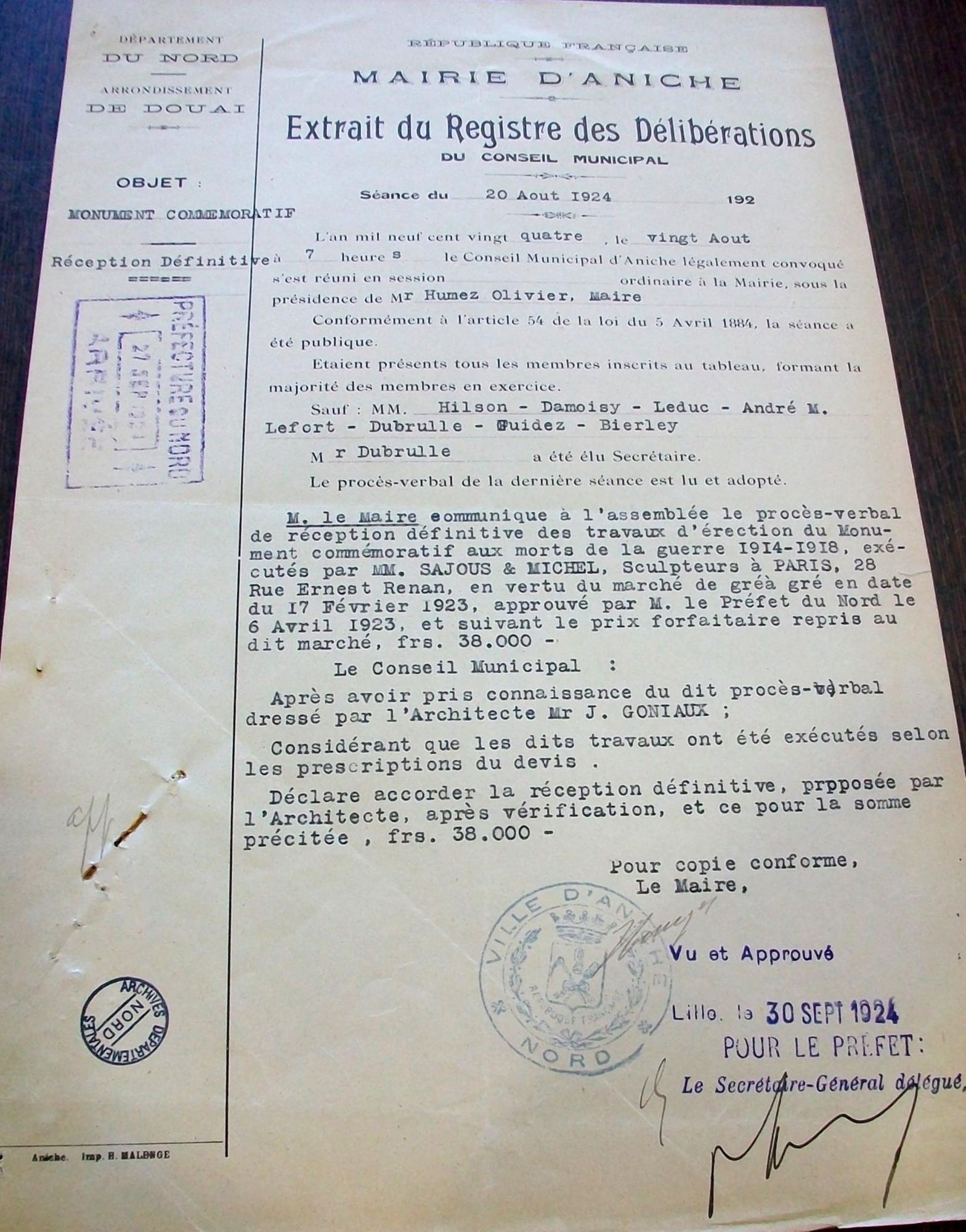 M. le Maire communique à l'assemblée le procès-verbal de réception définitive des travaux d'érection du Monument commémoratif aux morts de la guerre 1914-1918, exécutés par MM. Sajous & Michel, sculpteurs à Paris, 28 rue Ernest Renan, en vertu du marché de gré à gré en date du 17 février 1923, approuvé par M. le Préfet du Nord le 6 avril 1923, et suivant le prix forfaitaire repris au dit marché, 38000 francs Le Conseil municipal : Après avoir pris connaissance du dit procès-verbal dressé par l'Architecte M. J. Goniaux ; Considérant que les dits travaux ont été exécutés selon les prescriptions du devis. Déclare accorder la réception définitive, proposée par l'architecte, après vérification, et ce pour la somme précitée, 38000 francs.