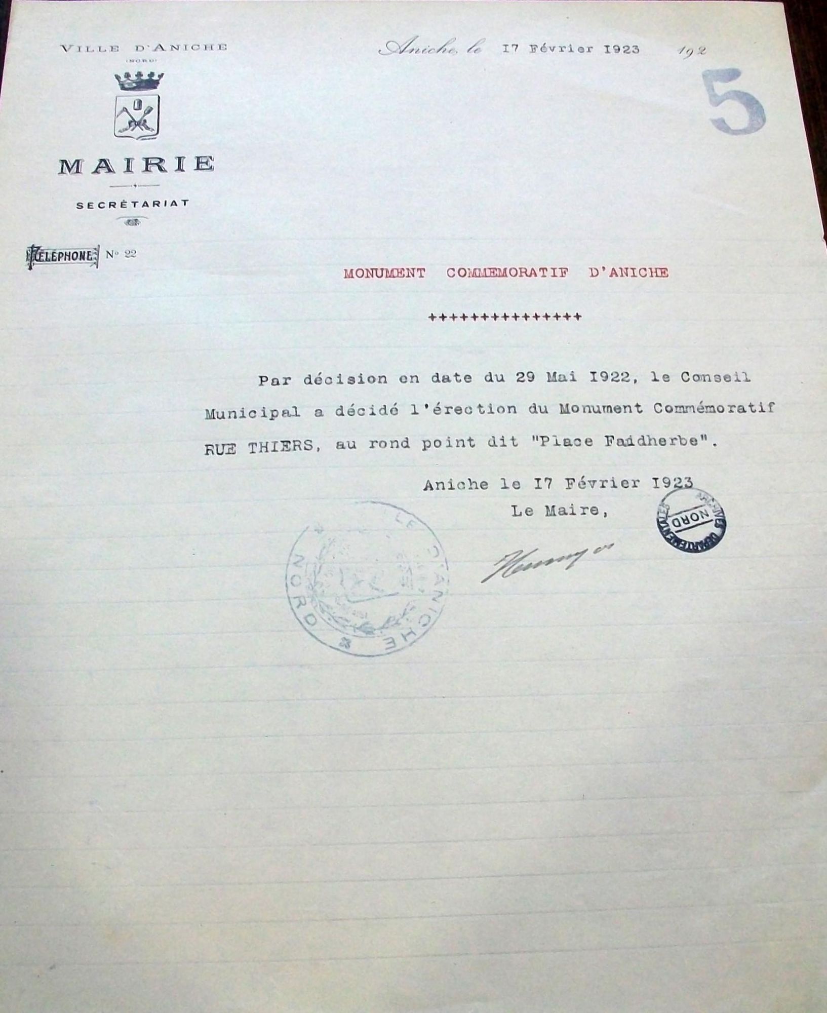 Par décision en date du 29 mai 1922, le Conseil municipal a décidé l'érection du Monument commémoratif rue Thiers, au rond point dit "Place Faidherbe"