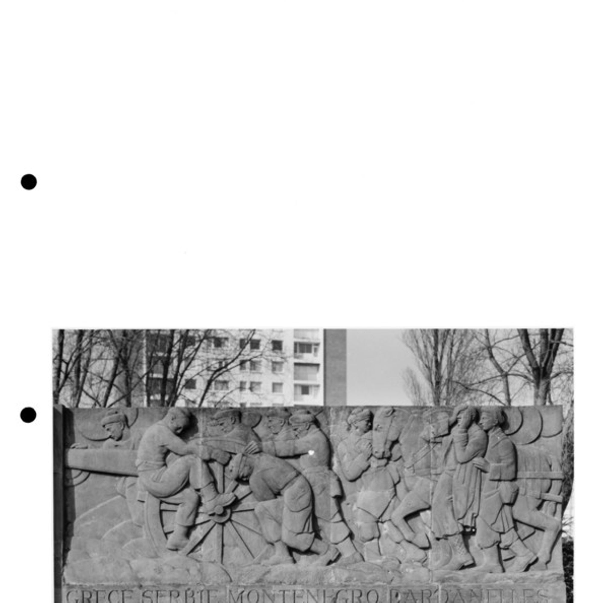 De chaque côté, des bas reliefs représentent, l’un le départ des marins, conduits par un génie ailé, l’autre les fusiliers relevant une pièce de 75 qu’un obus allemand vient de renverser.