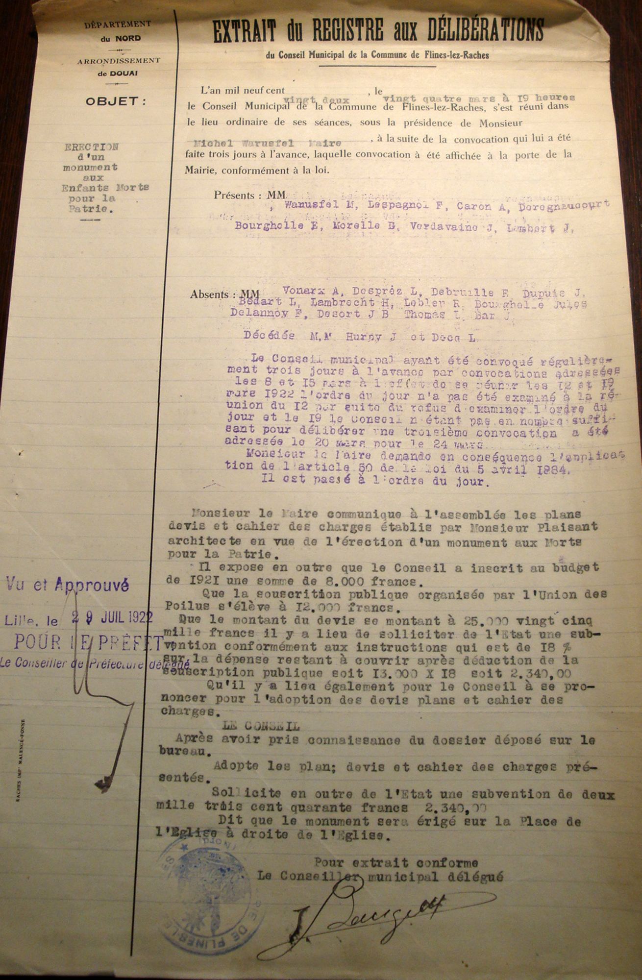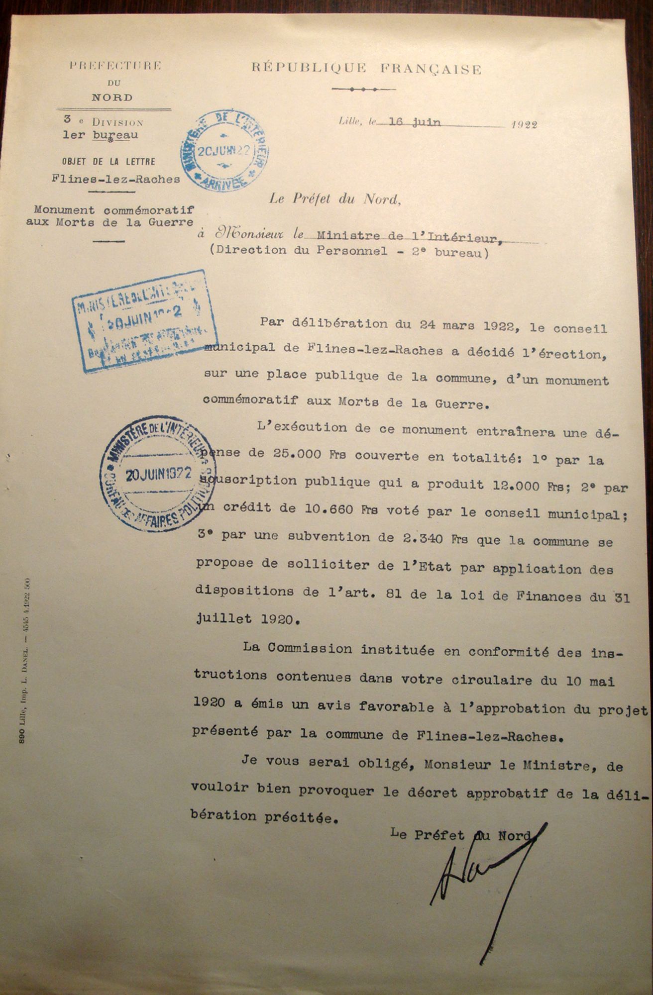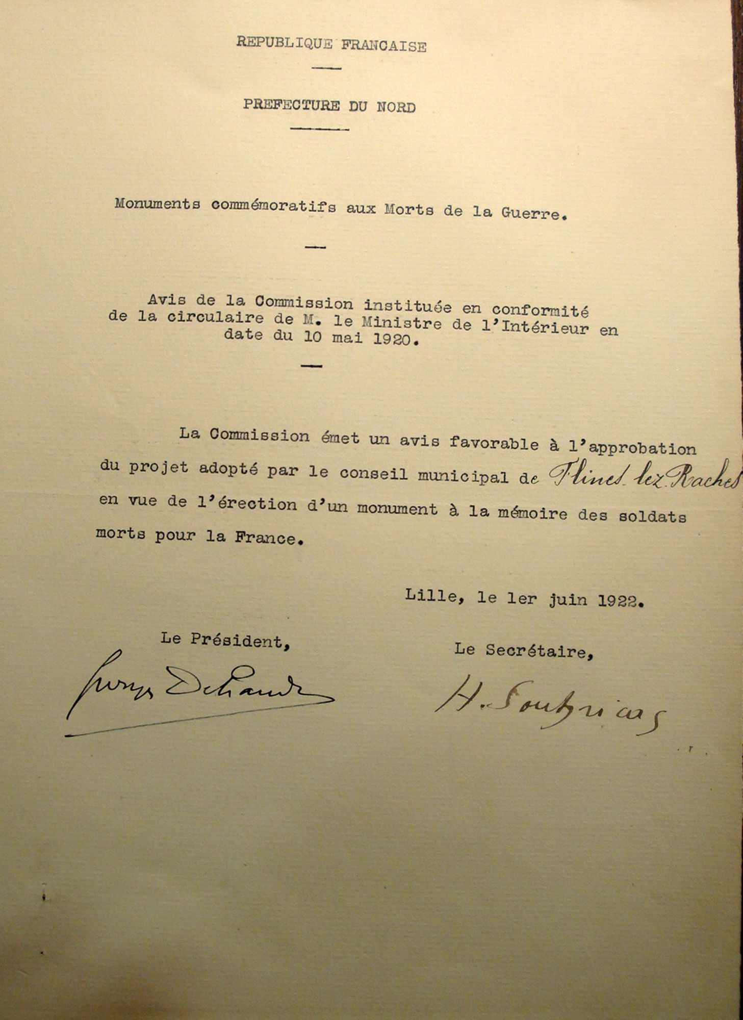 La commission émet un avis favorable à l'approbation du projet adopté par le conseil municipal de Flines-les-Râches en vue de l'érection d'un monument à la mémoire des soldats morts pour la France