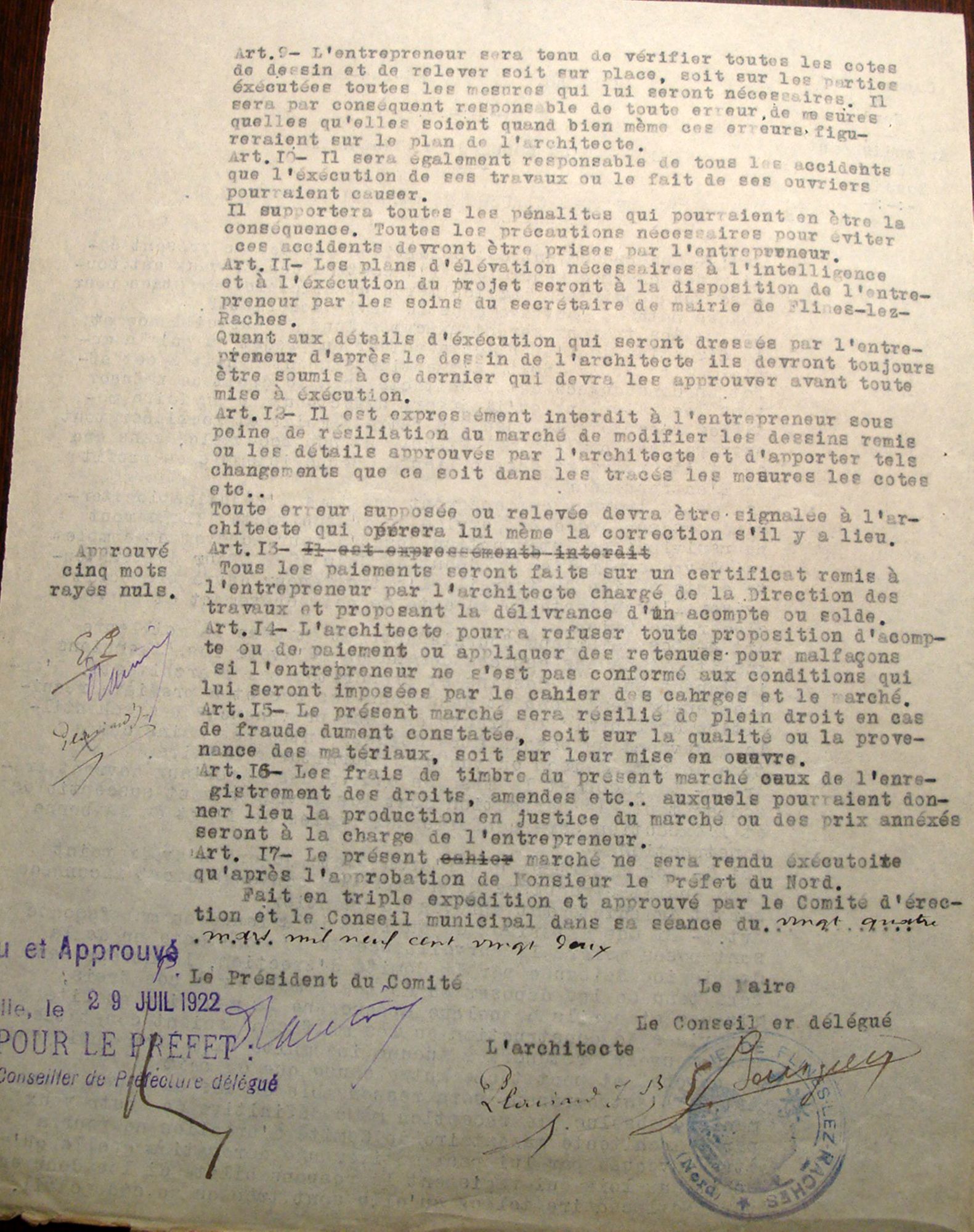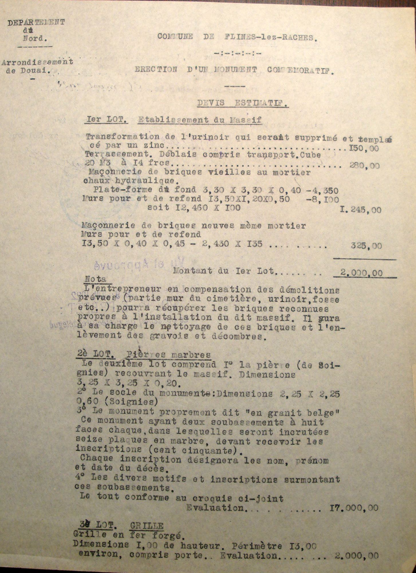 - - 1er lot : établissement du massif maçonnerie = 2000 francs Soumission faite par Monsieur Cabre Henri entrepreneur à Flines-lez-Raches, offrant un rabais de 1%
