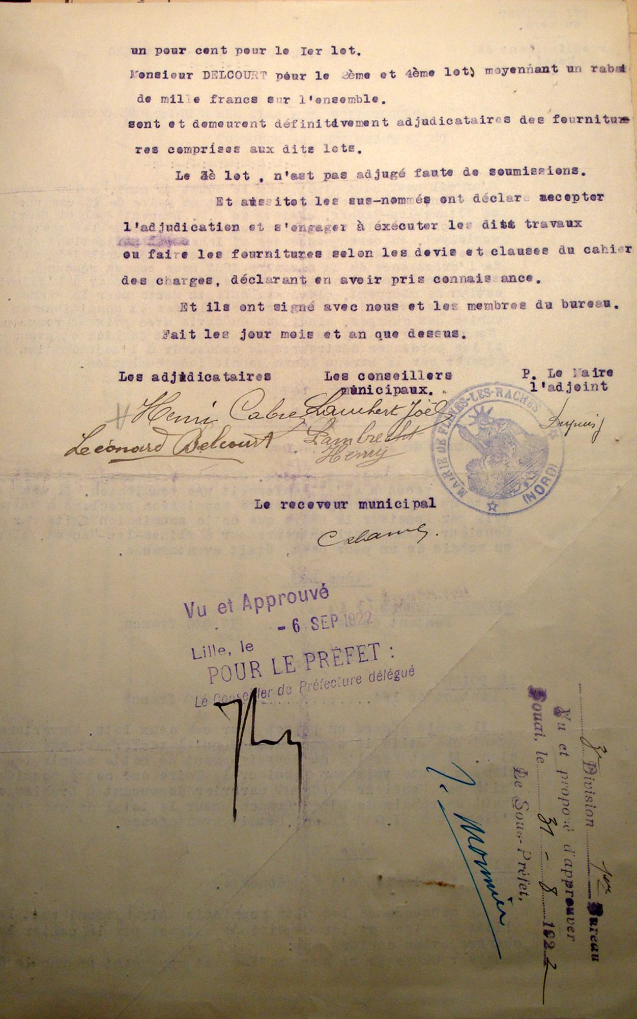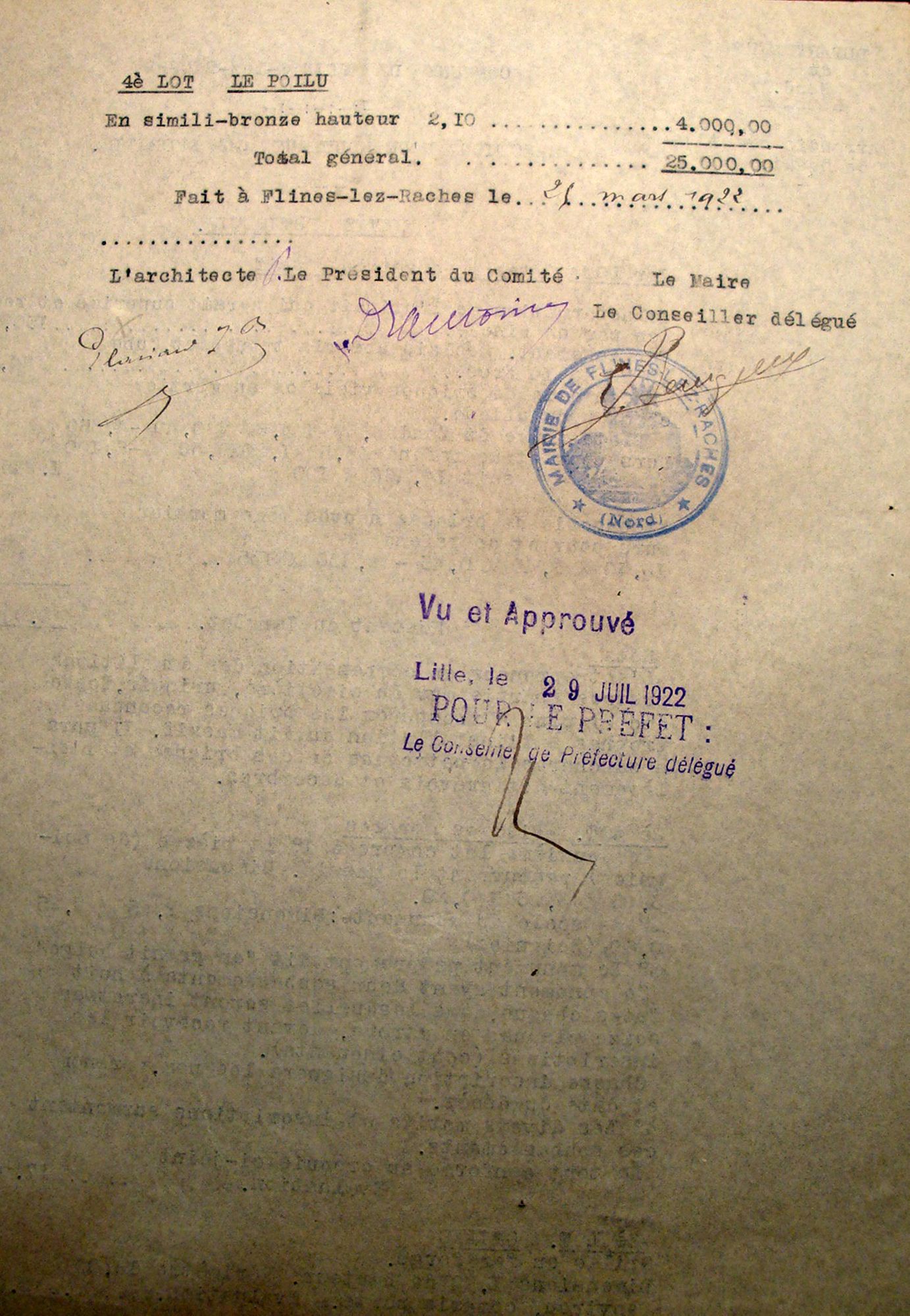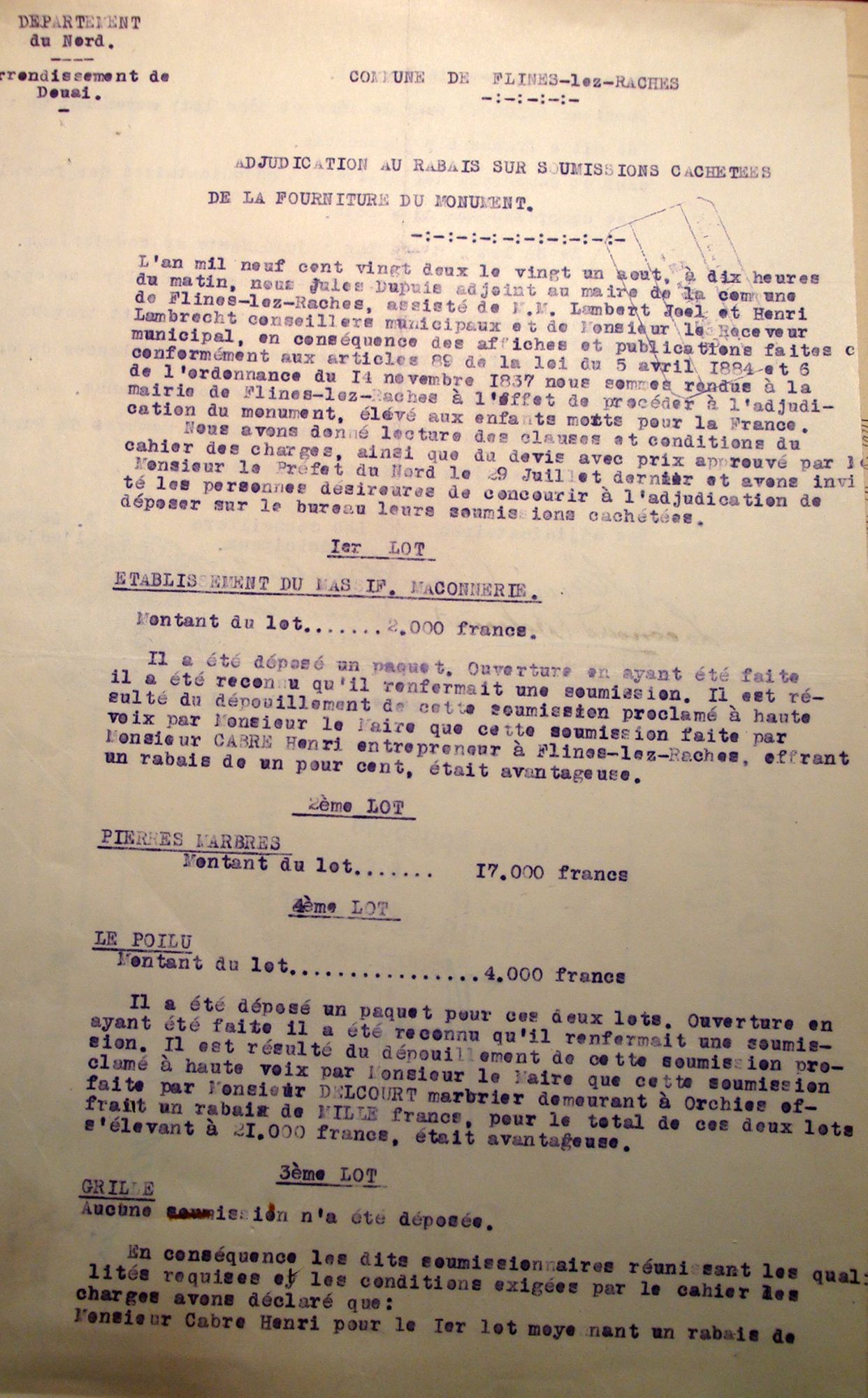 - 4e lot : Le poilu = 4 000 francs Un paquet pour ces 2 lots. 1 seule soumission Monsieur Delcourt marbrier deumeurant à Orchies, offrant un rabais de 1000 francs, pour le total de ces deux lots