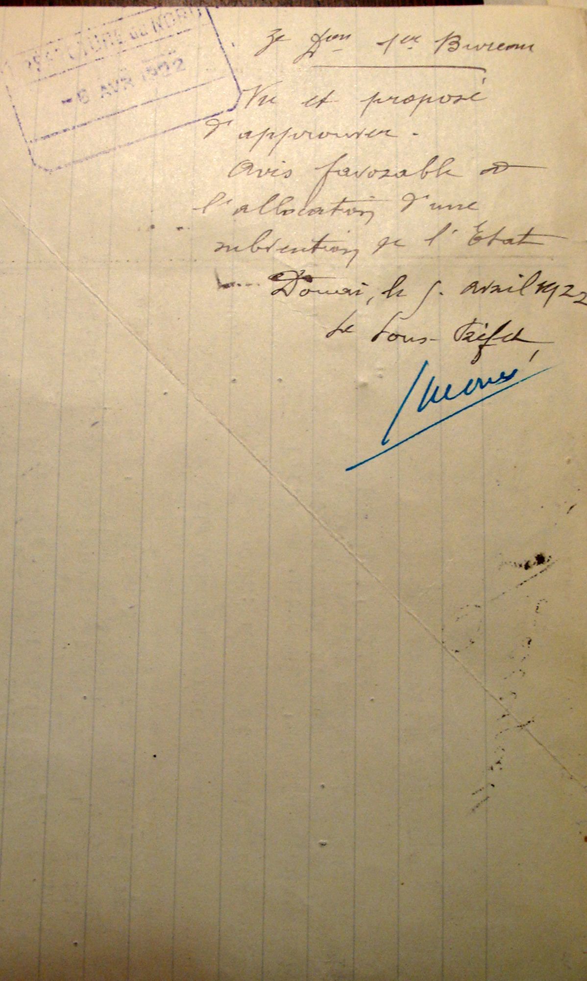 5 avril 1922 Avis favorable à l'allocation d'une subvention de l'État Le sous-Préfet