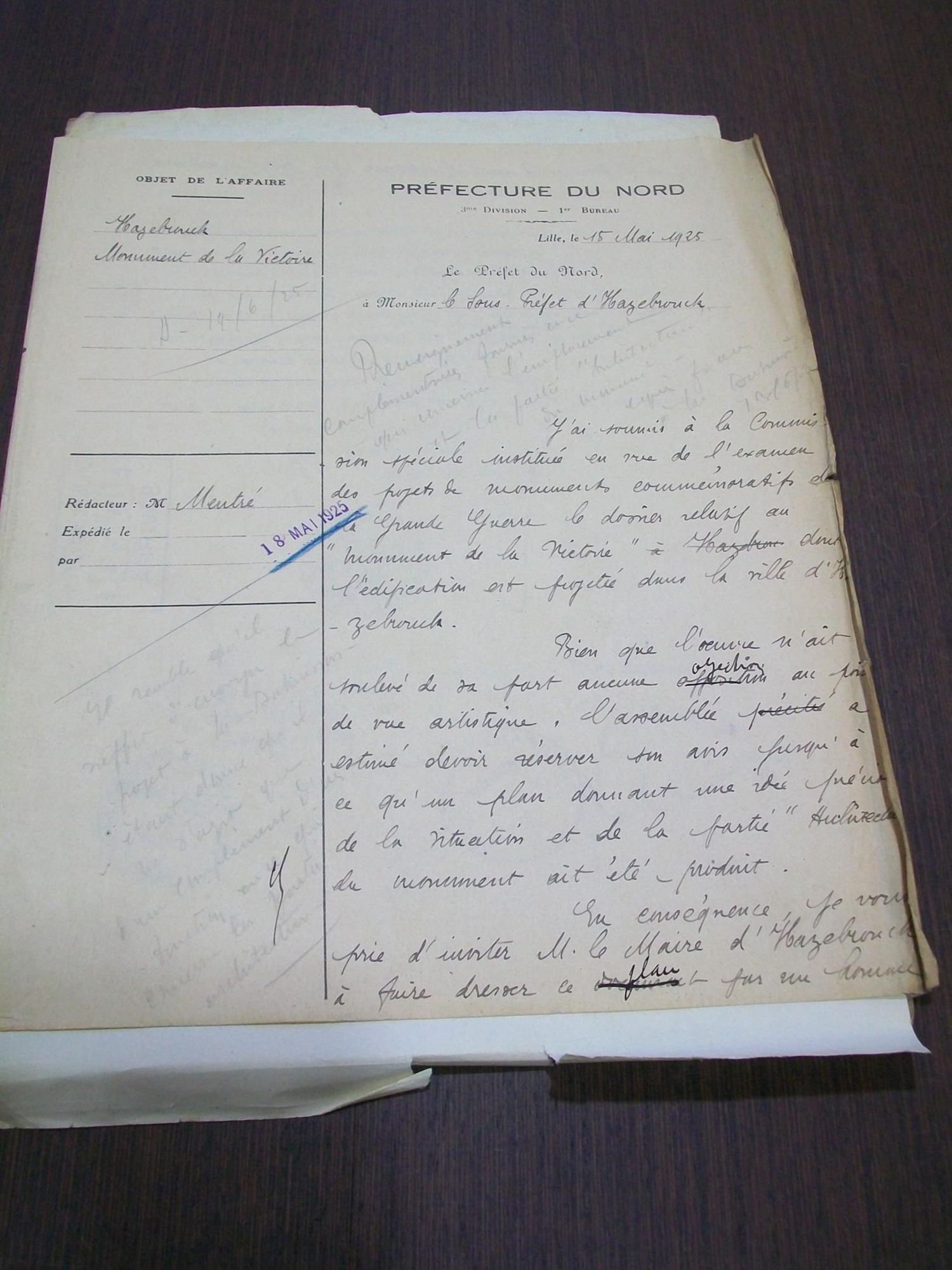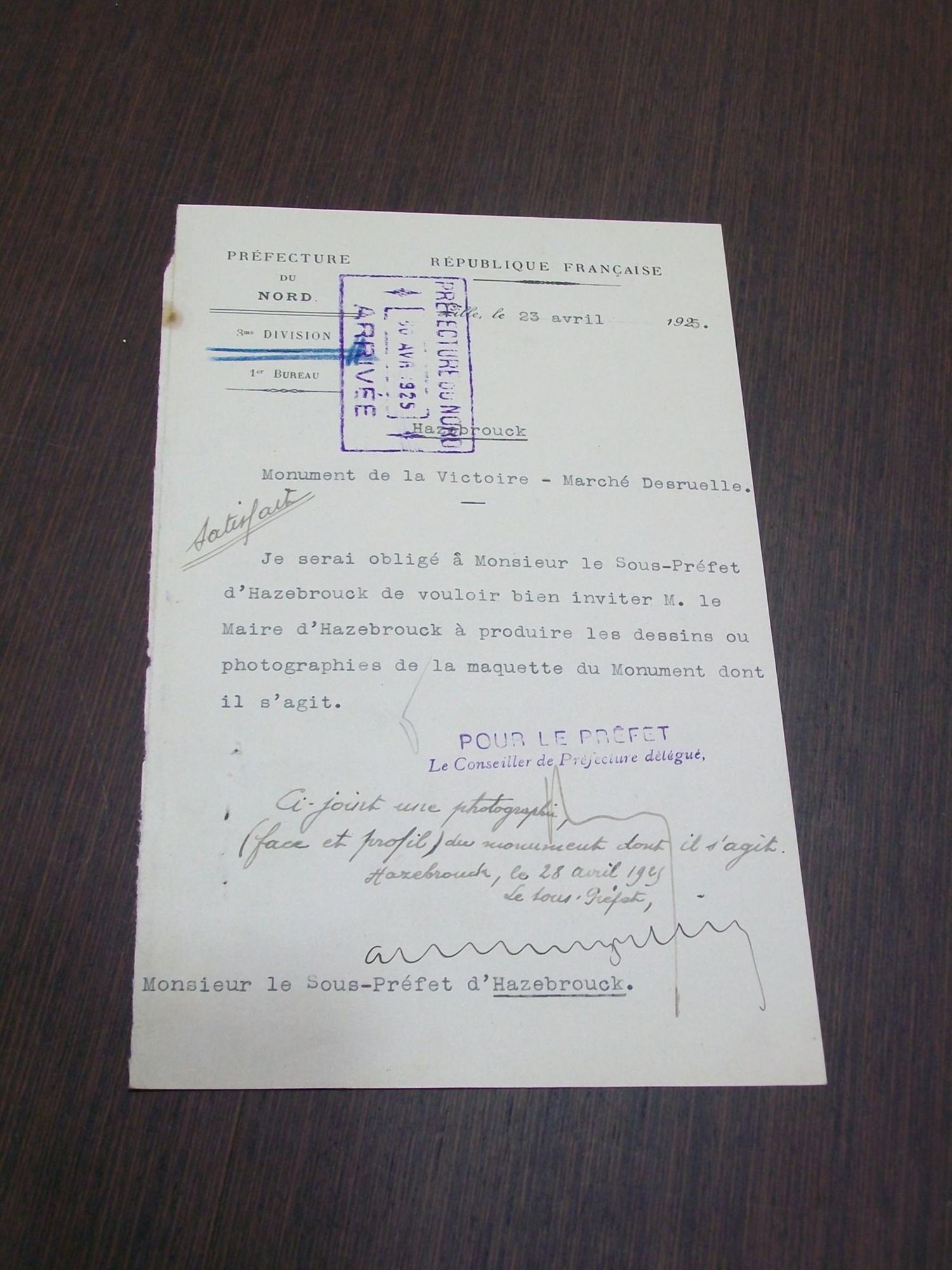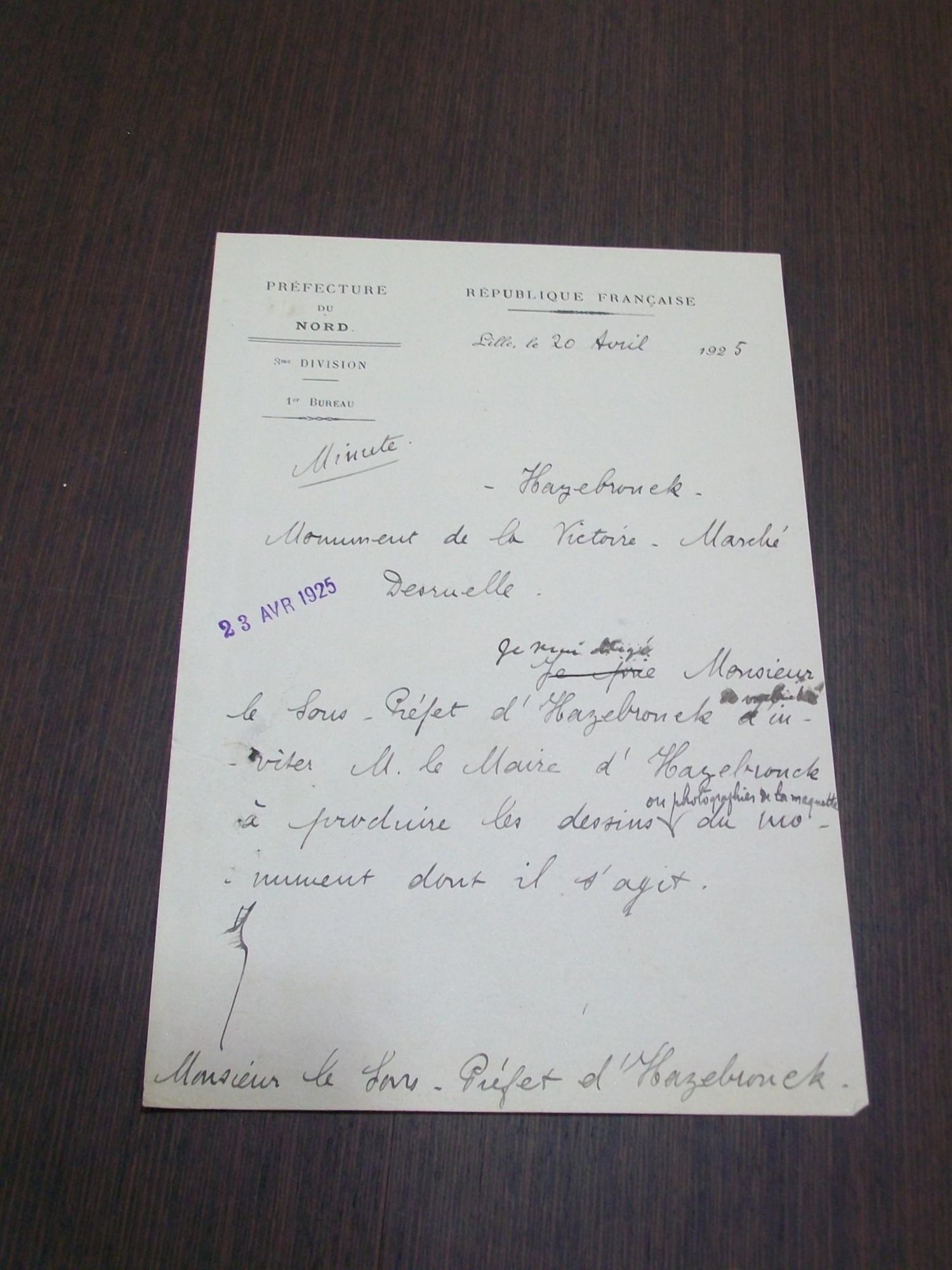 "Je serai obligé à Monsieur le Sous-Préfet d'Hazebrouck de vouloir bien inviter M. le Maire d'Hazebrouck à produire les dessins ou photographies de la maquette du monument dont il s'agit."