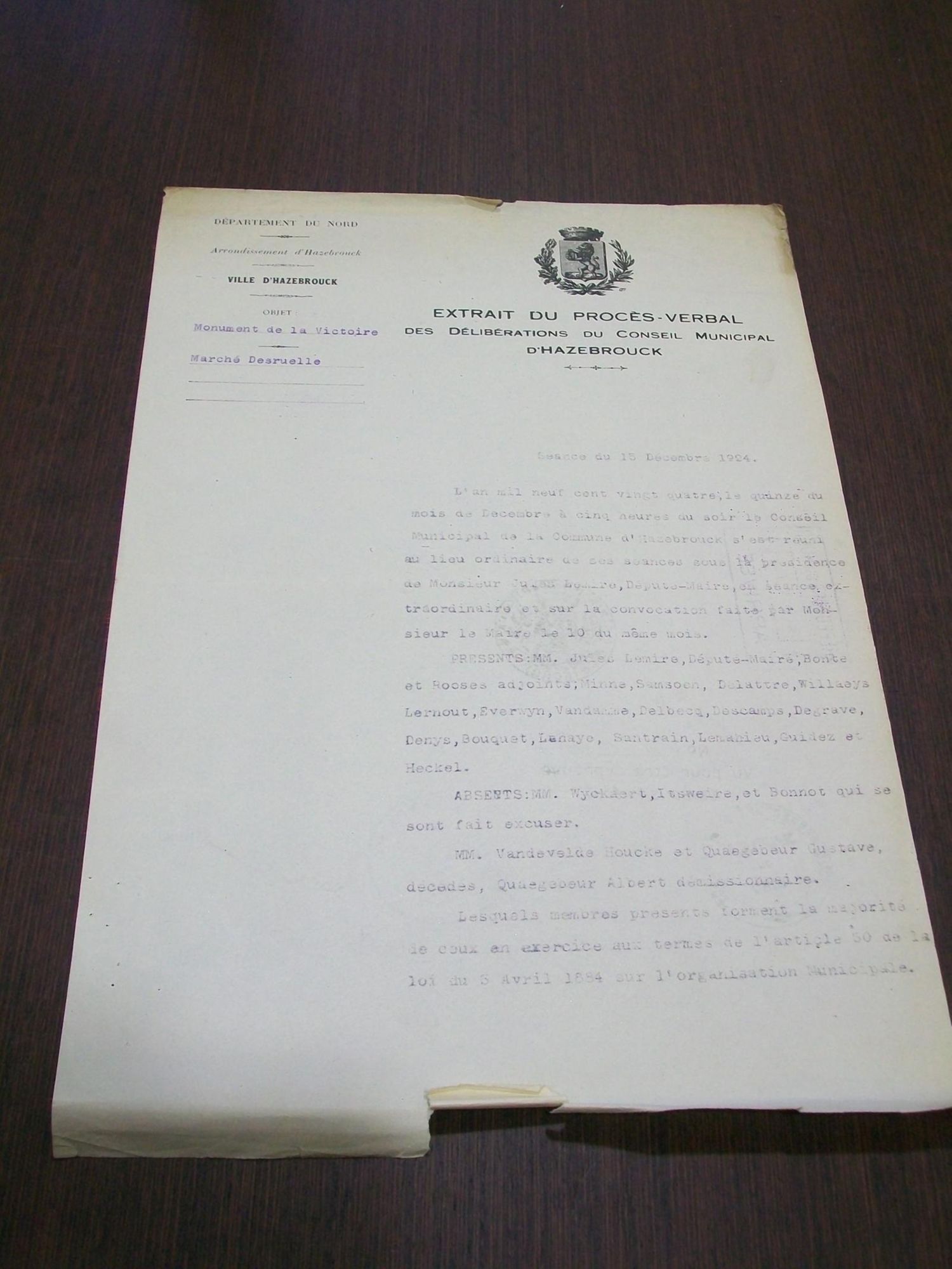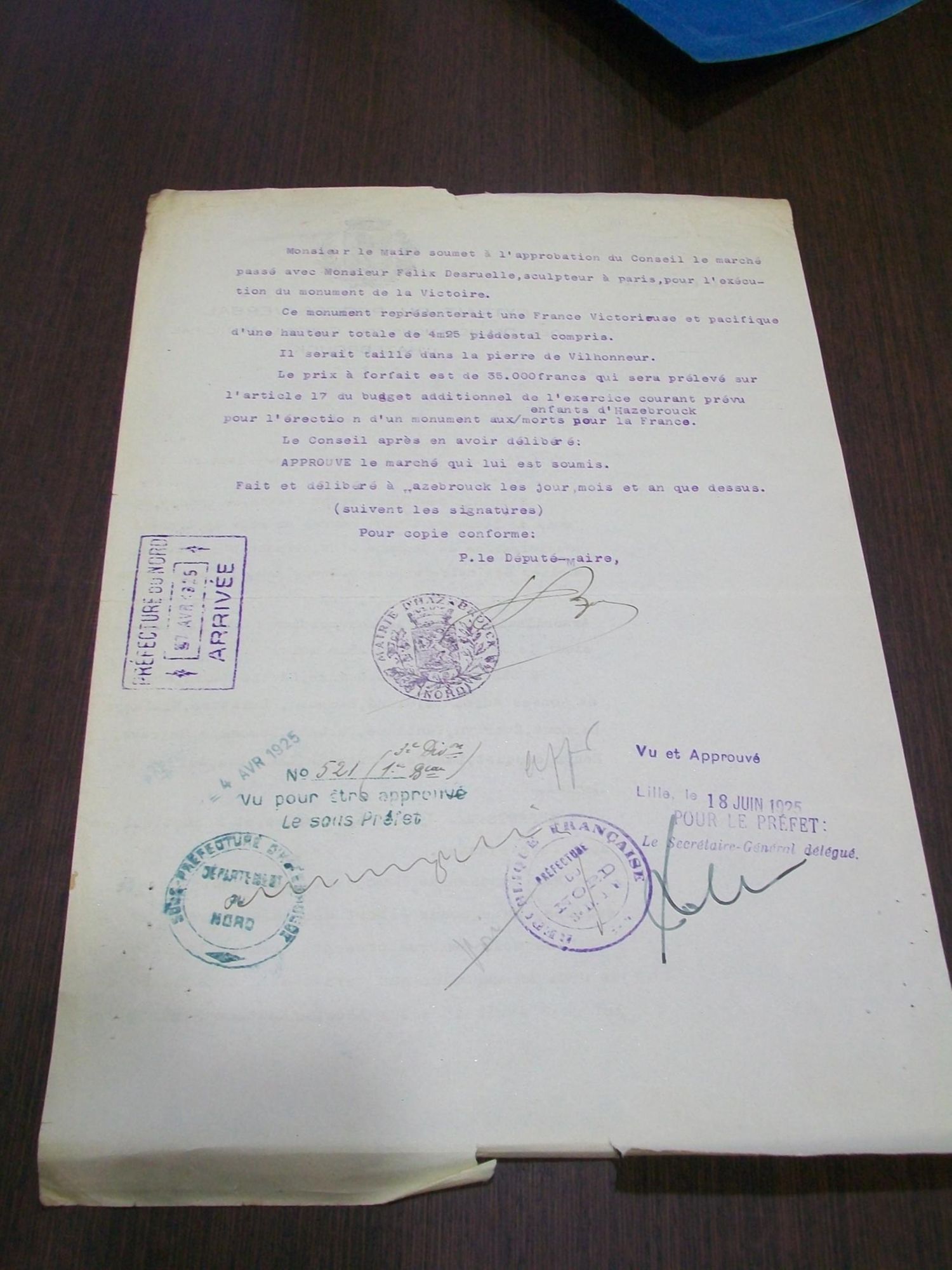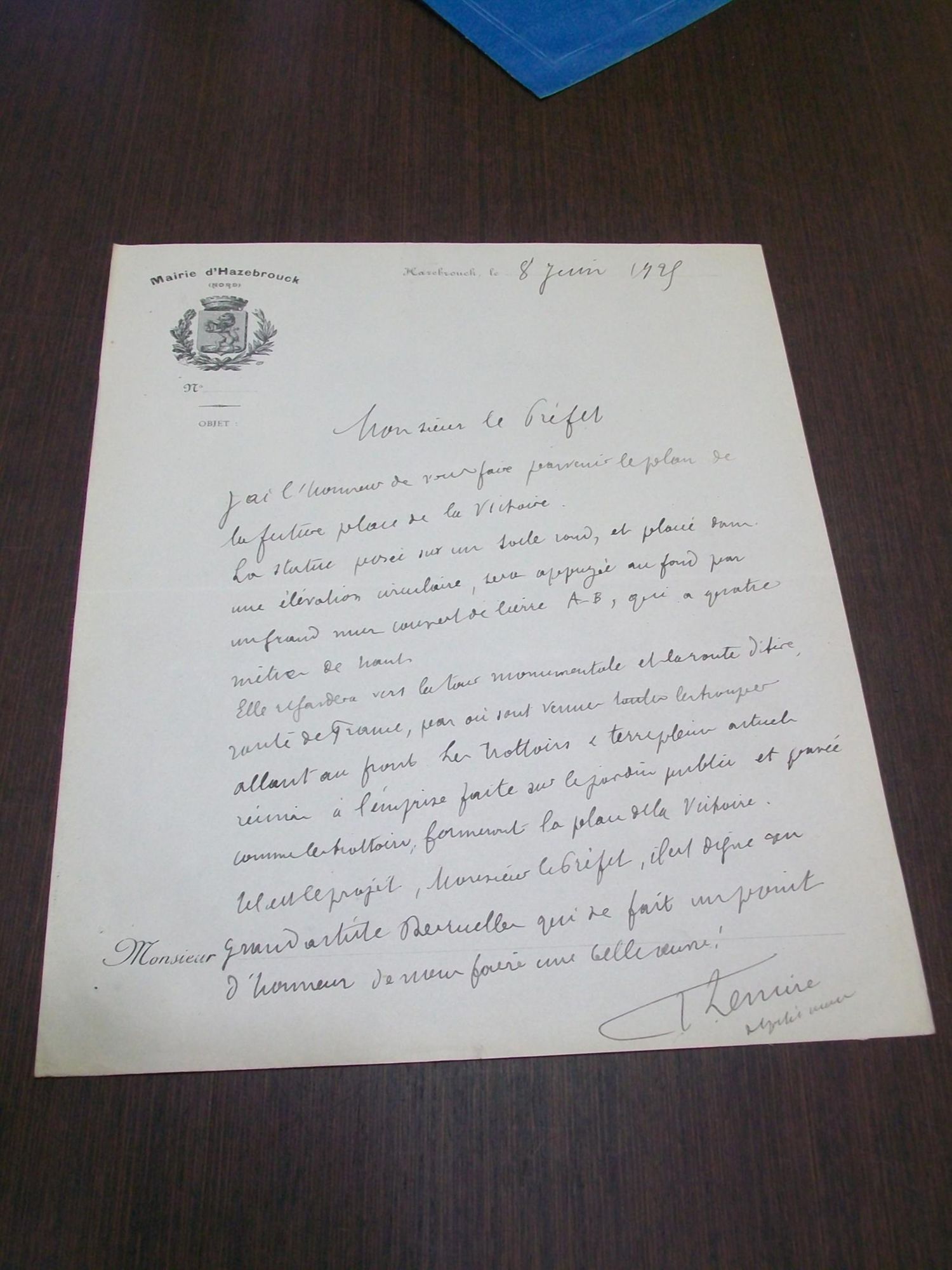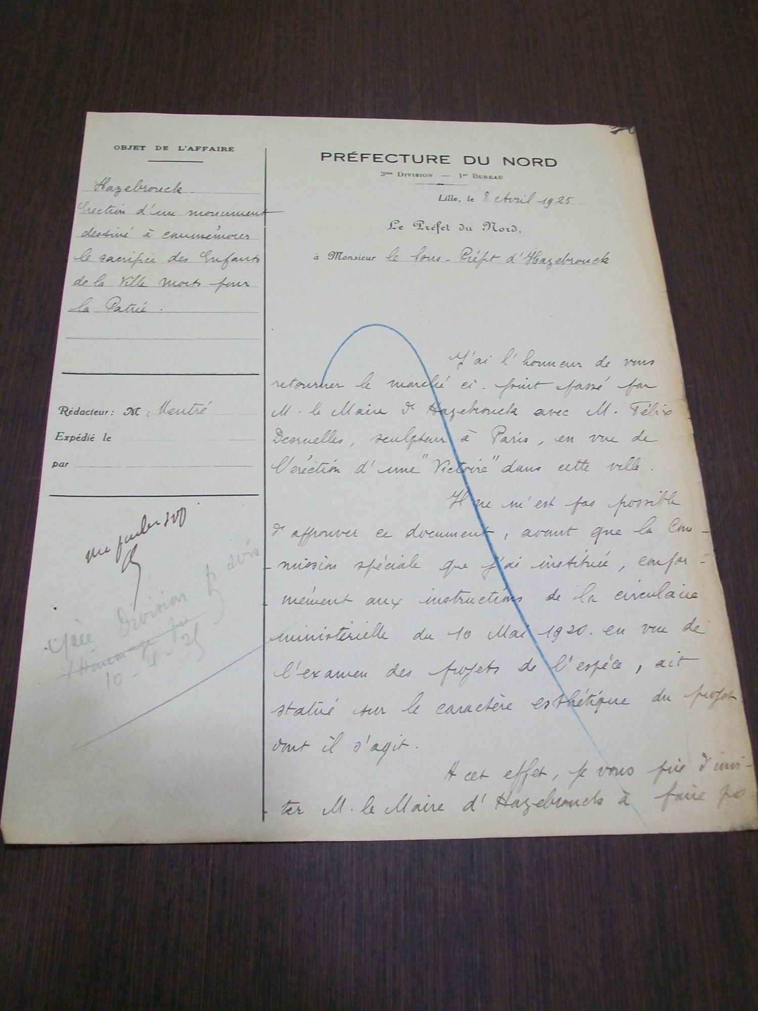 "Je serai obligé à Monsieur le Sous-Préfet d'Hazebrouck de vouloir bien inviter M. le Maire d'Hazebrouck à produire les dessins ou photographies de la maquette du monument dont il s'agit."