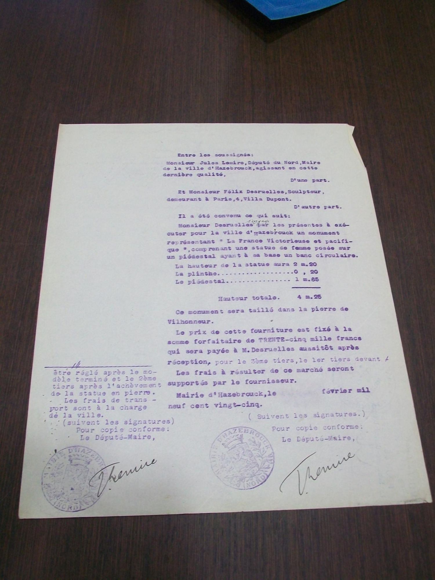Marché entre le maire de la ville et M. Desruelle, sculpteur à Paris, pour la construction du monument de la Victoire. Prix : 35 000 francs