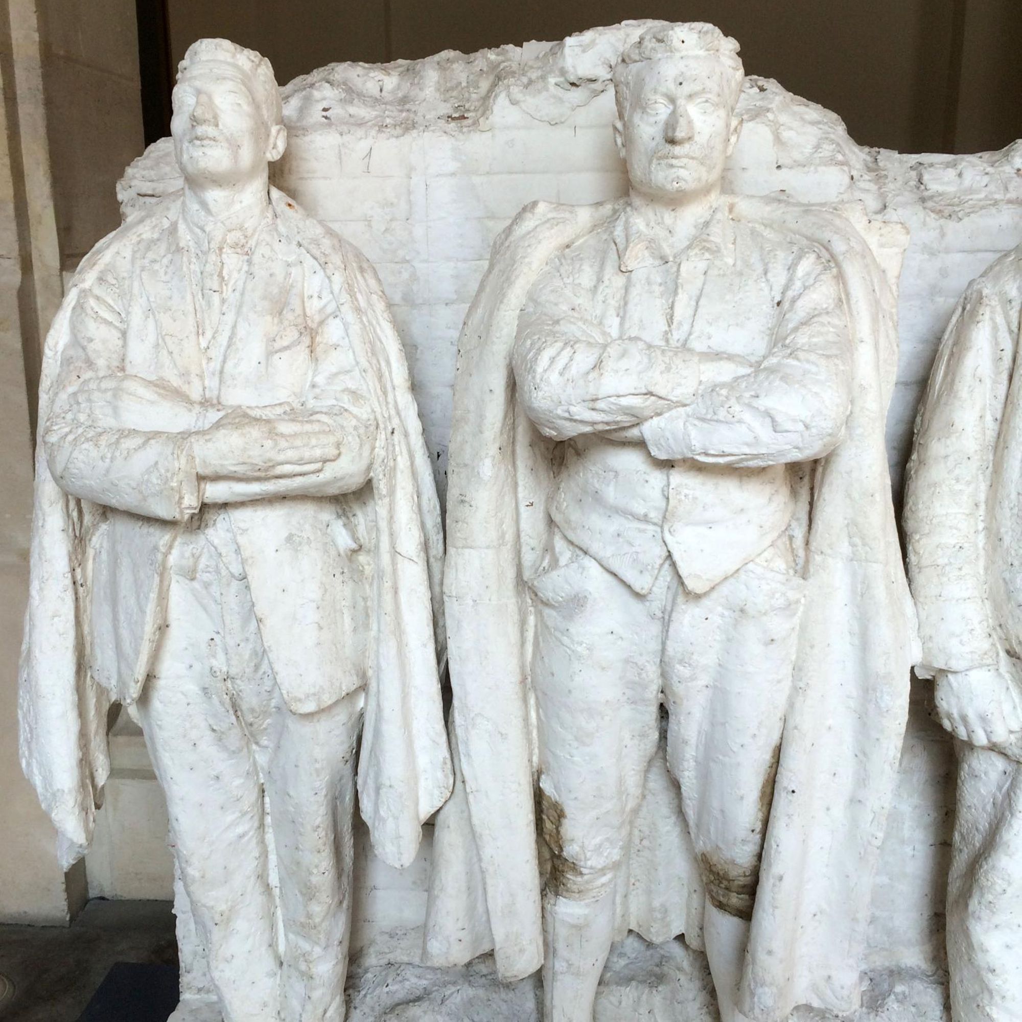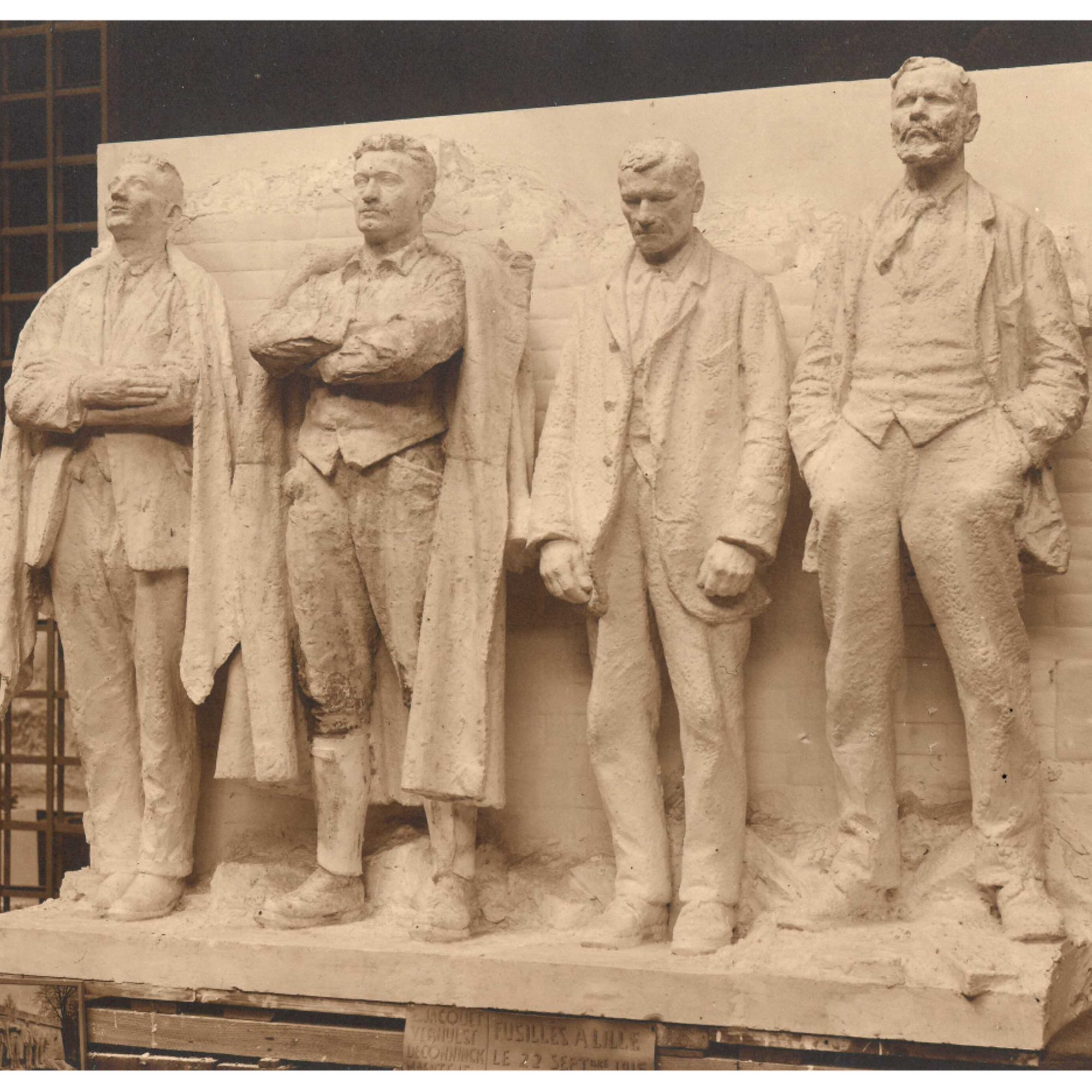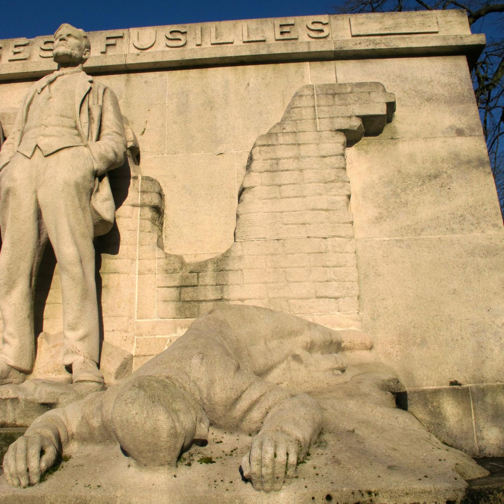 Ils sont représentés debout, adossés au mur qui les a vu tomber. En août 1940, ce monument est détruit à coups de pioche par les Allemands.
