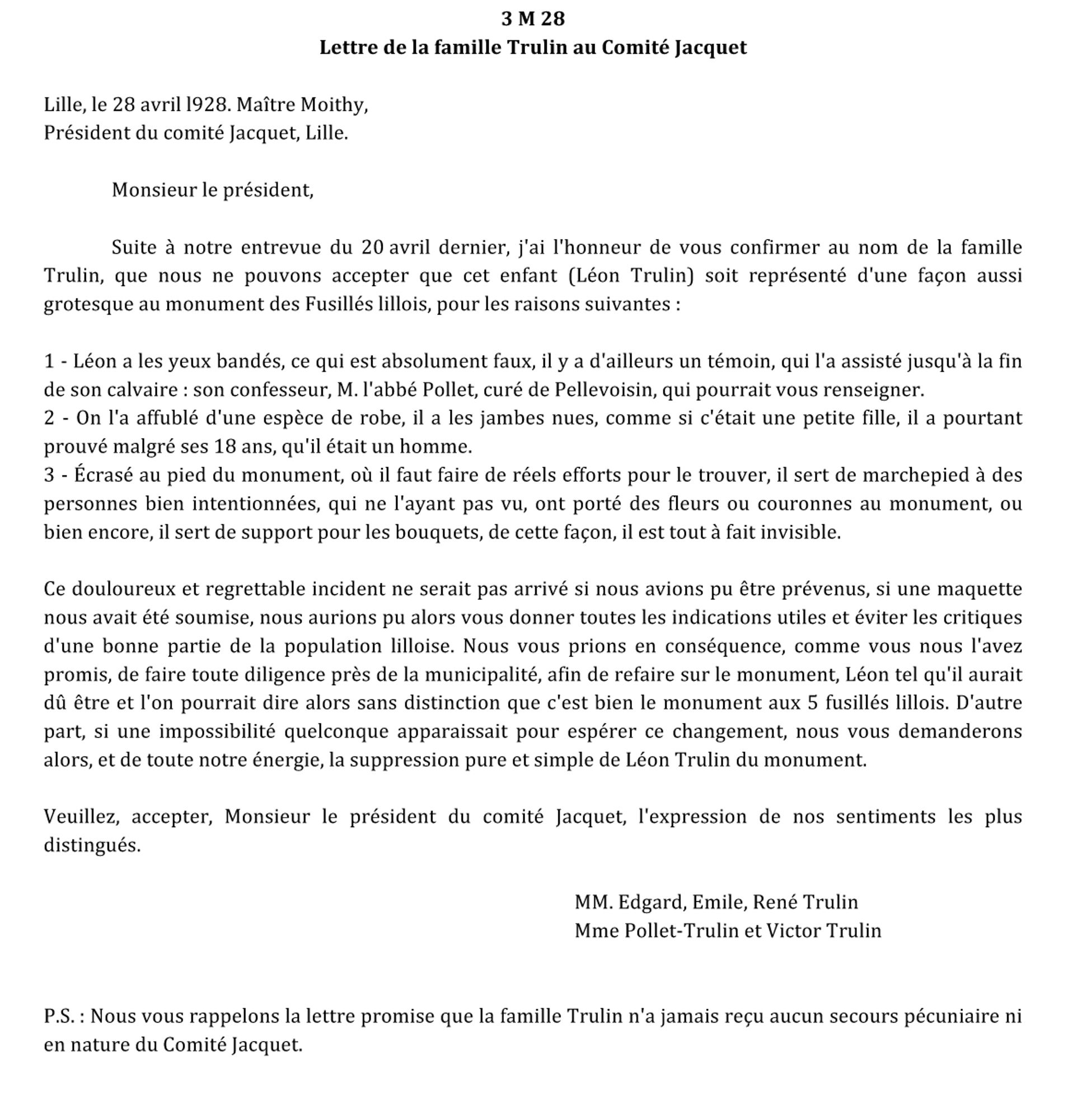 Suit à notre entrevue du 20 avril dernier, j'ai l'honneur de vous confirmer au nom de la famille Trulin, que nous ne pouvons accepter que cet enfant (Léon Trulin) soit représenté d'une façon aussi grotesque au monument des Fusillés lillois, pour les raisons suivantes :