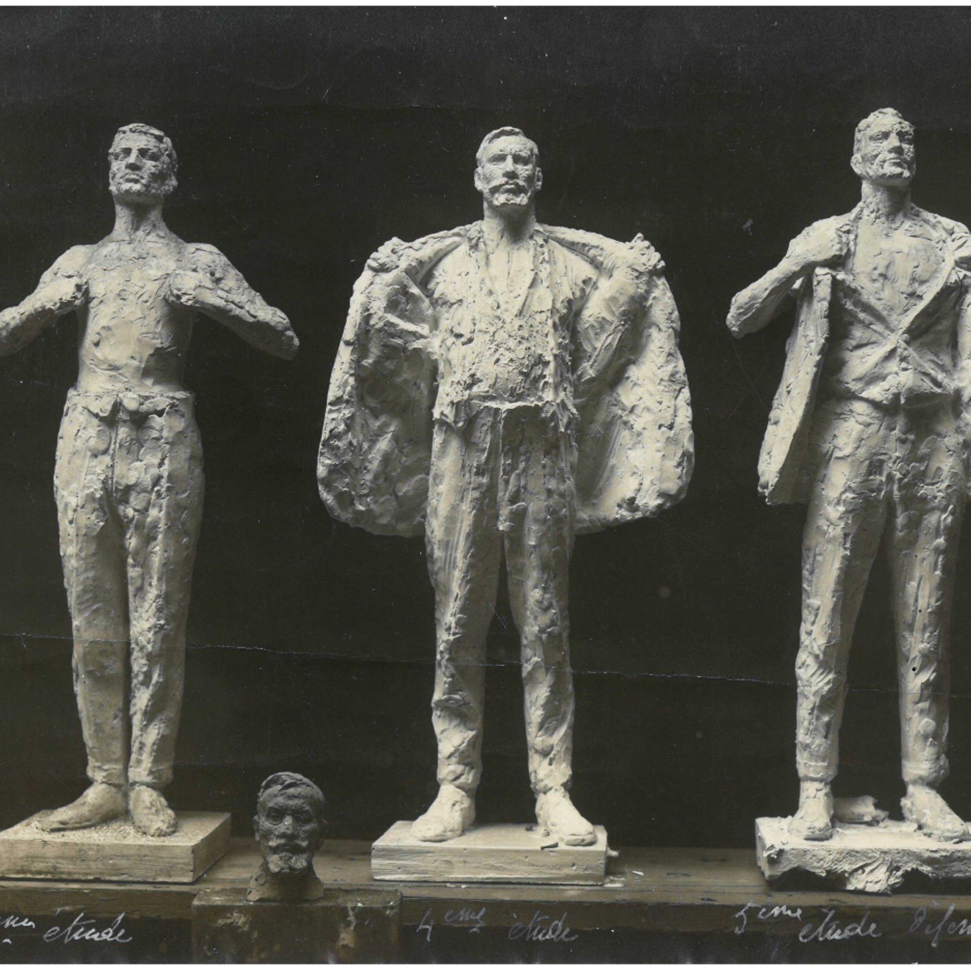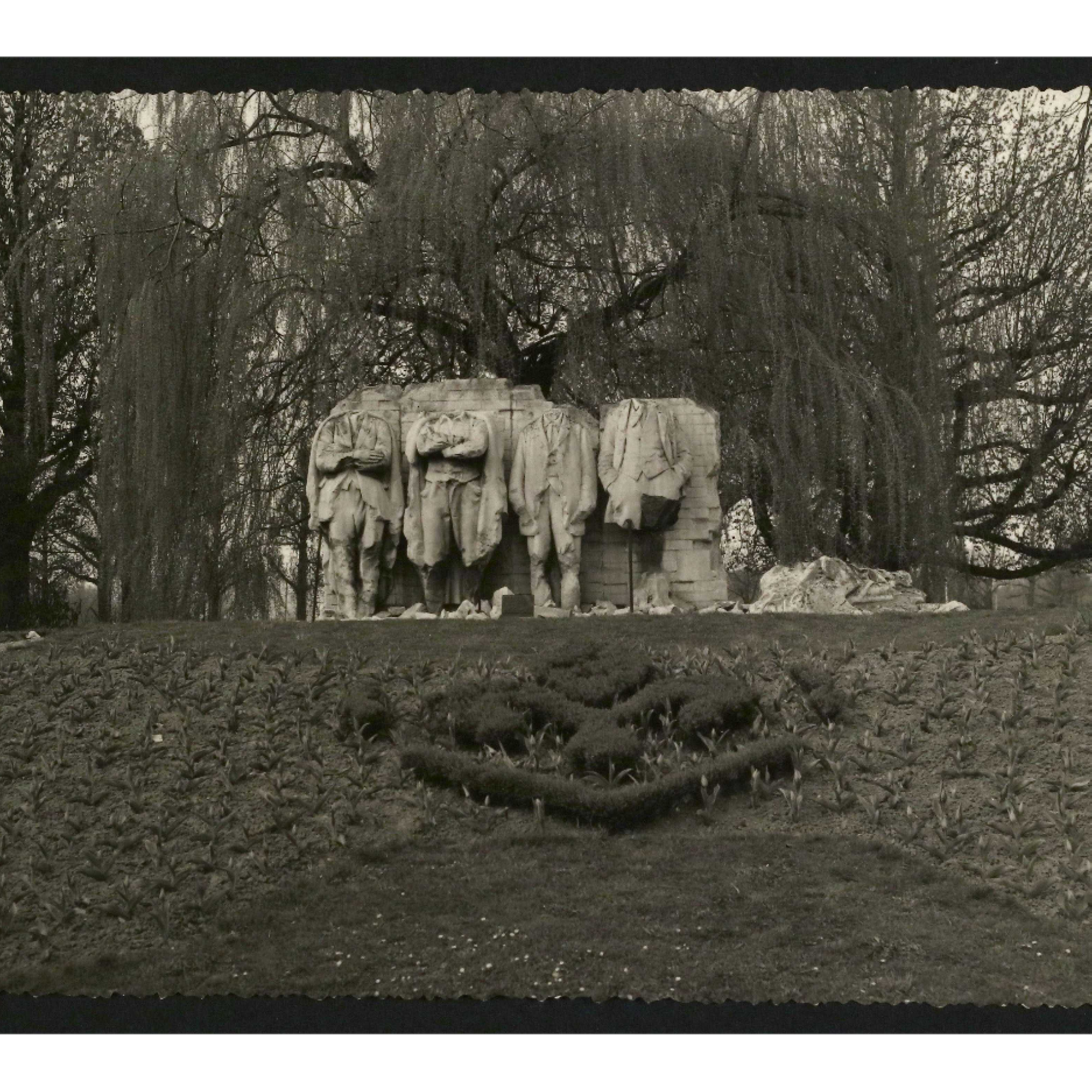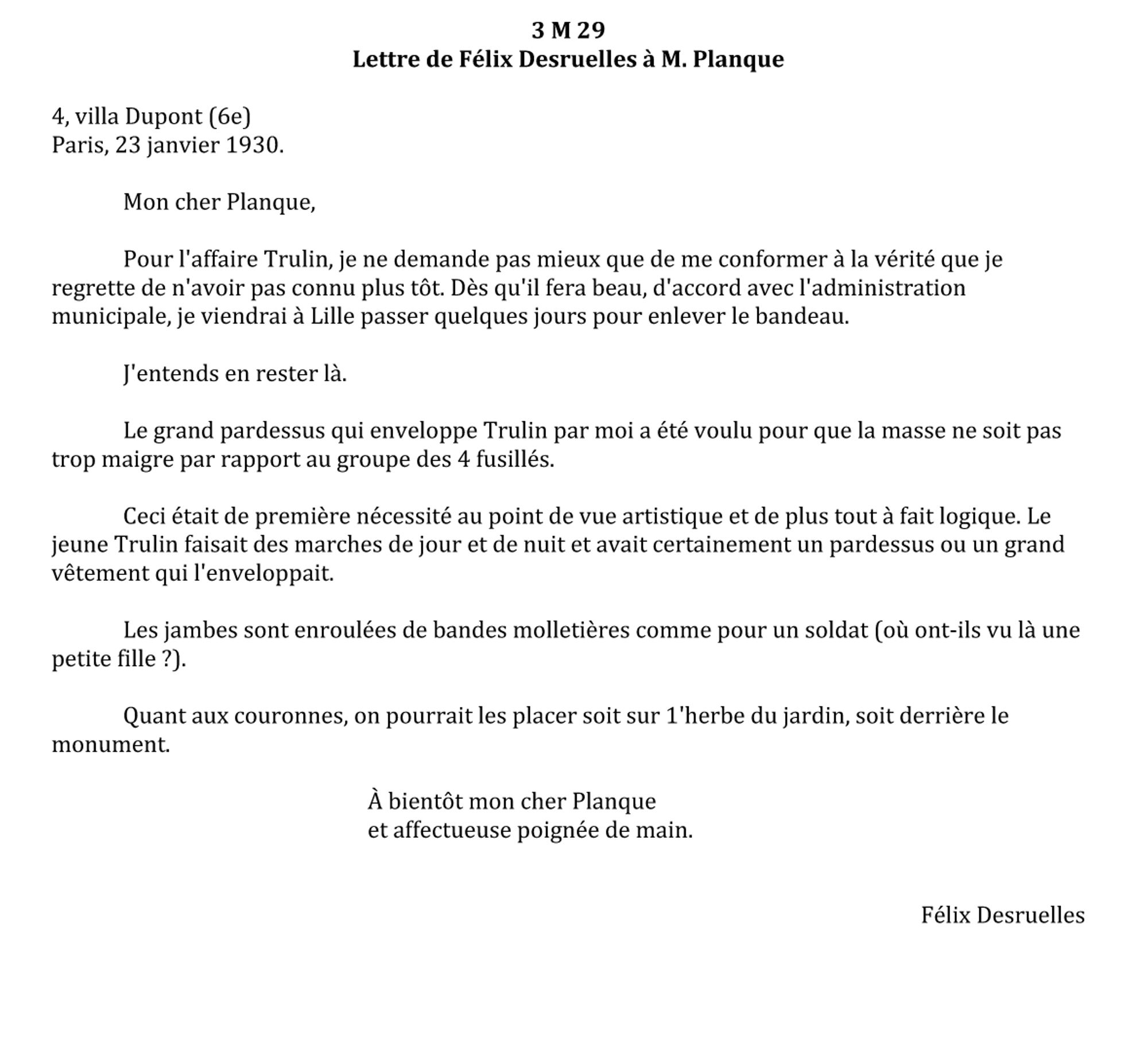 Dès qu'il fera beau, d'accord avec l'administration municipale, je viendrais à Lille passer quelques jours pour enlever le bandeau. J'entends en rester là Le grand pardessus qui enveloppe Trulin par moi a été voulu pour que la masse ne soit pas trop maigre par rapport au groupe des 4 fusillés. Ceci était de première nécessité au point de vue artistique et de plus tout à fait logique. Le jeune Trulin faisait des marches de jour et de nuit et avait certainement un pardessus ou un grand vêtement qui l'enveloppait Les jambes sont enroulées de bandes molletières comme pour un soldat (où ont-ils vu là une petite fille ?) Quant aux couronnes, on pourrait les placer soit sur l'herbe du jardin, soit derrière le monument