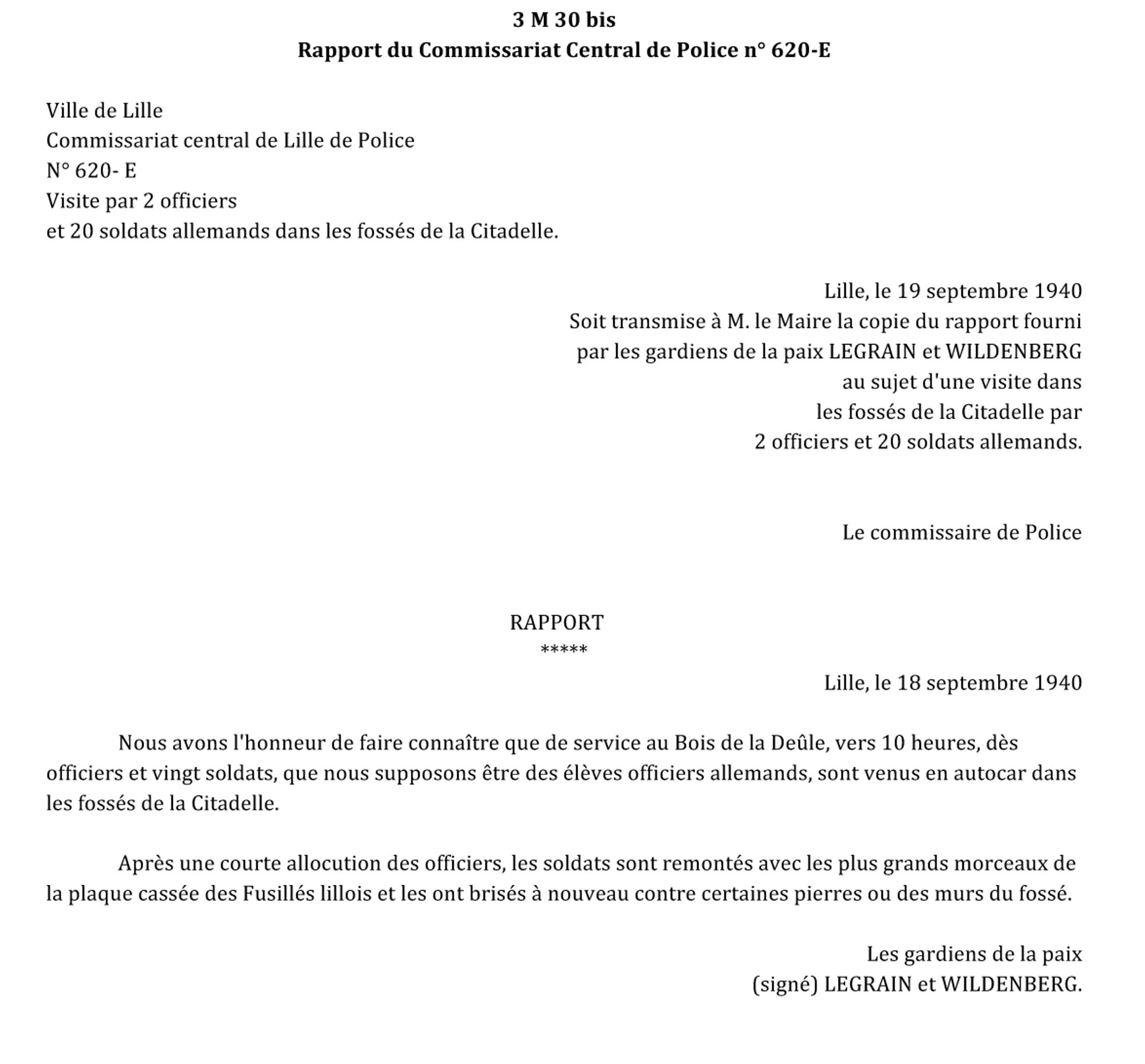 Nous avons l'honneur de faire connaître que de service au Bois de la Deûle, vers 10 heures, des officiers et vingt soldats, que nous supposons être des élèves officiers allemands, sont venus en autocar dans les fossés de la Citadelle