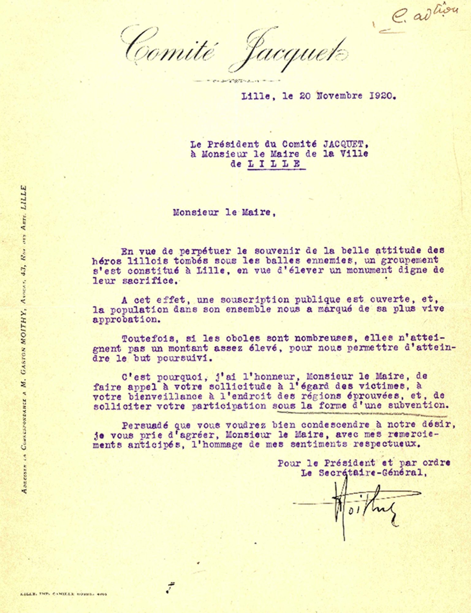 Lettre du Comité Jacquet adressé à la municipalité pour demander une subvention pour la réalisation d'un monument en l'honneur des fusillés lillois. 20 novembre 1920.