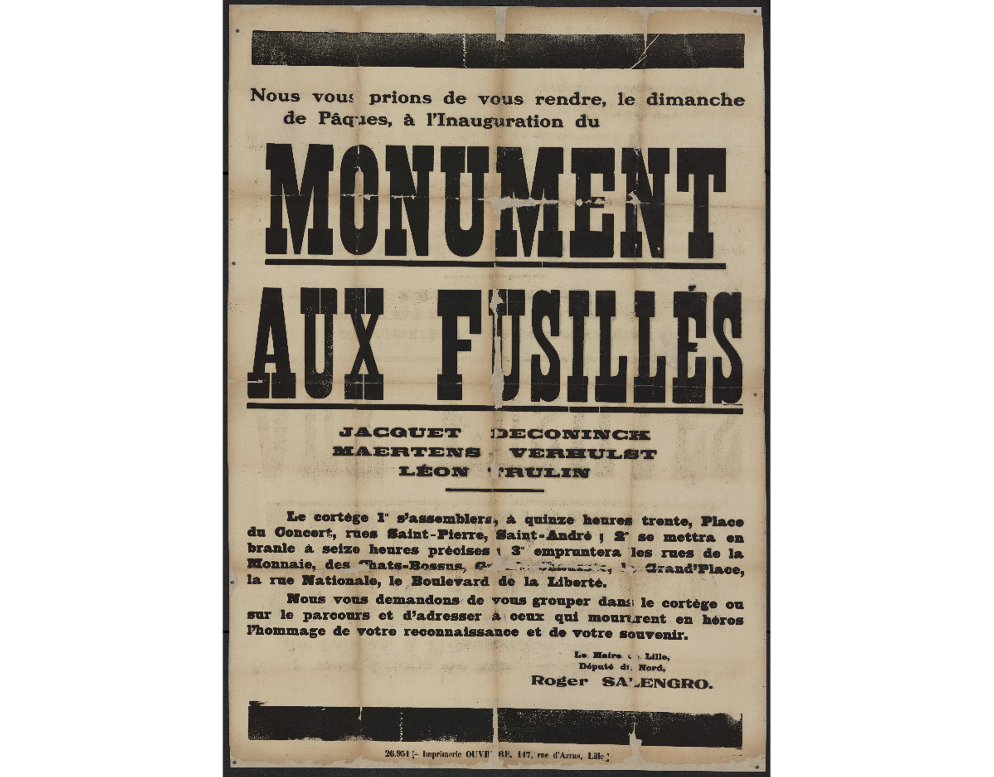 Illustration 1 : Affiche annonçant l'inauguration du monument aux fusillés. Archives municipales de Lille - 1M/2/31ter