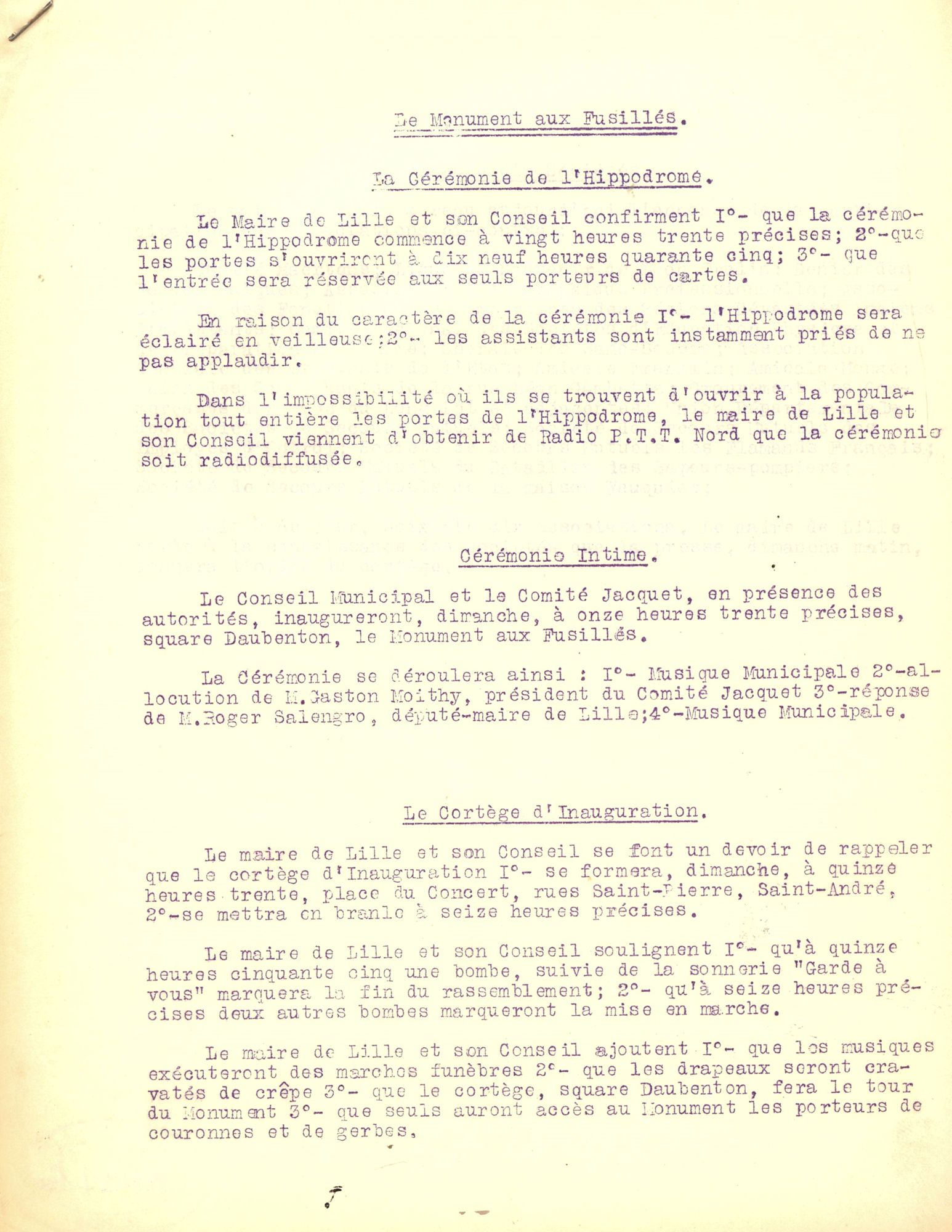 Illustration 2 : Programme de la cérémonie d'inauguration du monument aux fusillés en mars 1929. Archives municipales de Lille - 1M/2/31ter