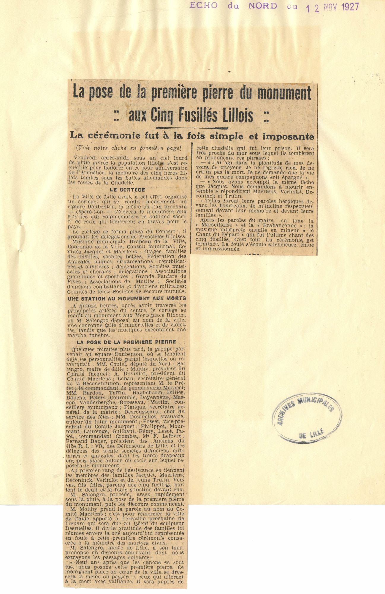 Toutes les personnalités de Lille s'empressèrent de lui offrir son appui moral. La ville décida d'organiser un concours pour l'érection du monument qui rendrait à la fois hommage aux morts de la Grande Guerre et aux 5 fusillés lillois.