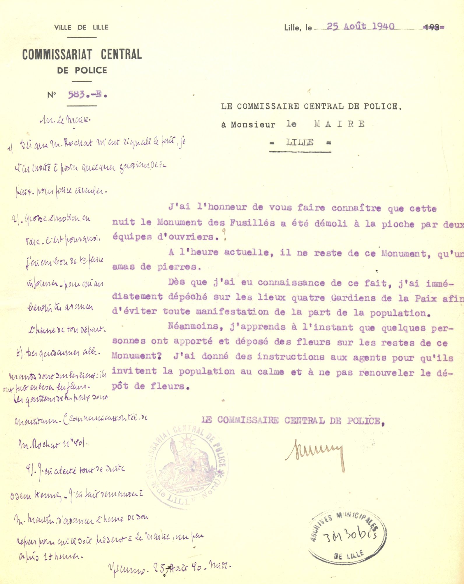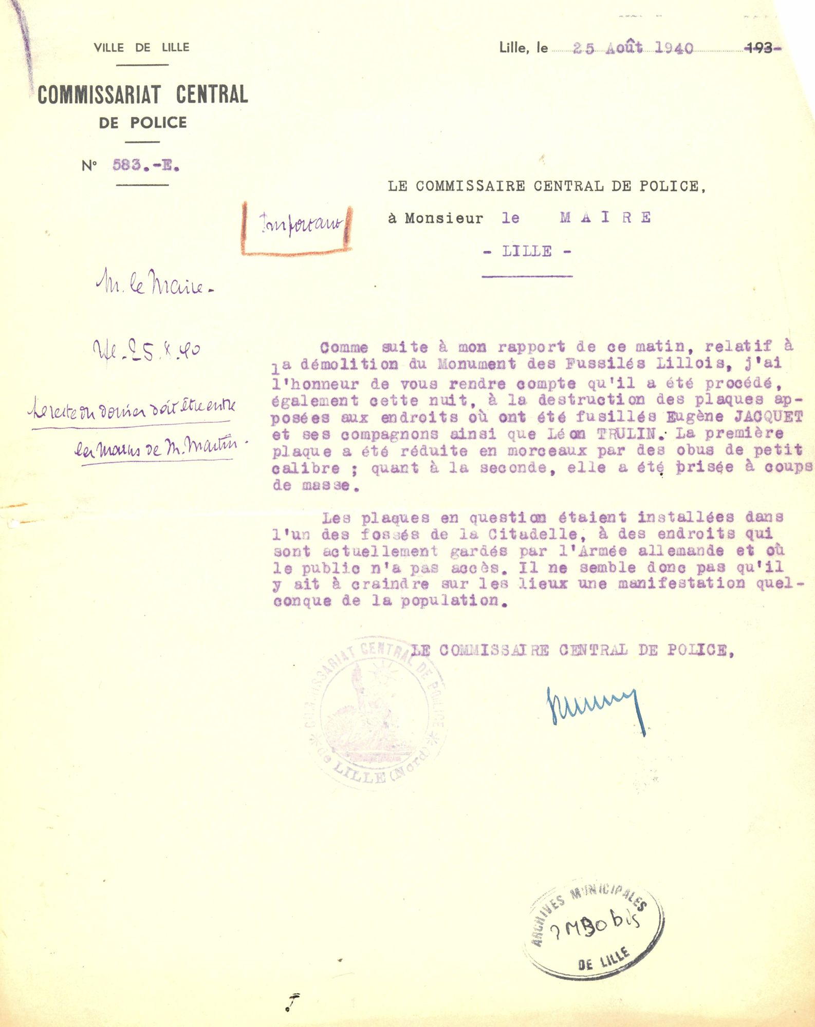Ill. 2 : Rapport du Commissariat central de Police adressé au Maire de Lille le 25 août 1940 au sujet de la destruction des plaques aux endroit où ont été fusillés les résistants dans les fossés de la citadelle. Archives municipales de Lille - 1M/2/30bis
