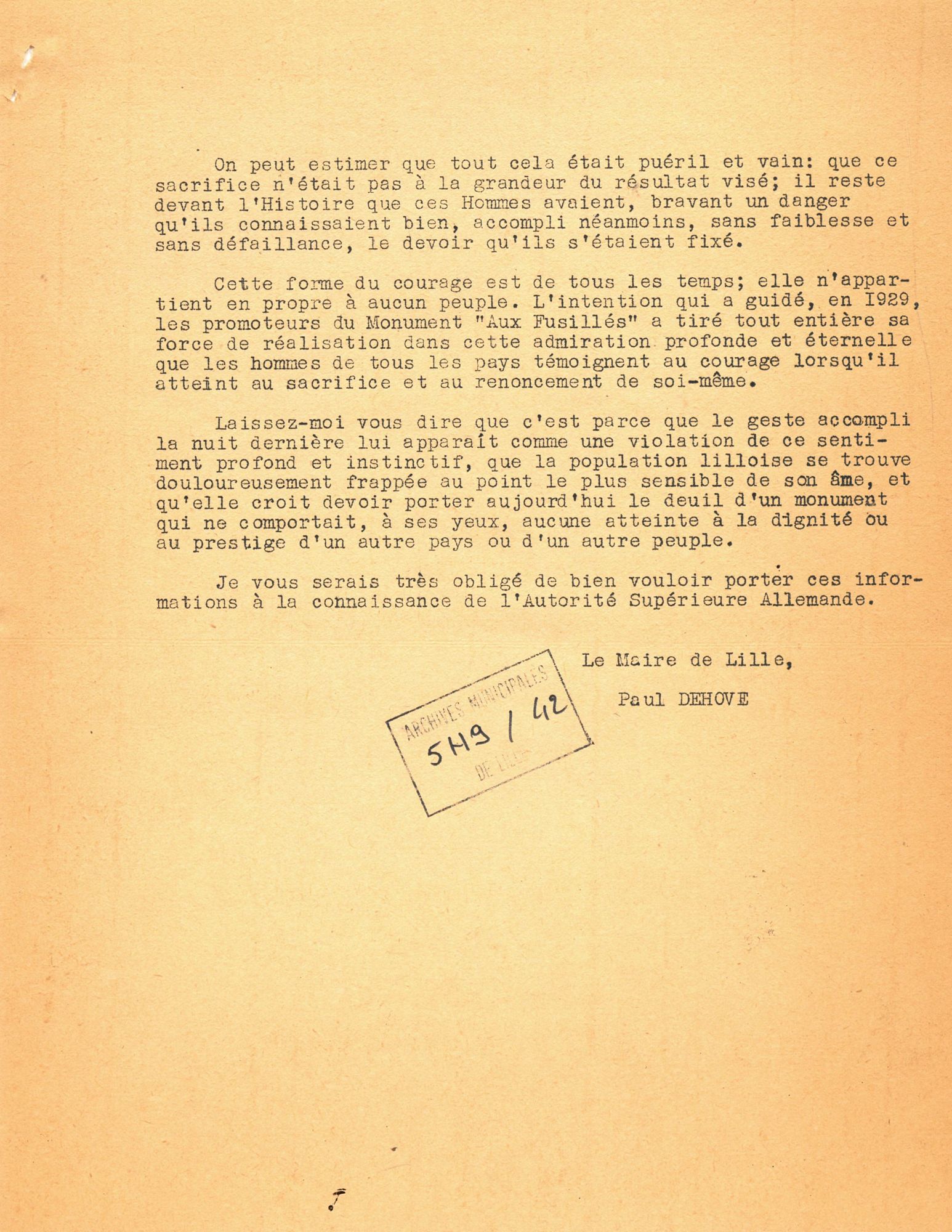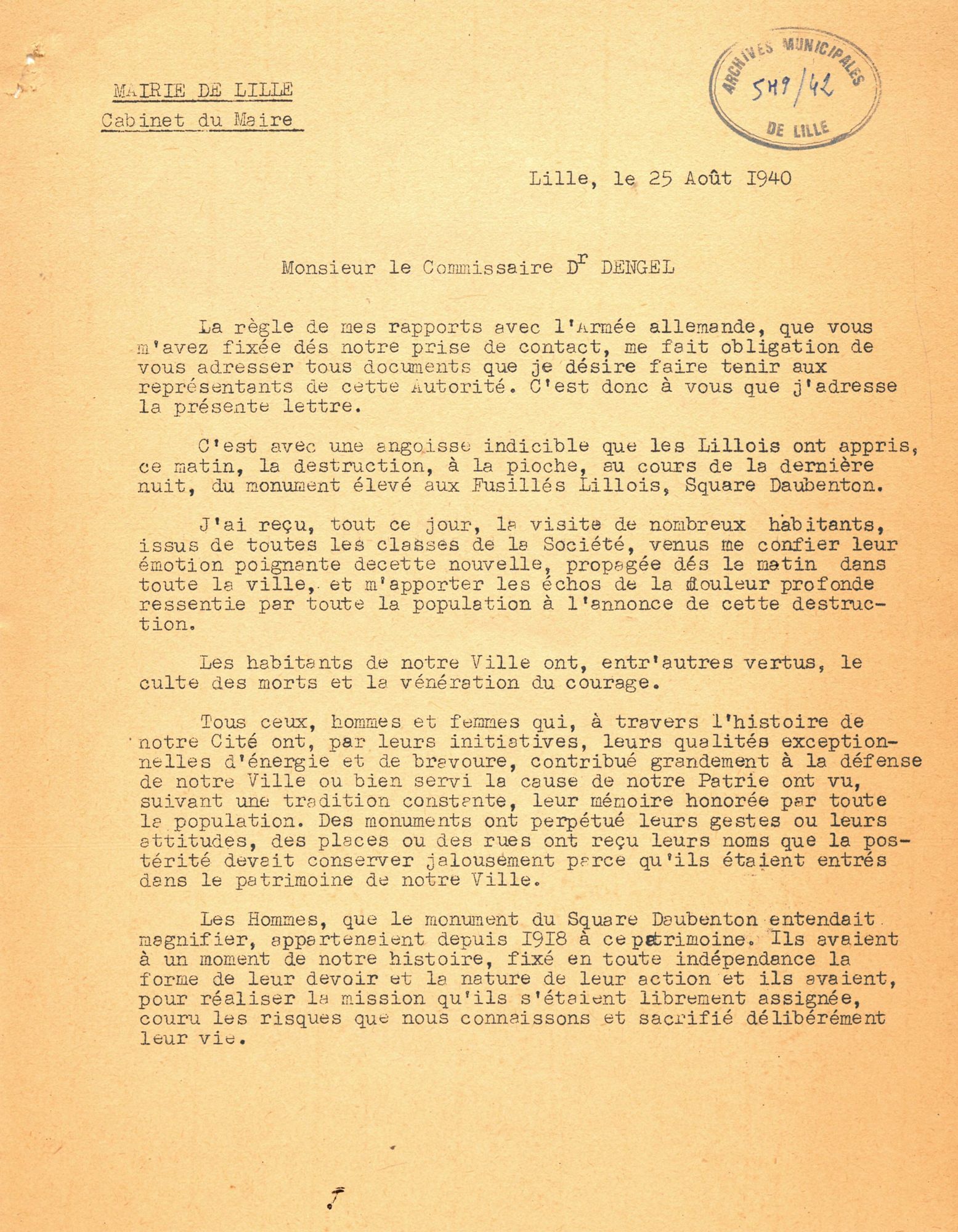 Lettre du Maire de Lille du 25 août 1940 au sujet de la destruction du monument aux fusillés pour transmission à l’autorité supérieure allemande.