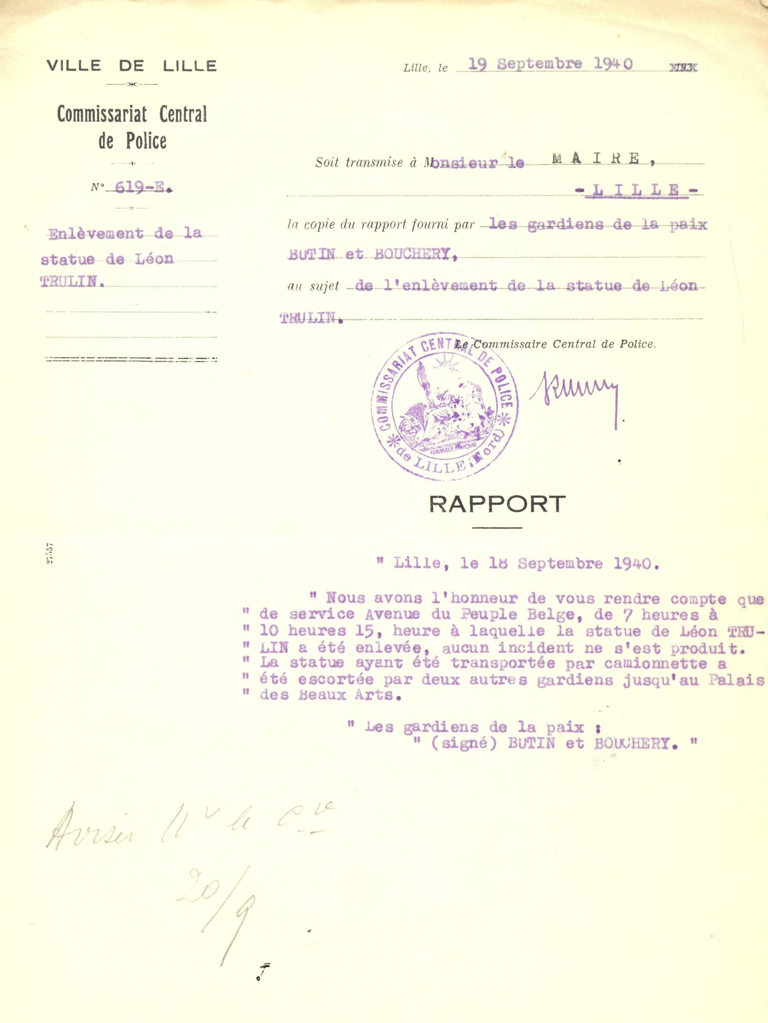 Rapport du Commissariat central de Police adressé au Maire de Lille relatif à l'enlèvement de la statue de Léon Trulin le 19 septembre 1940.