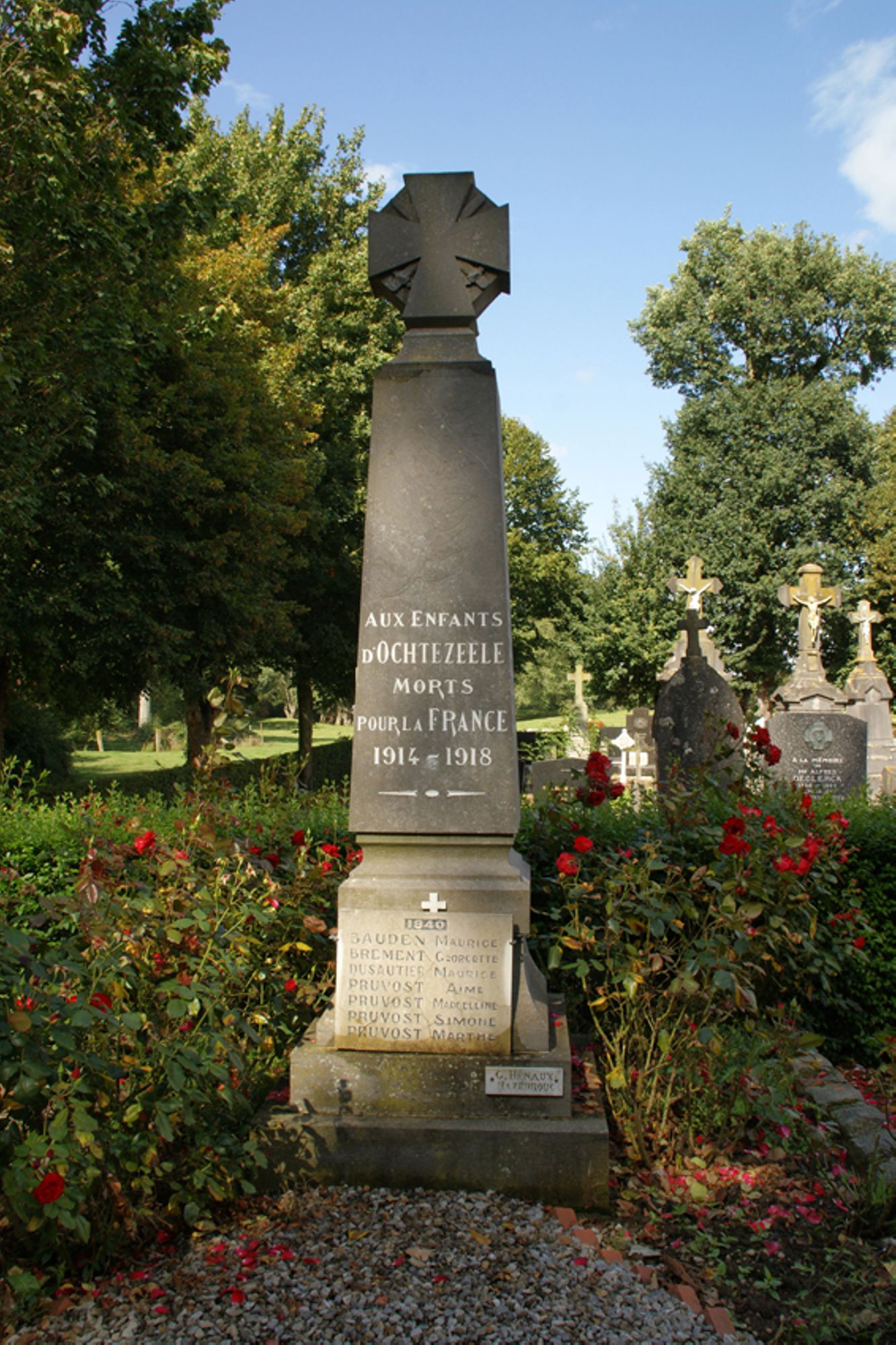 Deux anciens Combattants, dont un grand mutilé, font l'appel des morts ; la chorale exécute un chant patriotique ; les enfants des écoles et les délégués des sociétés déposent des gerbes de fleurs. M. Joseph Doutreland, maire de Noordpeene, et président de la musique, a déposé une magnifique gerbe de fleurs avec l'inscription suivante : « La Musique de Noordpeene à ses membres d'Ochtezeele tombés au champ d'honneur ».