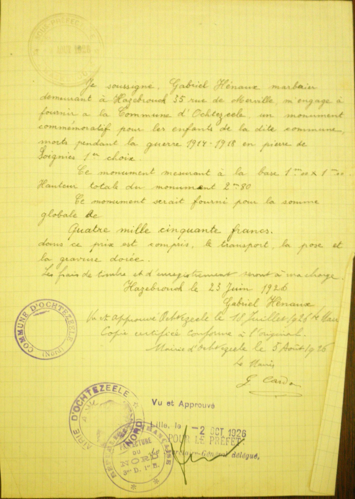 23 juin 1926 Engagement de Gabriel HÉNAUX, marbrier demeurant à Hazebrouck