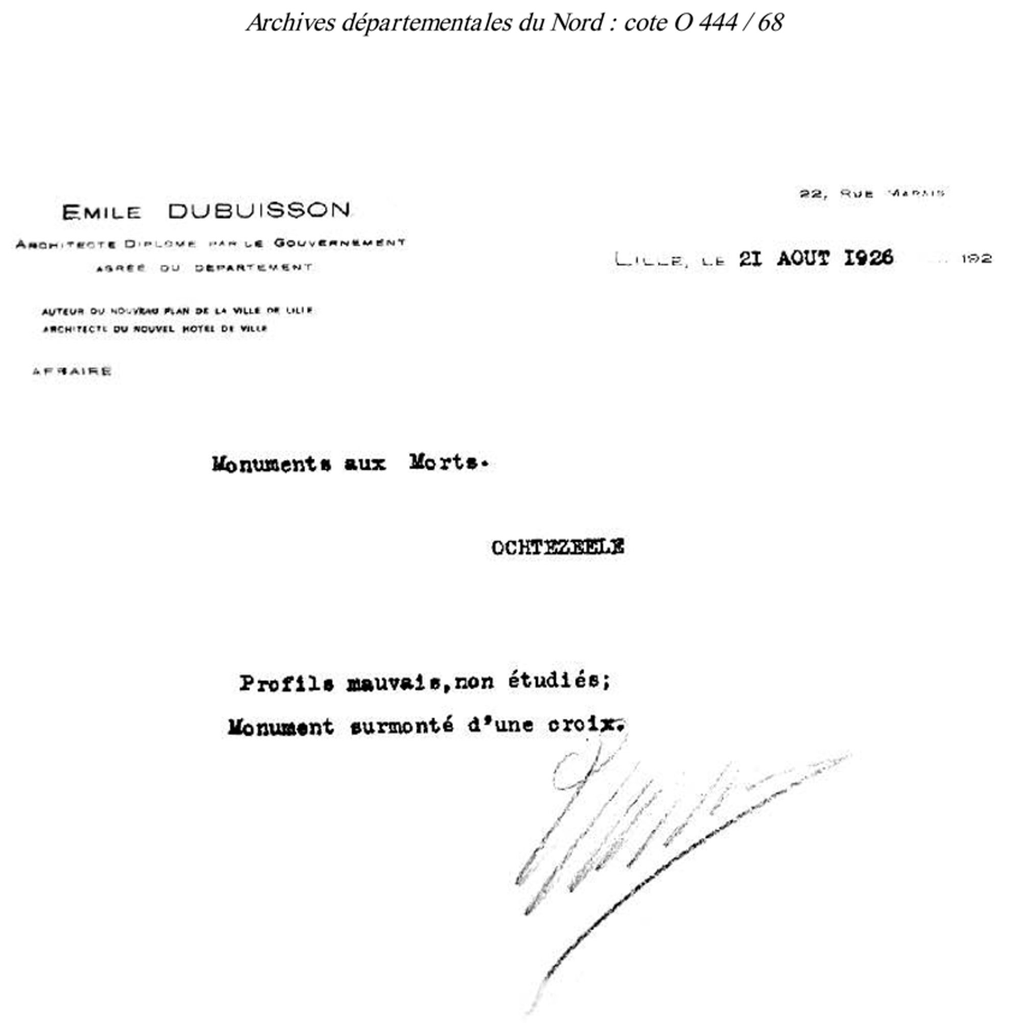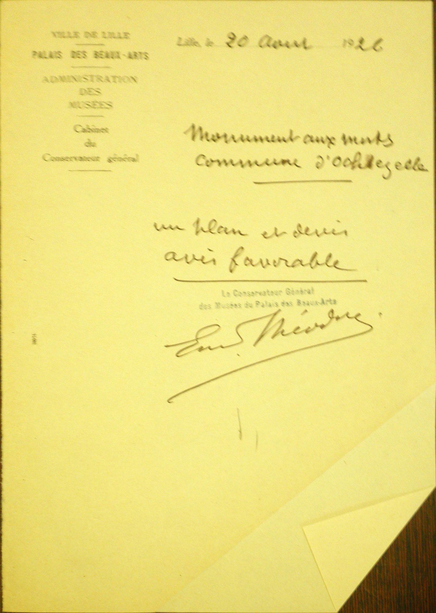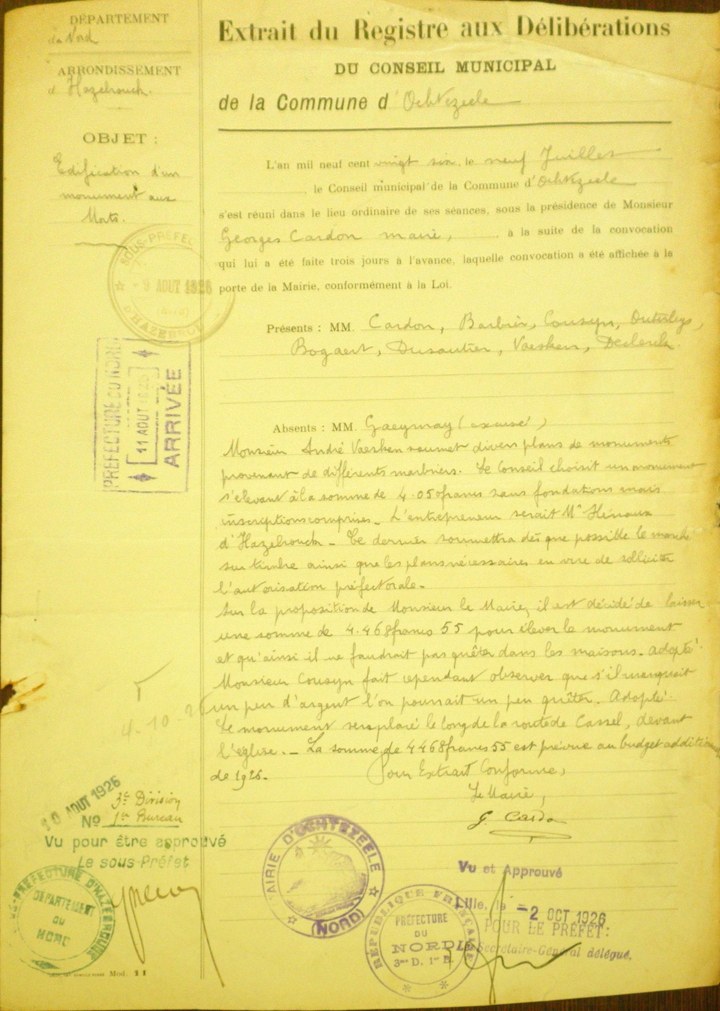 Monsieur le Maire soumet divers plans de monument. Le conseil chosit un monument s'élevant à la somme de 4050 francs sans fondation mais inscriptions comprises. L'entrepreneur serait Mr. Henaux à Hazebrouck.