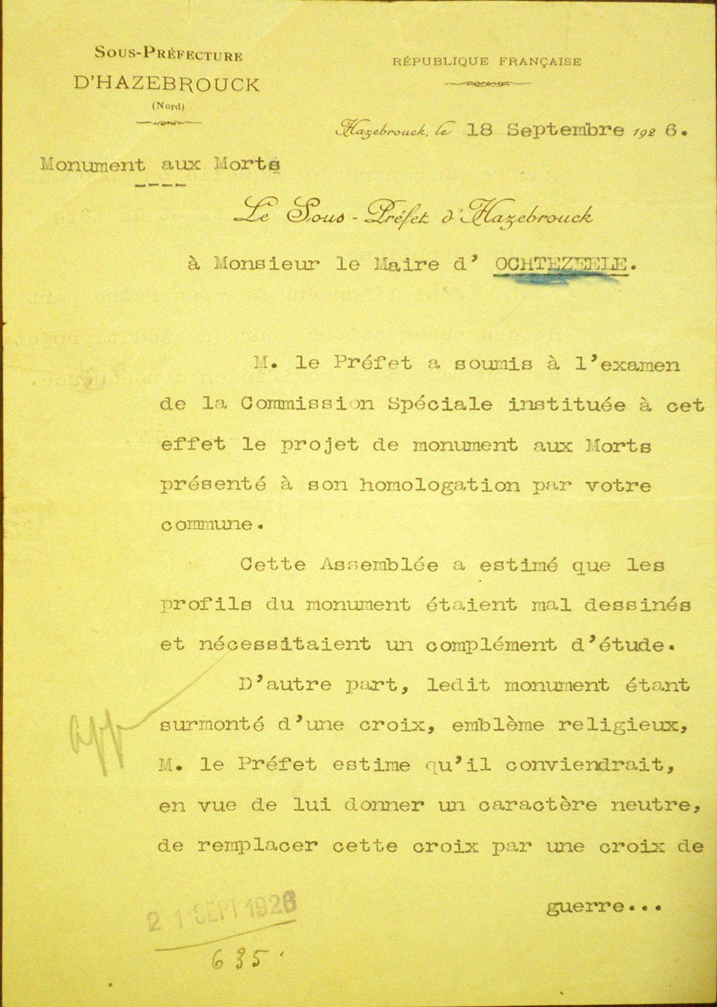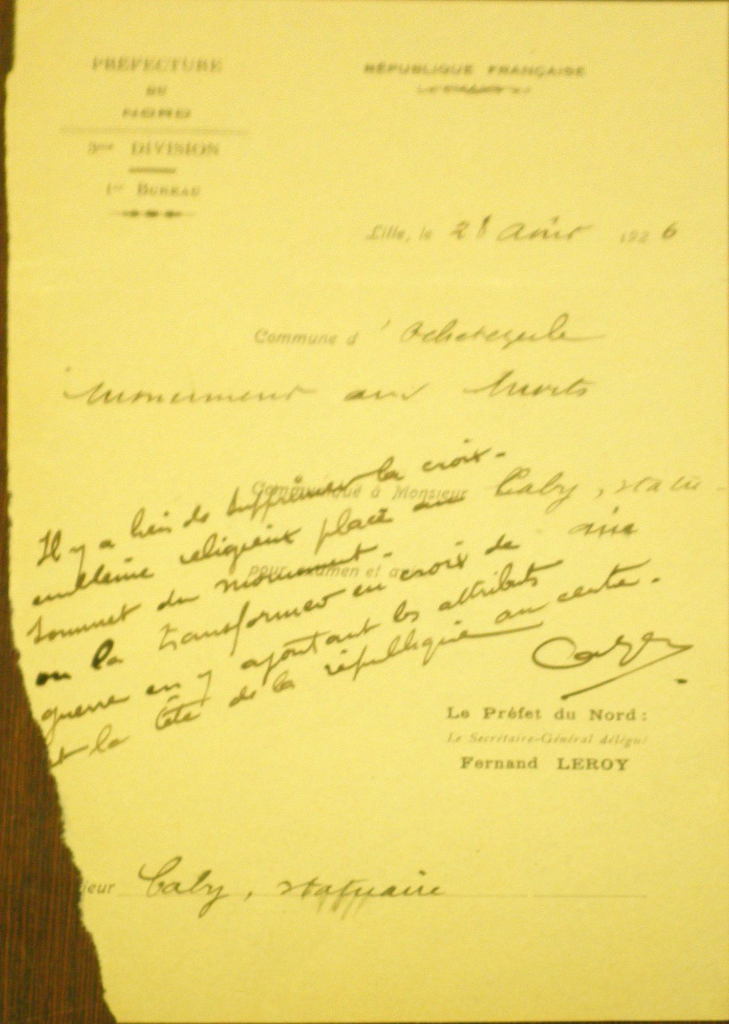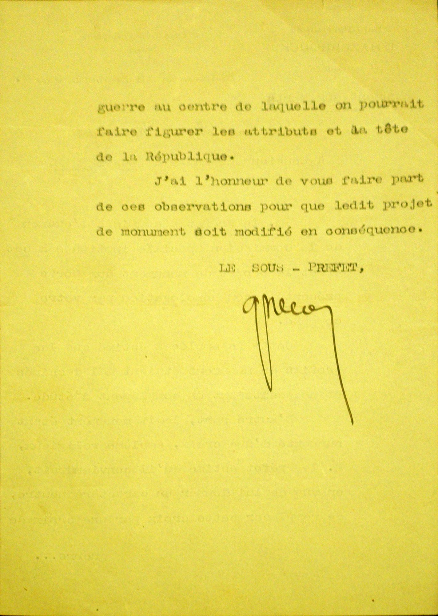 D'autre part, ledit monument étant surmonté d'une croix, emblème religieux, M. le Préfet estime qu'il conviendrait, en vue de lui donner un caractère neutre, de remplacer cette croix par une croix de guerre au centre de laquelle on pourrait faire figurer les attributs et la tête de la République