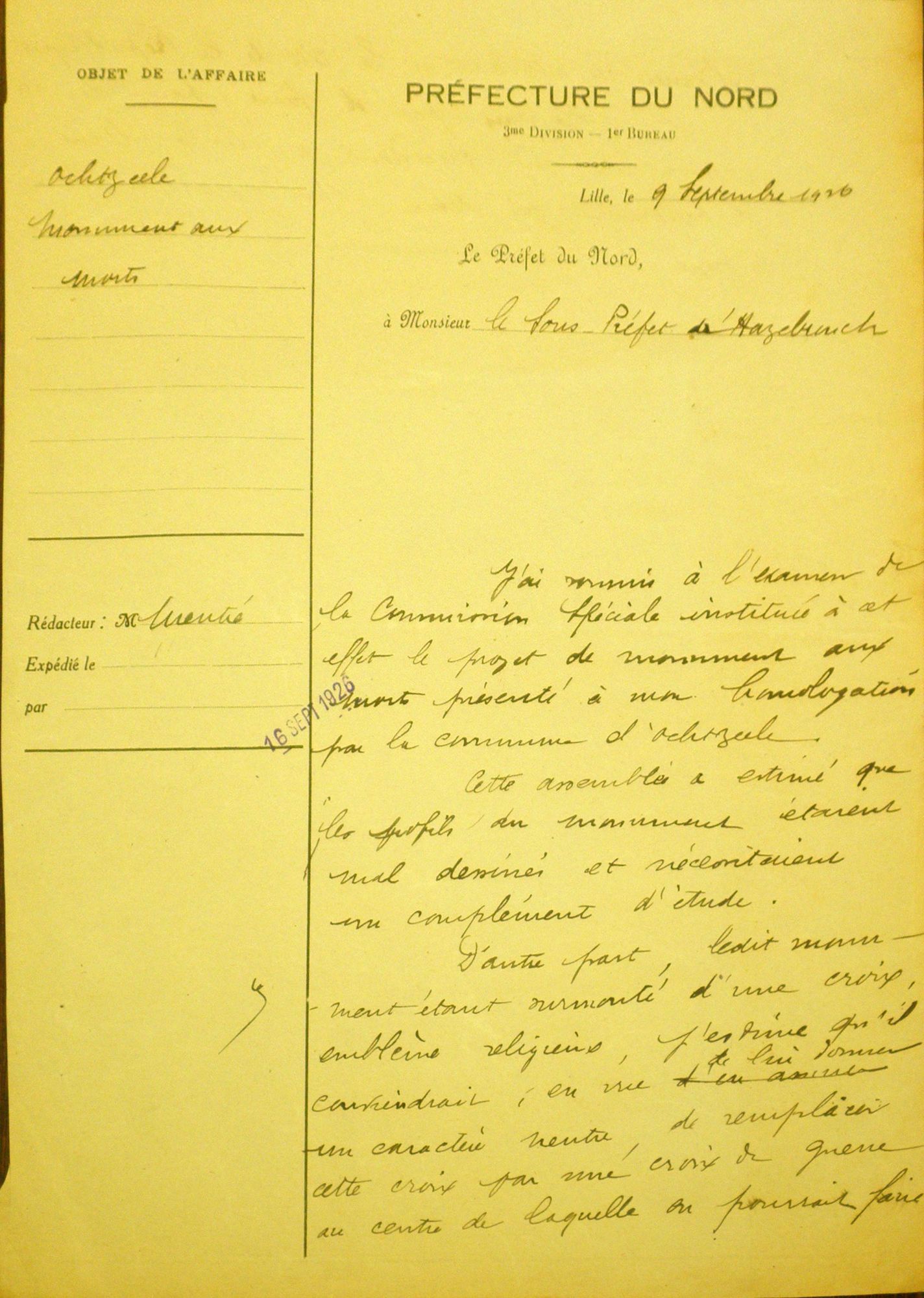 D'autre part, ledit monument étant surmonté d'une croix, emblème religieux, j'estime qu'il conviendrait, en vue de lui donner un caractère neutre, de remplacer cette croix par une croix de guerre au centre de laquelle on pourrait faire ...