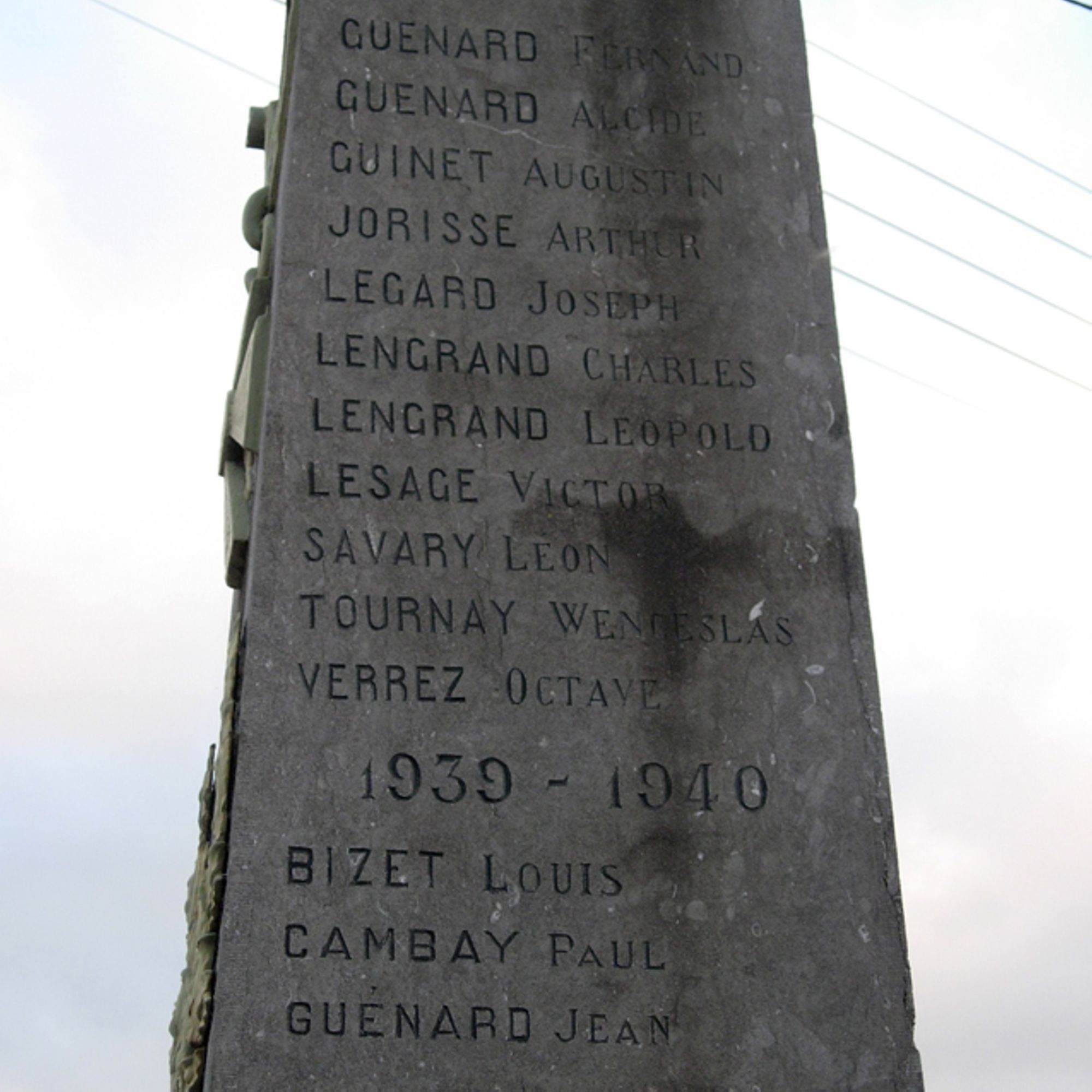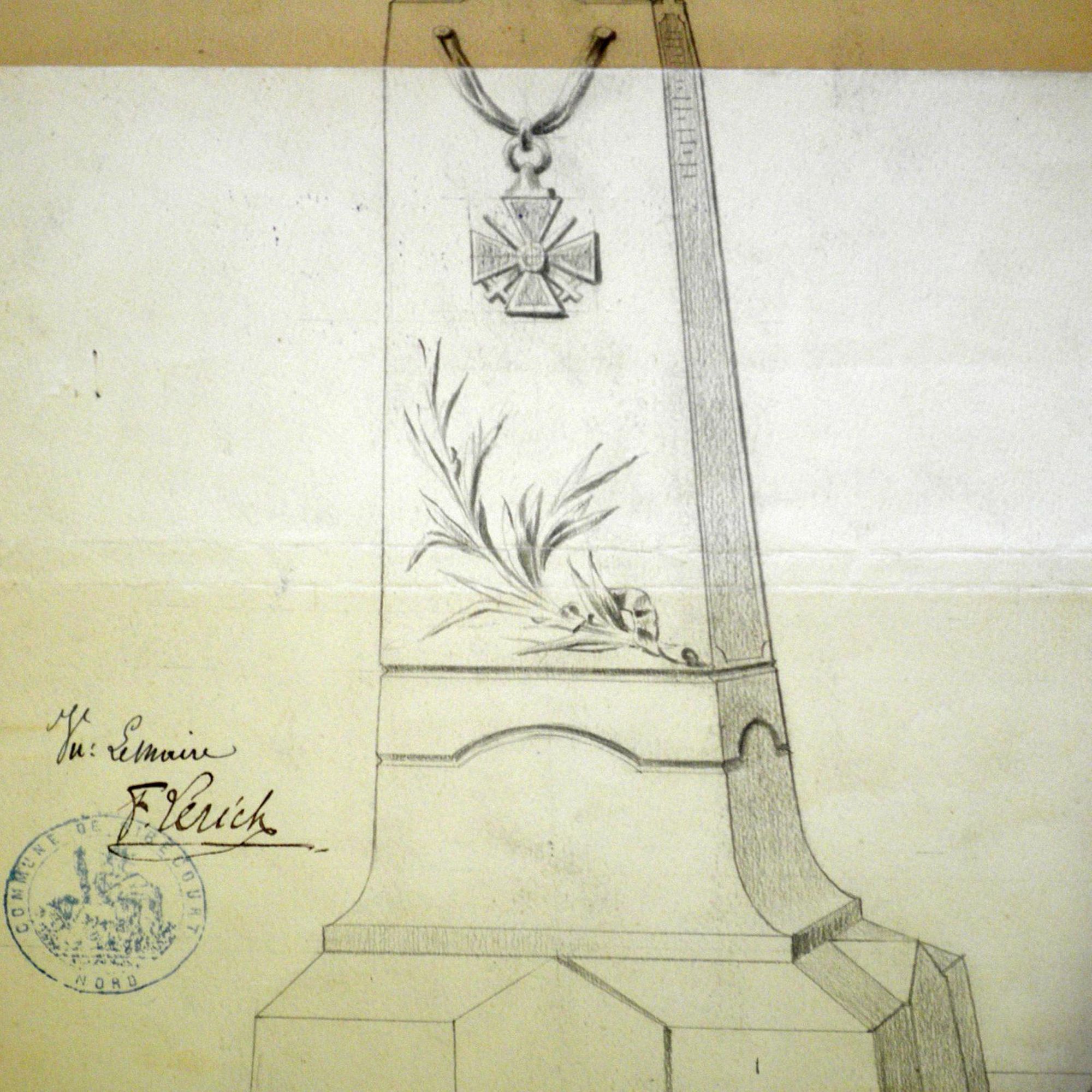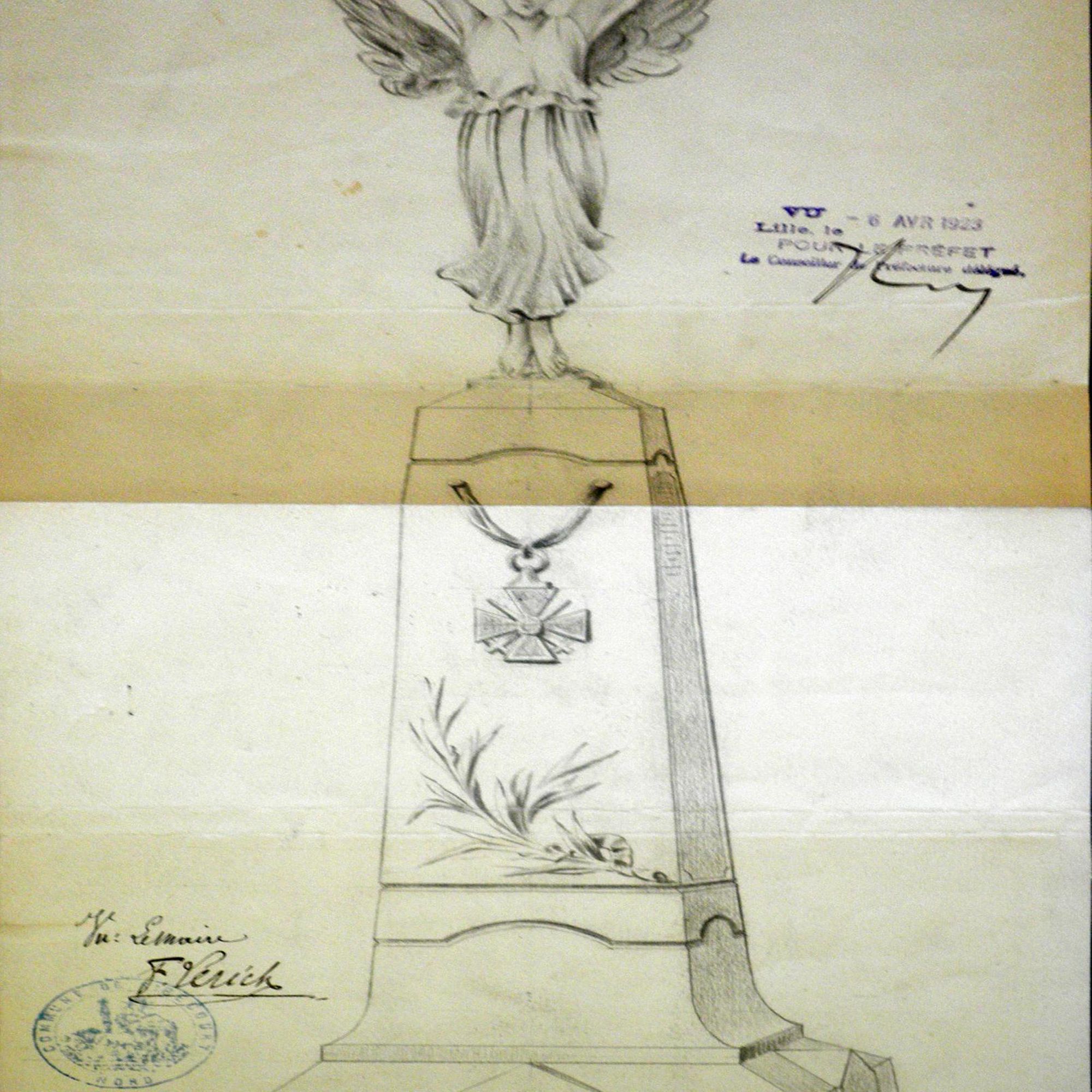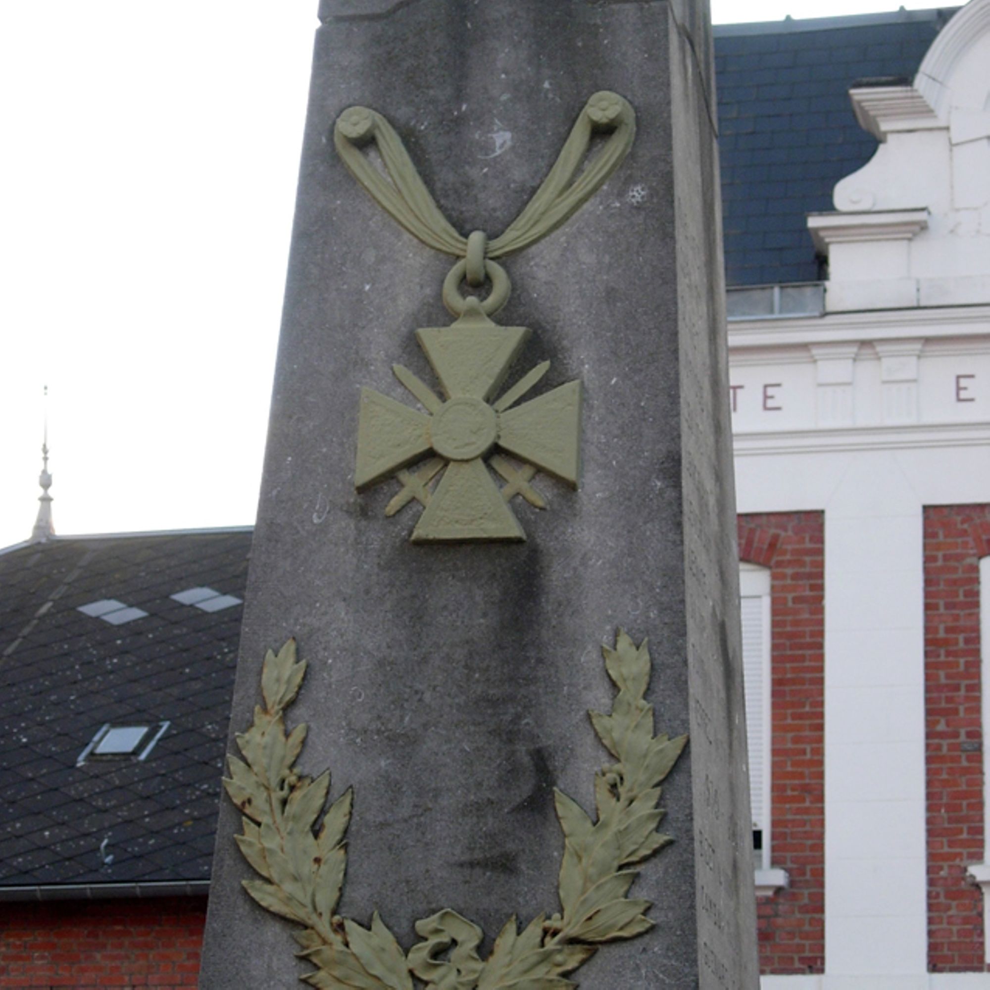 - Obélisque court supportant un ange aux ailes déployées. Cet ange prend appui sur ses deux pieds, sa robe, tombant jusqu'aux chevilles, est ceinturée à la taille. Très moulante, elle meurt en plis nombreux et lourds sur les hanches, et glisse en longs plissés le long des jambes. L'ange lève les bras vers le ciel, portant aux nues une couronne de lauriers. L'obélisque est décoré d'une croix de guerre et de lauriers