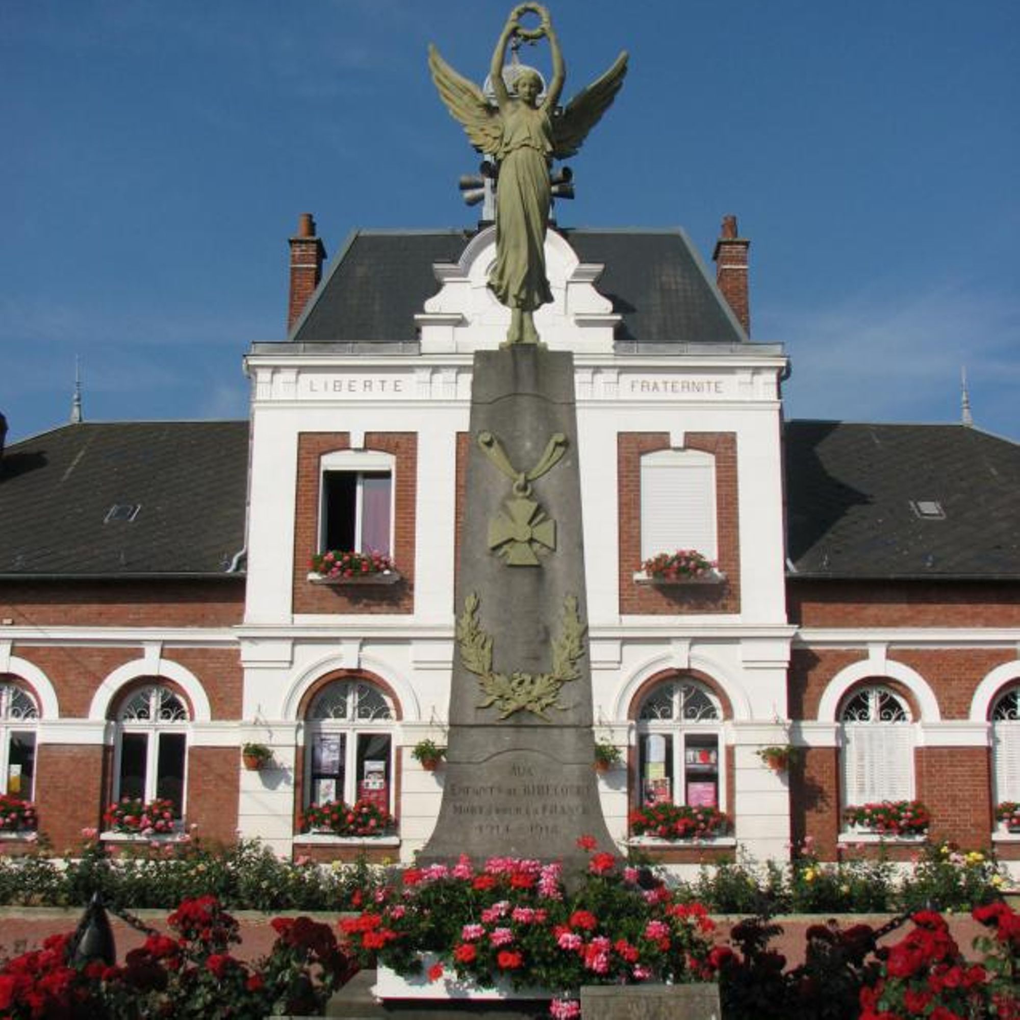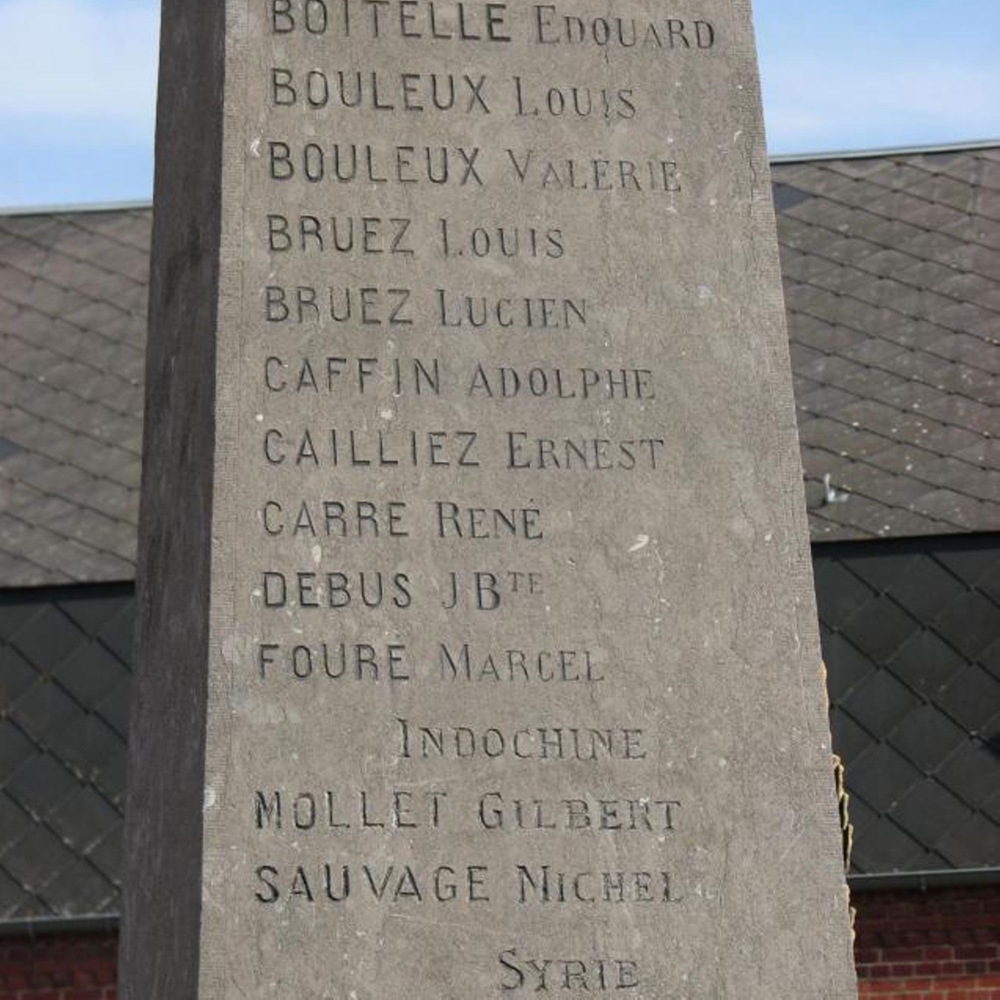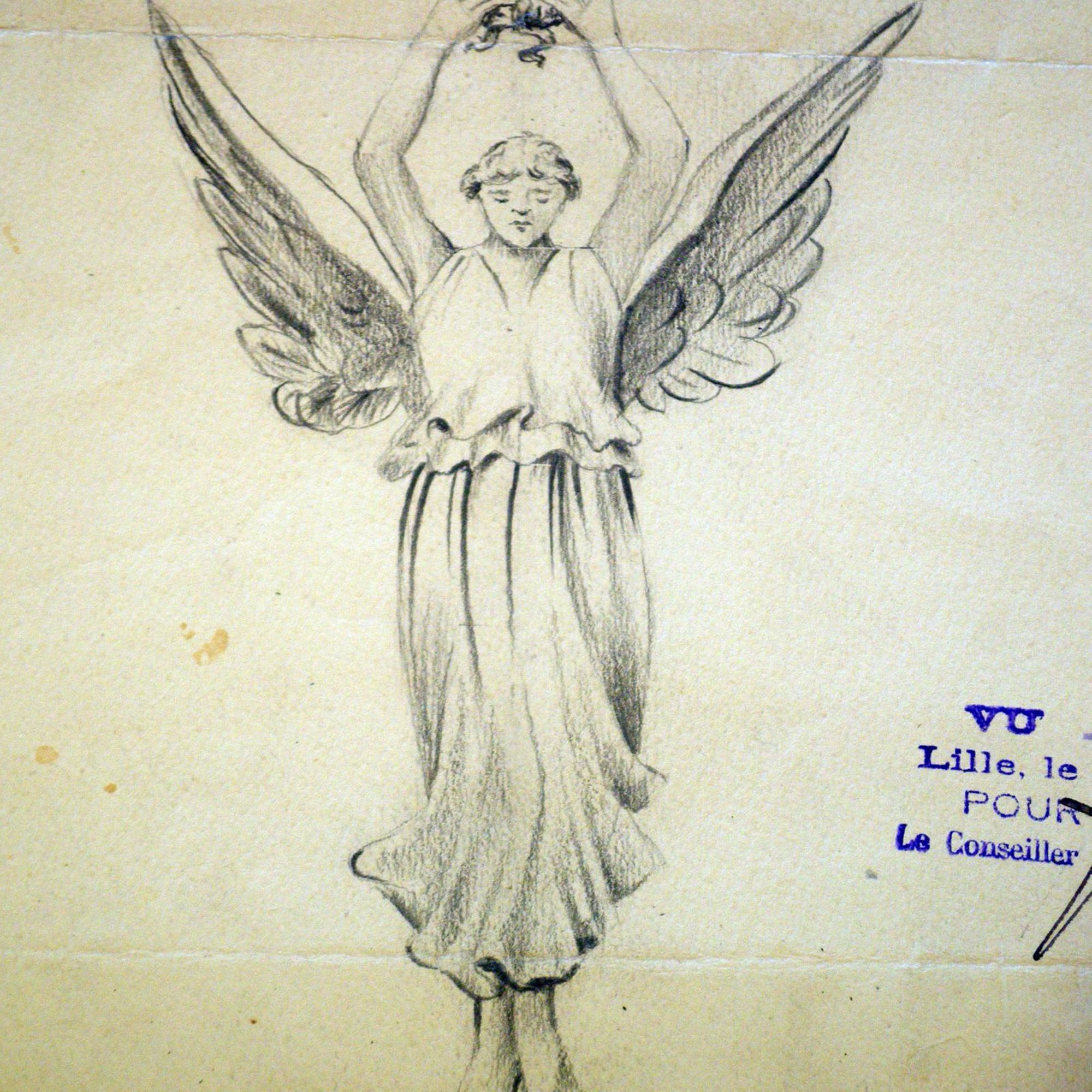 - Obélisque court supportant un ange aux ailes déployées. Cet ange prend appui sur ses deux pieds, sa robe, tombant jusqu'aux chevilles, est ceinturée à la taille. Très moulante, elle meurt en plis nombreux et lourds sur les hanches, et glisse en longs plissés le long des jambes. L'ange lève les bras vers le ciel, portant aux nues une couronne de lauriers. L'obélisque est décoré d'une croix de guerre et de lauriers
