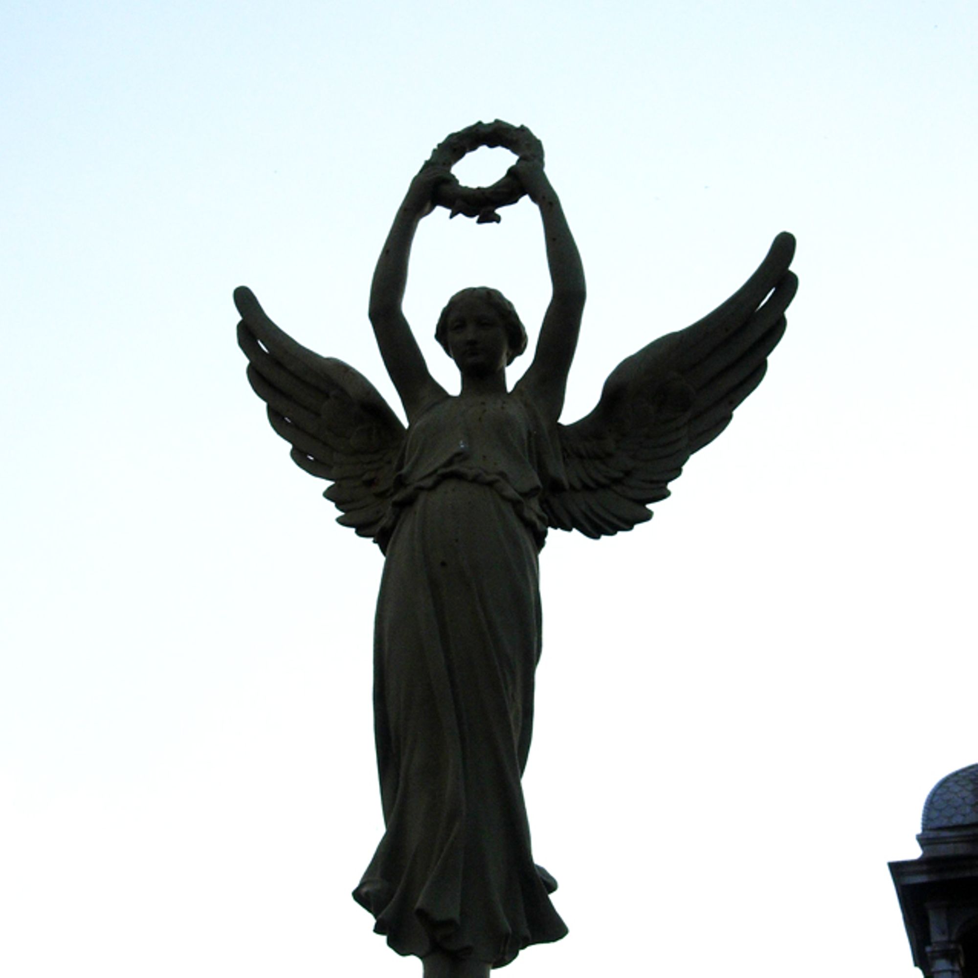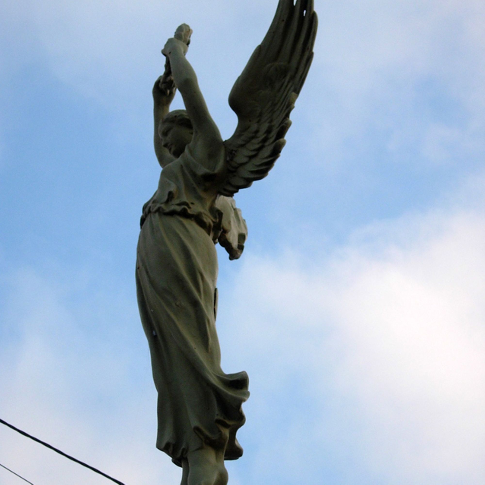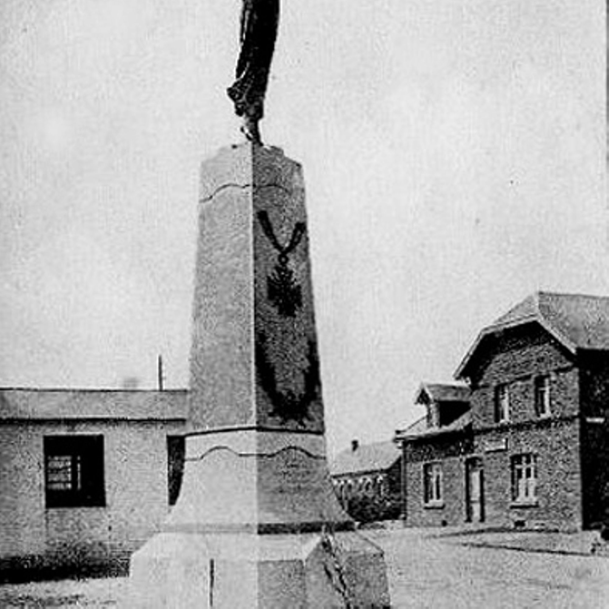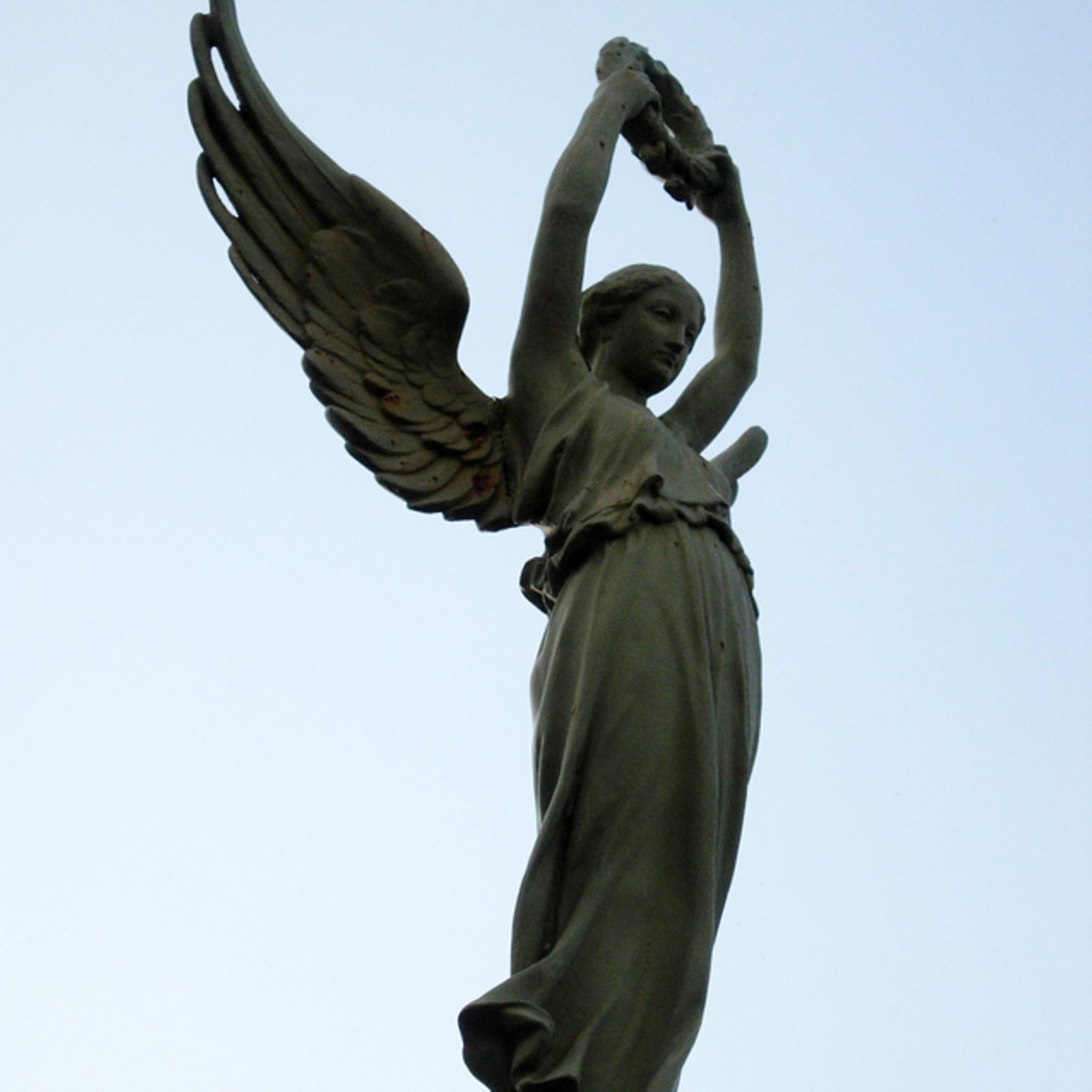 - Obélisque court supportant un ange aux ailes déployées. Cet ange prend appui sur ses deux pieds, sa robe, tombant jusqu'aux chevilles, est ceinturée à la taille. Très moulante, elle meurt en plis nombreux et lourds sur les hanches, et glisse en longs plissés le long des jambes. L'ange lève les bras vers le ciel, portant aux nues une couronne de lauriers. L'obélisque est décoré d'une croix de guerre et de lauriers